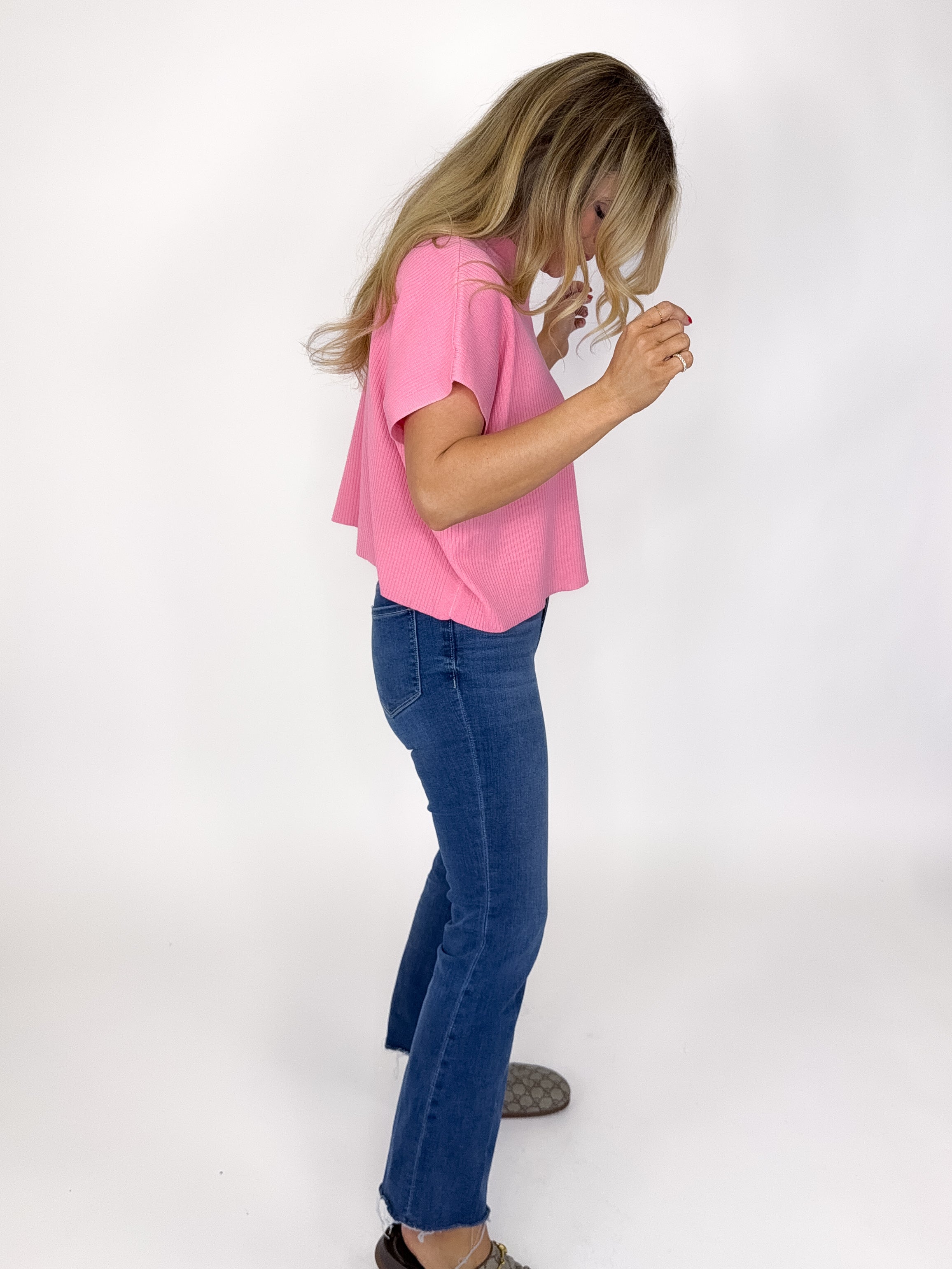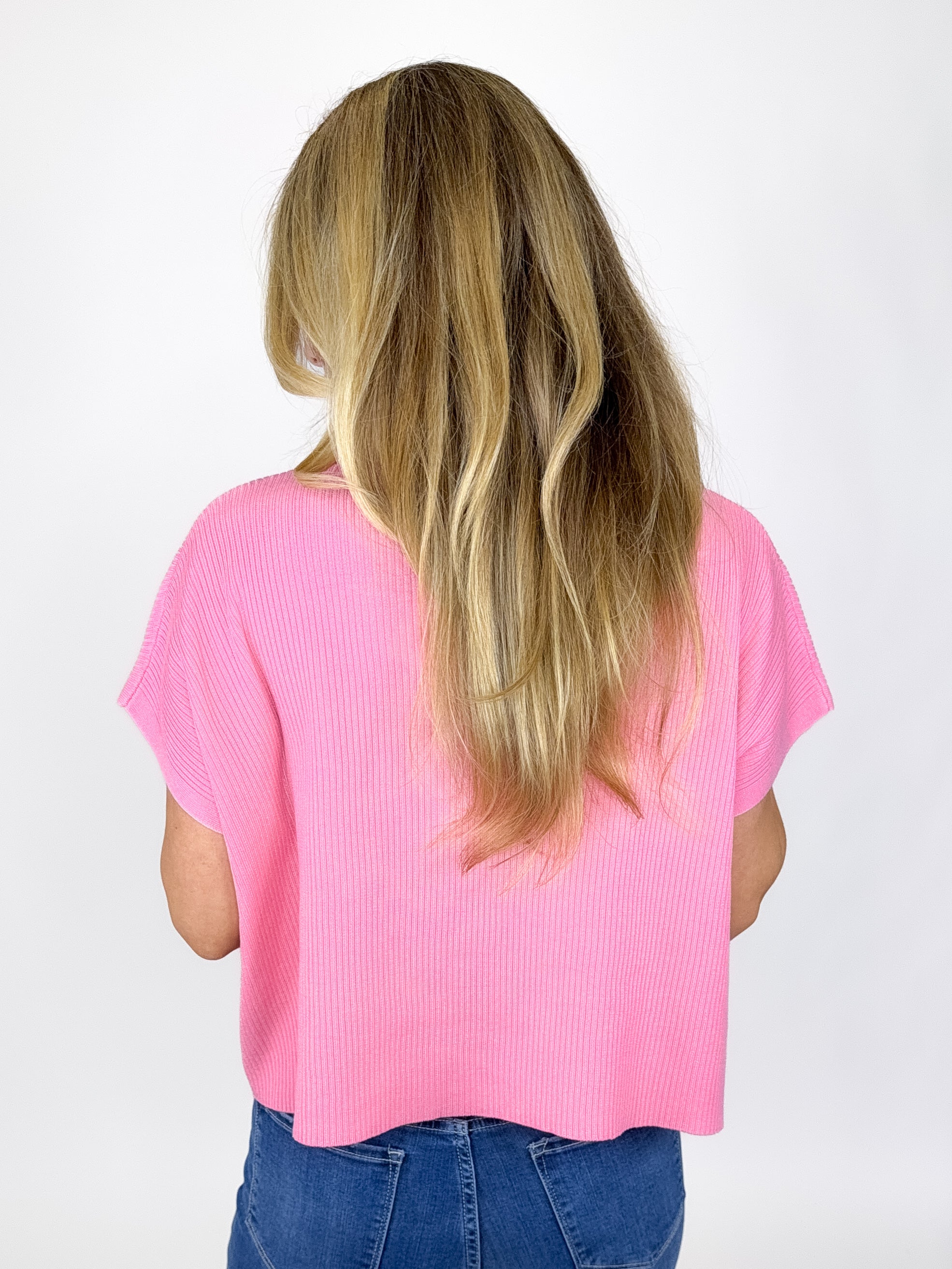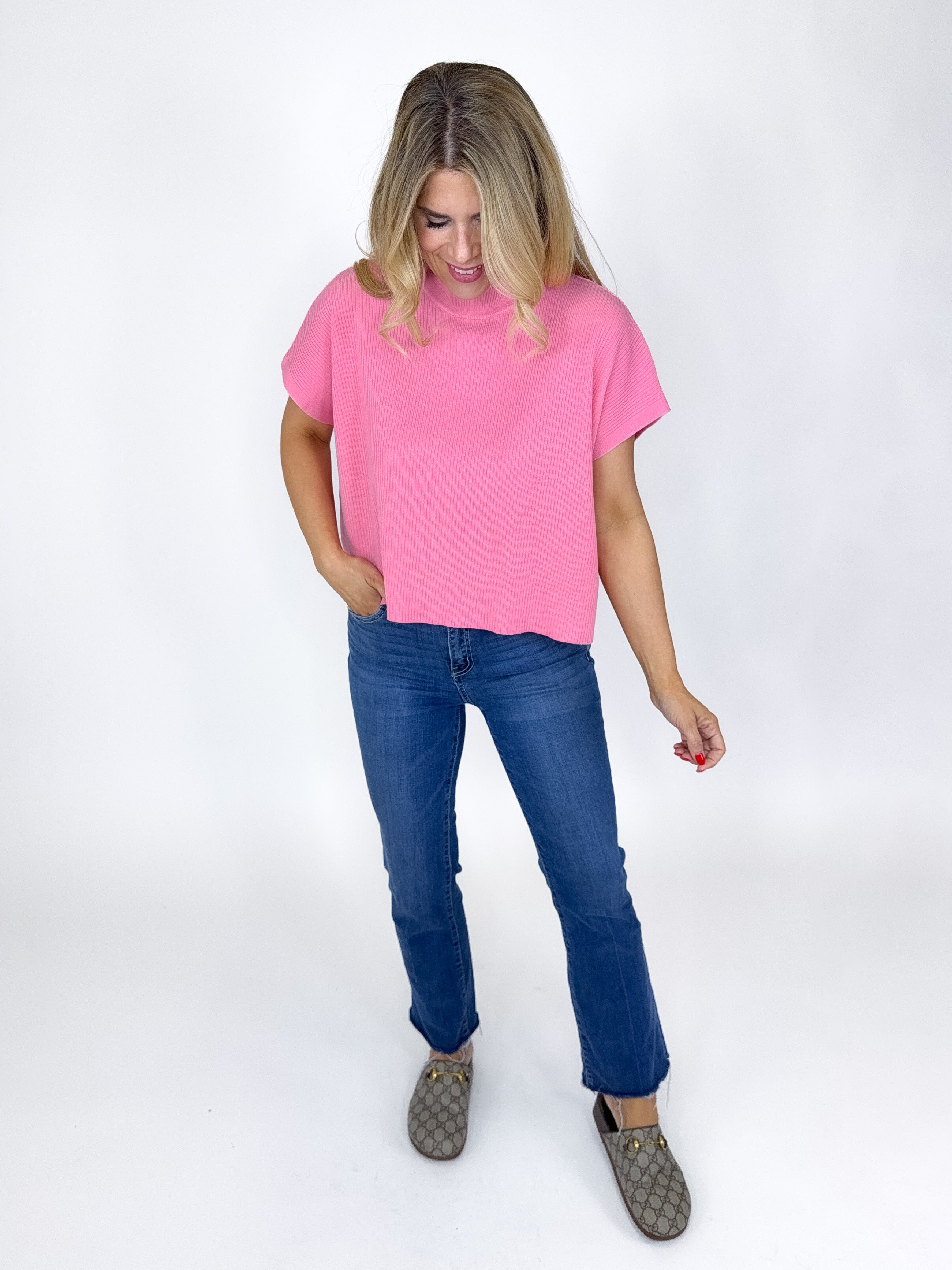 Our Eliza Top is a must have! This pink colored knit top features a mock neck, short sleeves and a boxy skimmer fit. Style with denim, shorts, dress pants and leggings. Dress it up or down.