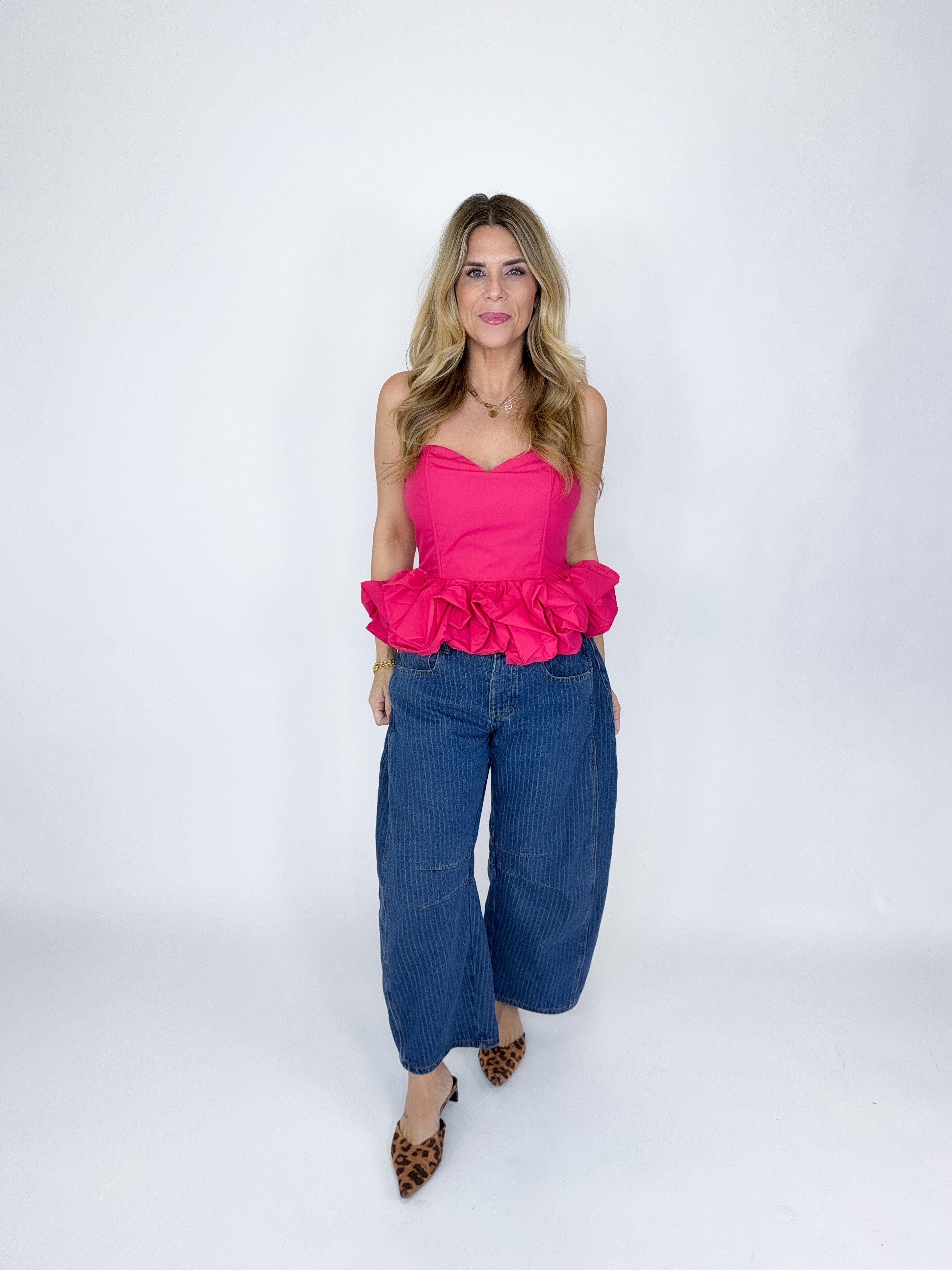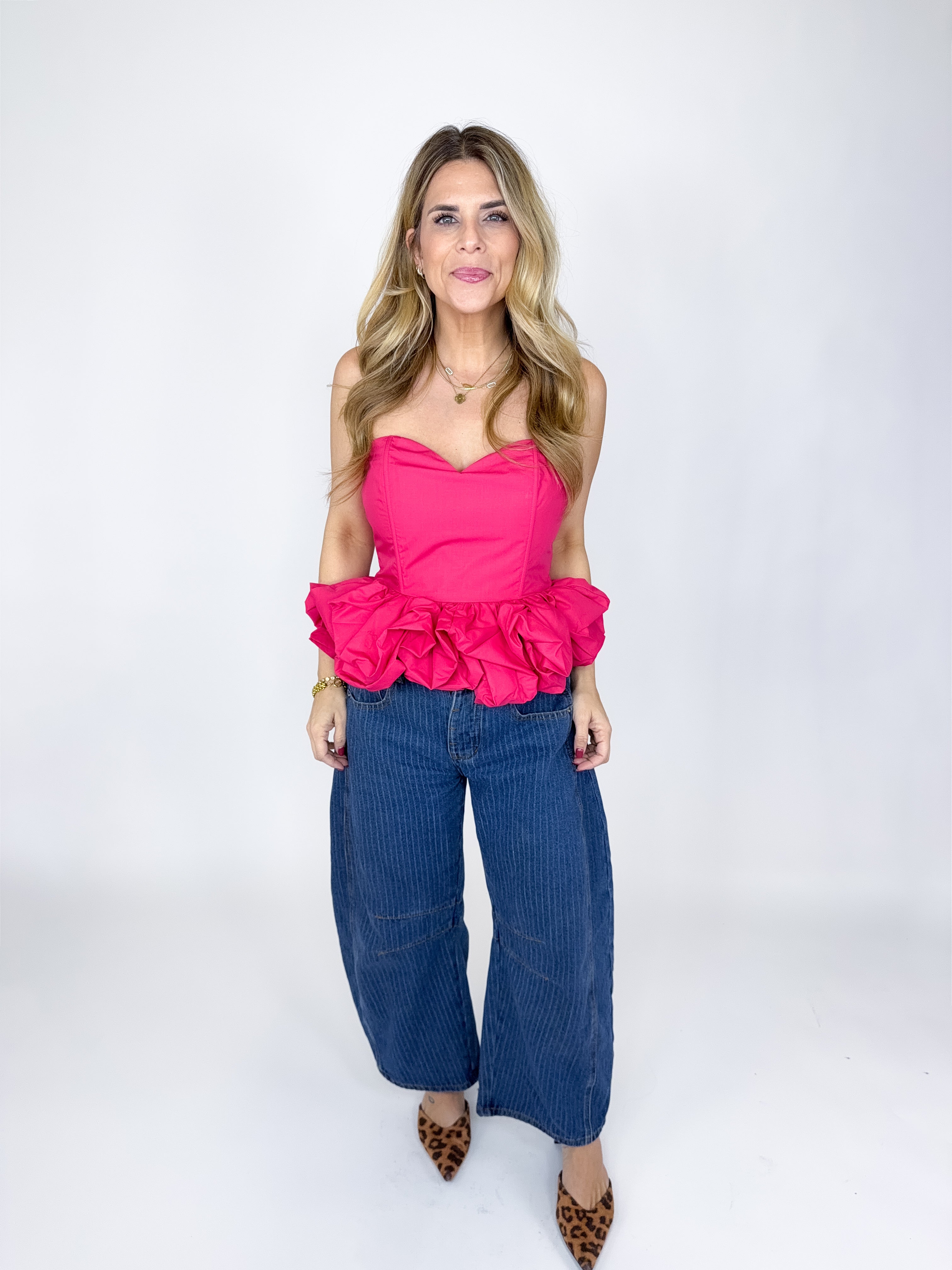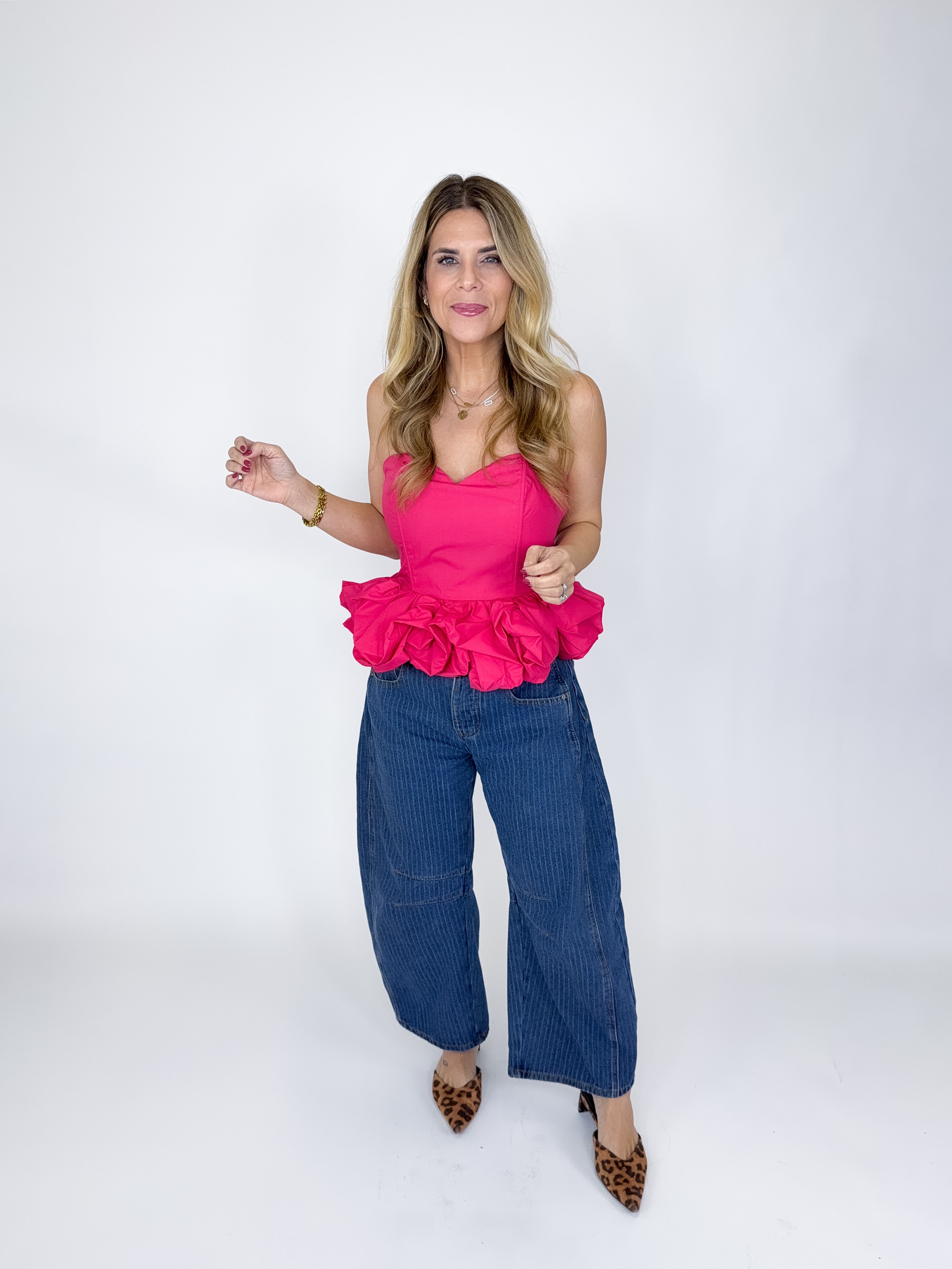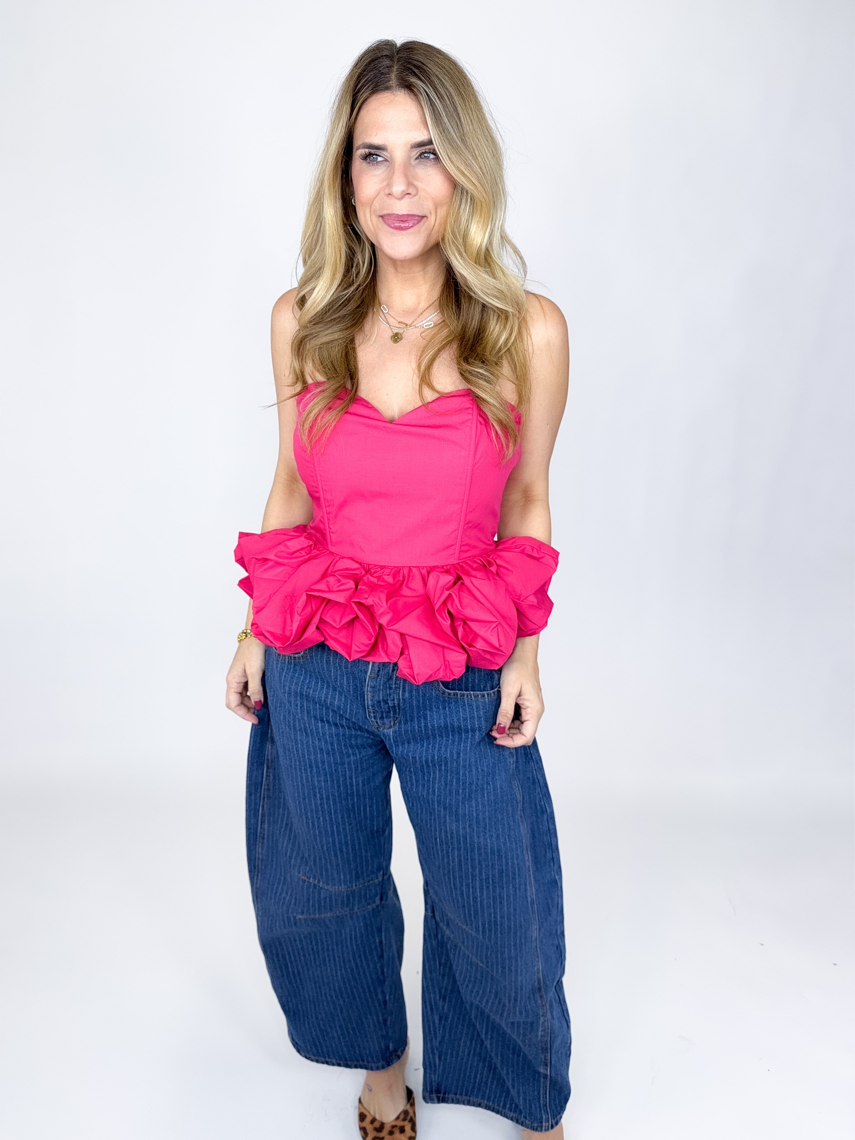 The Eloise Top is the perfect statement top! This hot pink blouse features a strapless sweetheart neckline, smocked back with a zipper and a skimmer length with a peplum ruffle hem. Pairs well with everything from denim, flats, heels, dress pants, skirts and more!  Fits true to size.