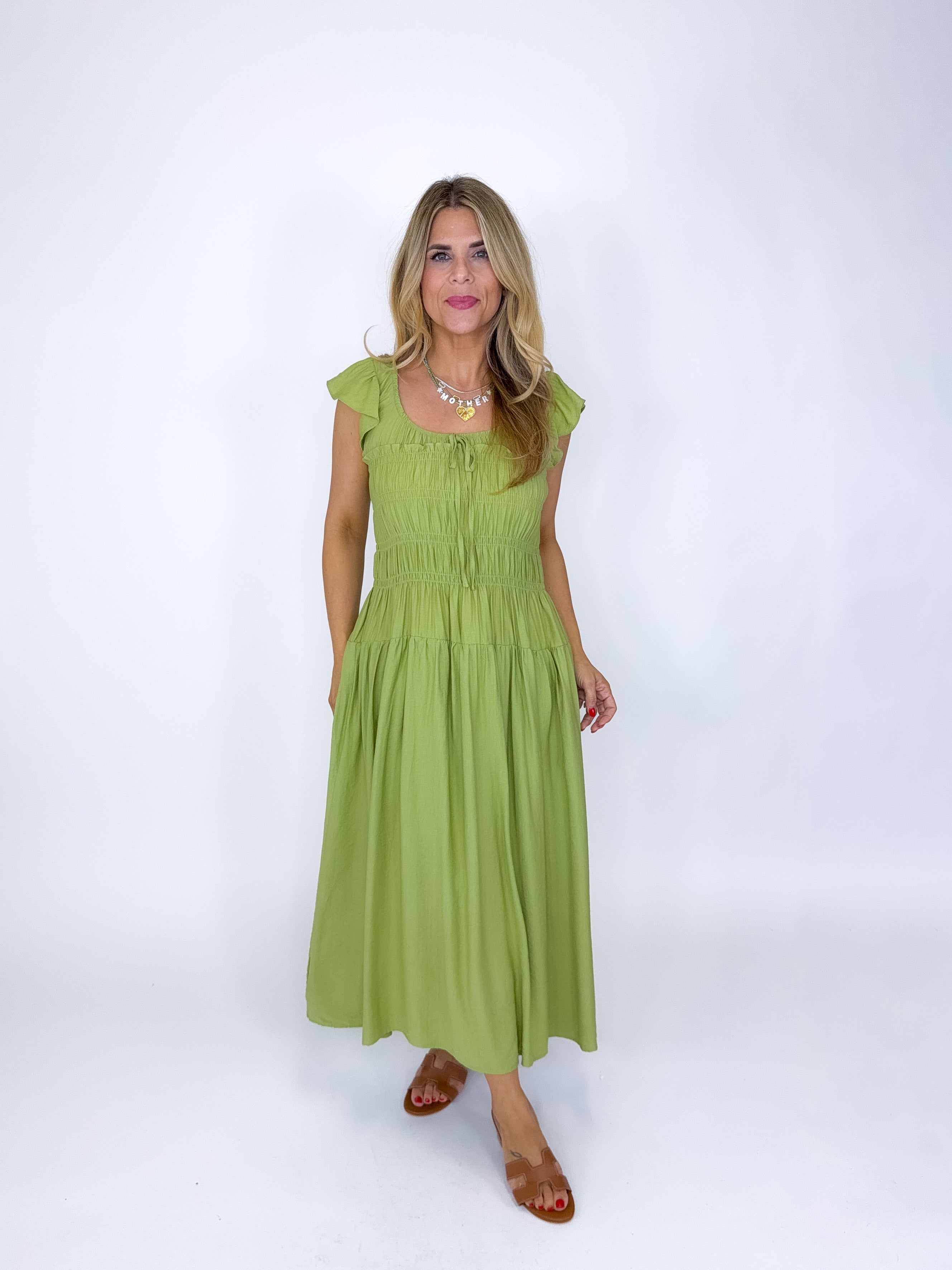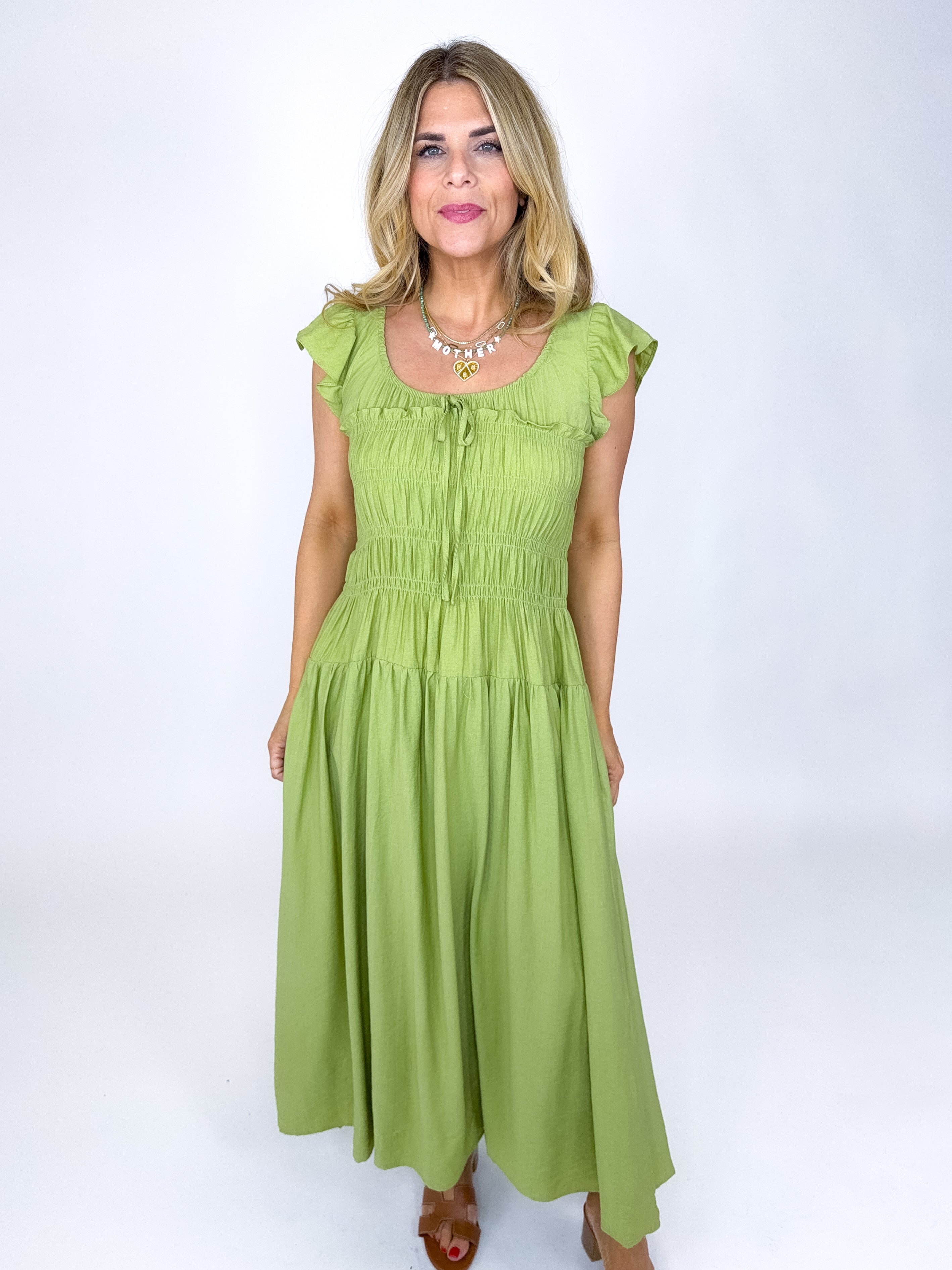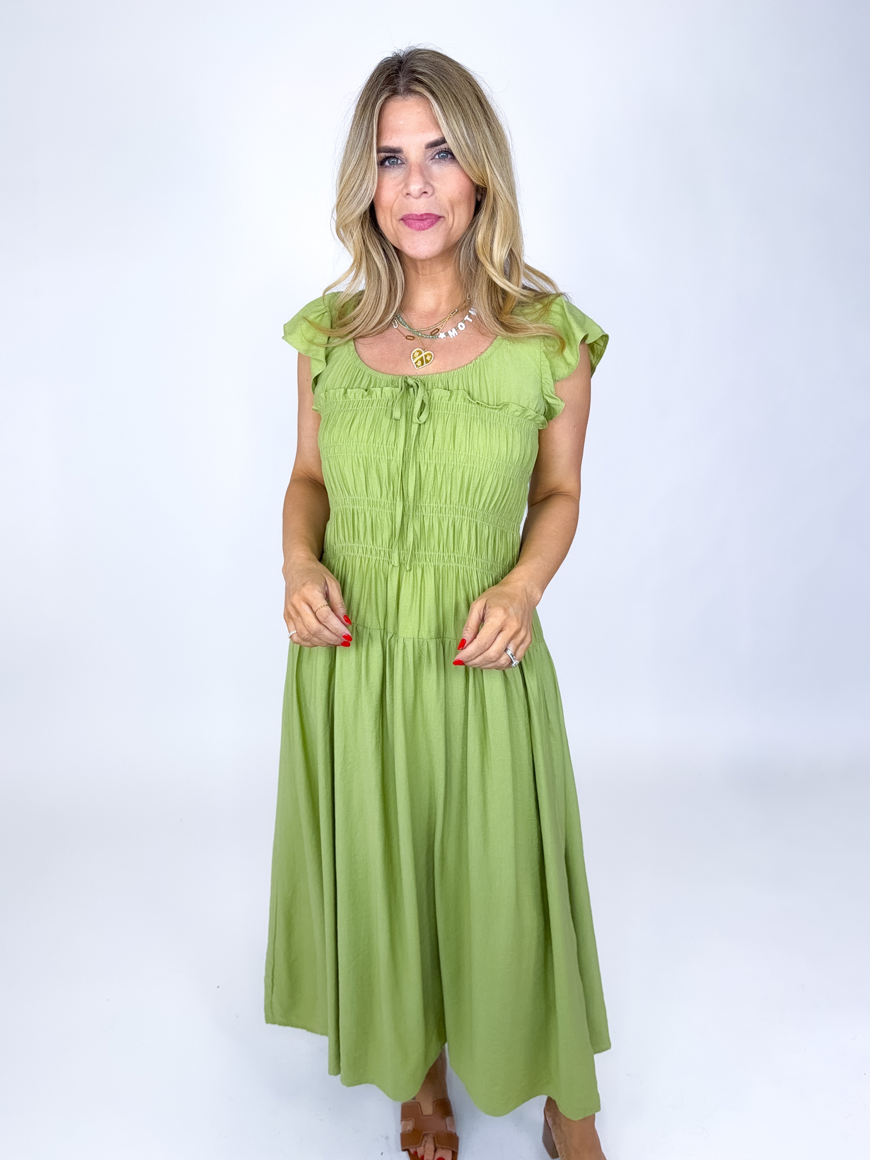The Emmett Dress is a total stunner! This green midi dress features a scoop neckline with tie detail and shirred bodice, short flutter sleeves and a tired skirt. Style with flats, heels or sandals. Fits true to size.
