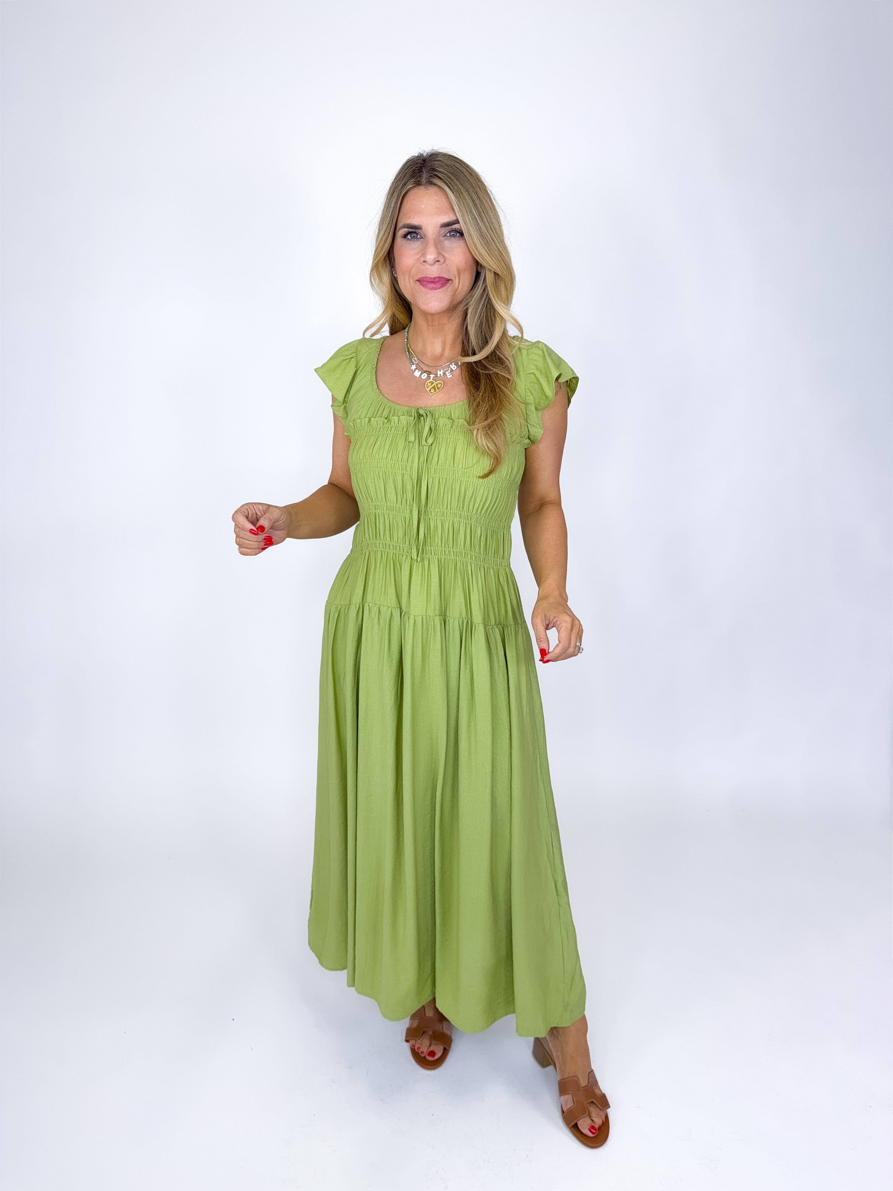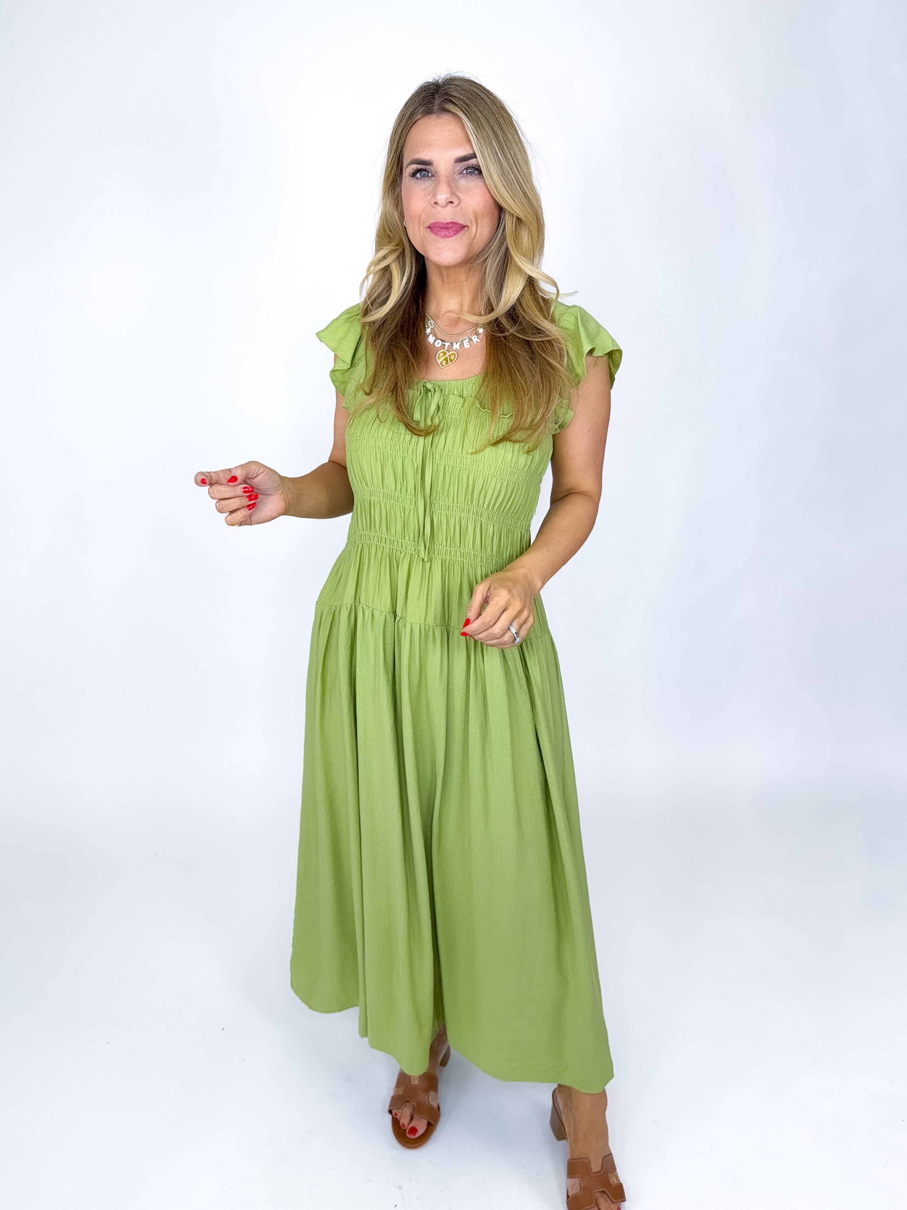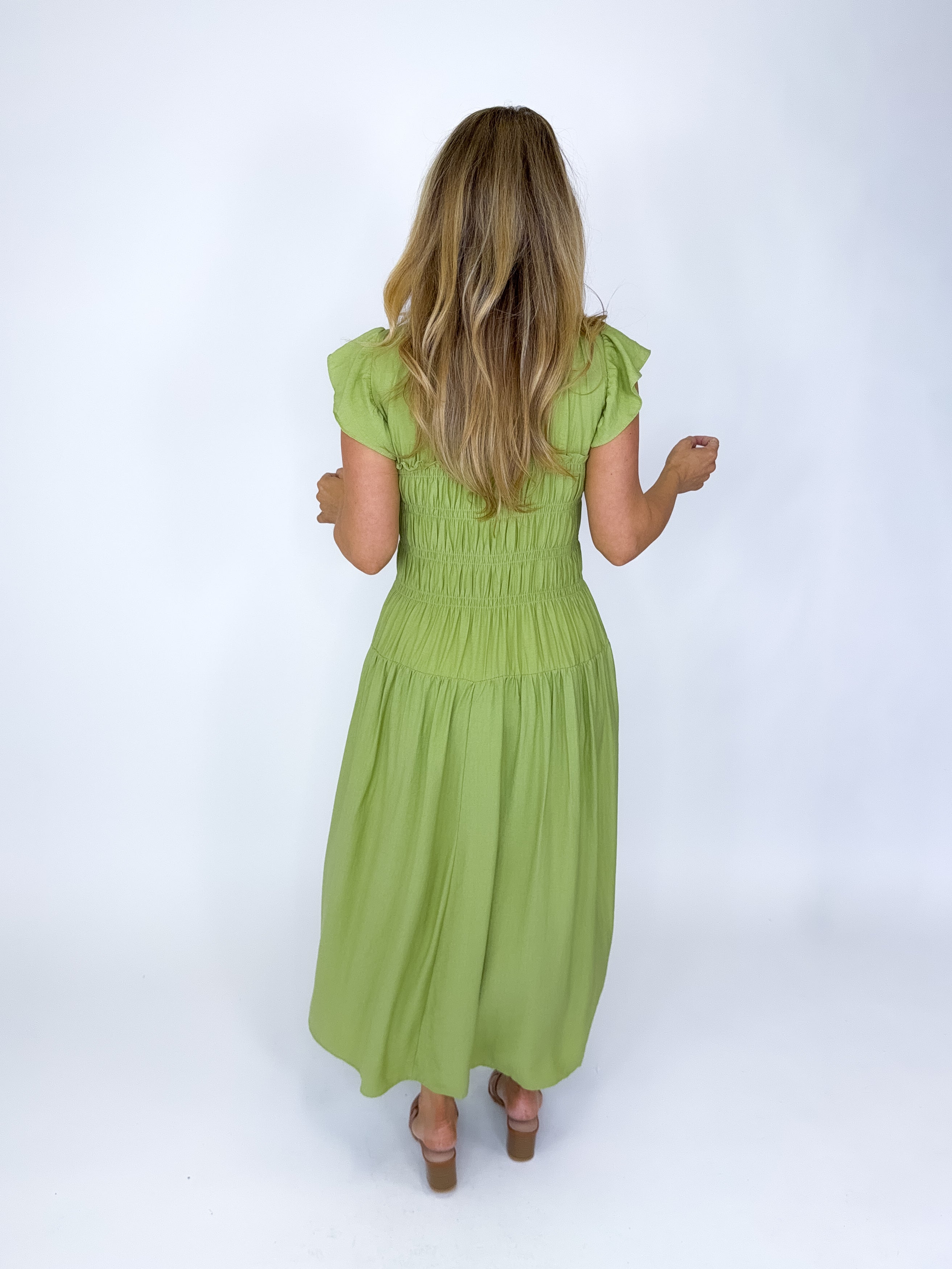The Emmett Dress is a total stunner! This green midi dress features a scoop neckline with tie detail and shirred bodice, short flutter sleeves and a tired skirt. Style with flats, heels or sandals. Fits true to size.