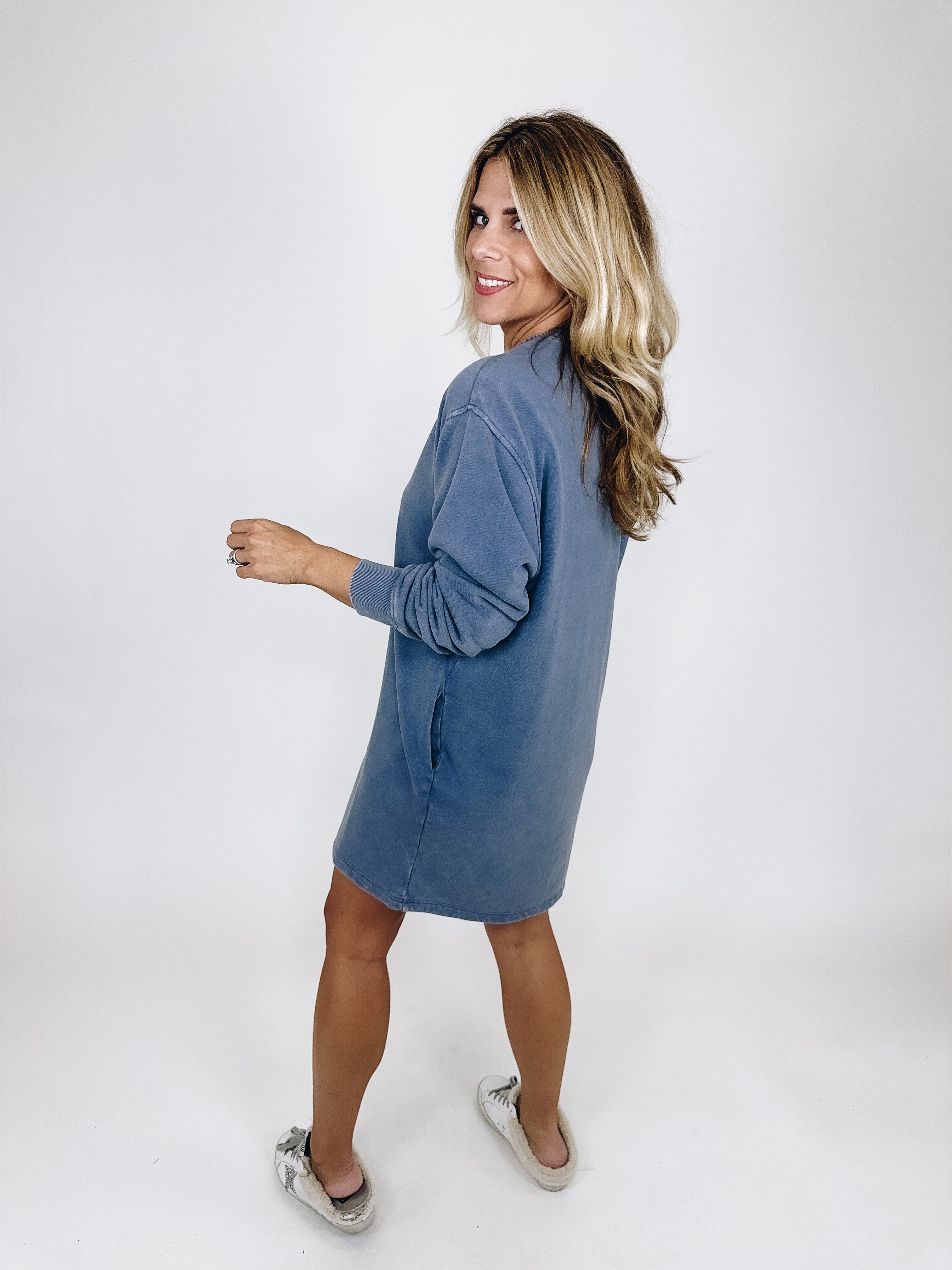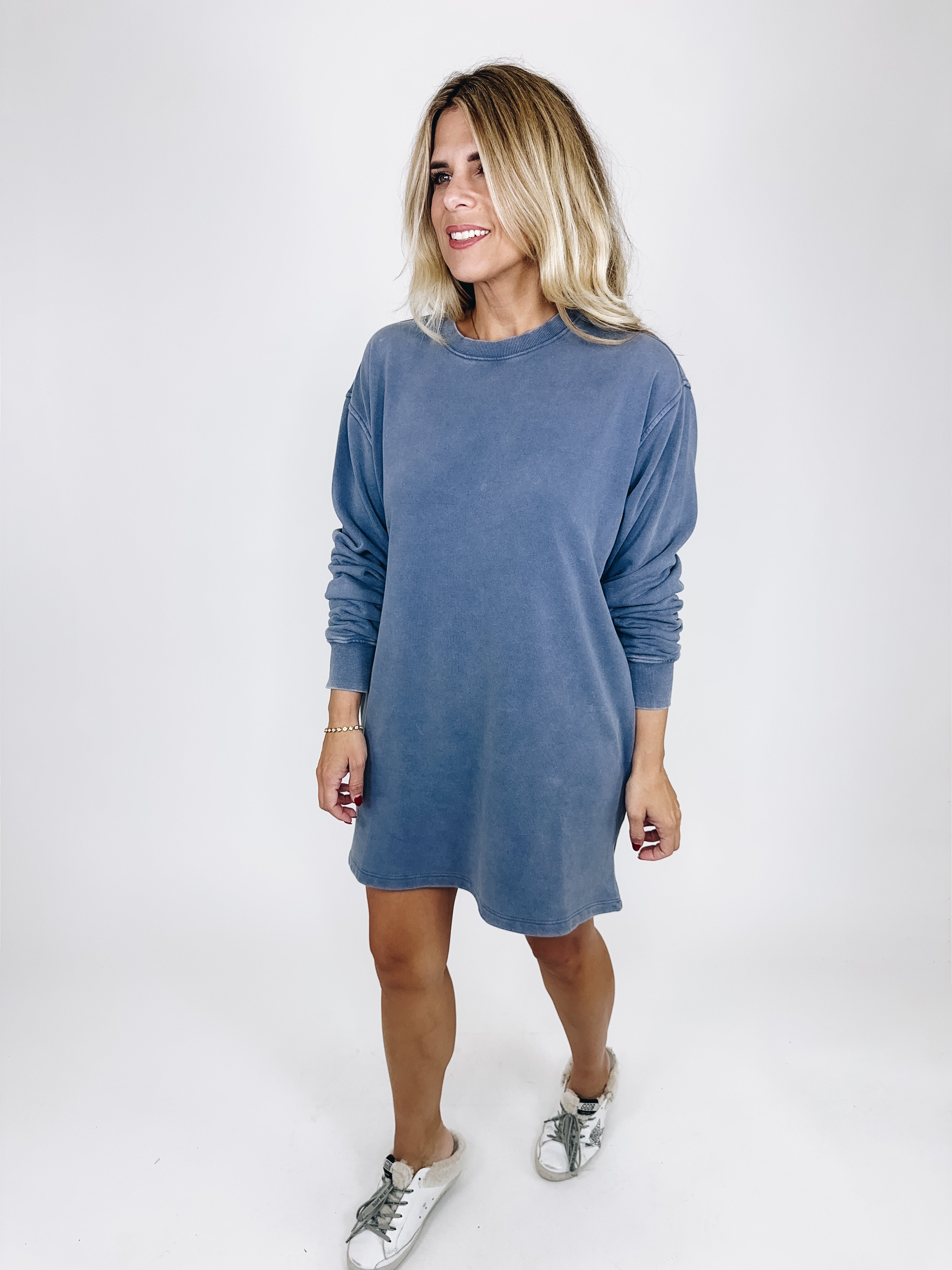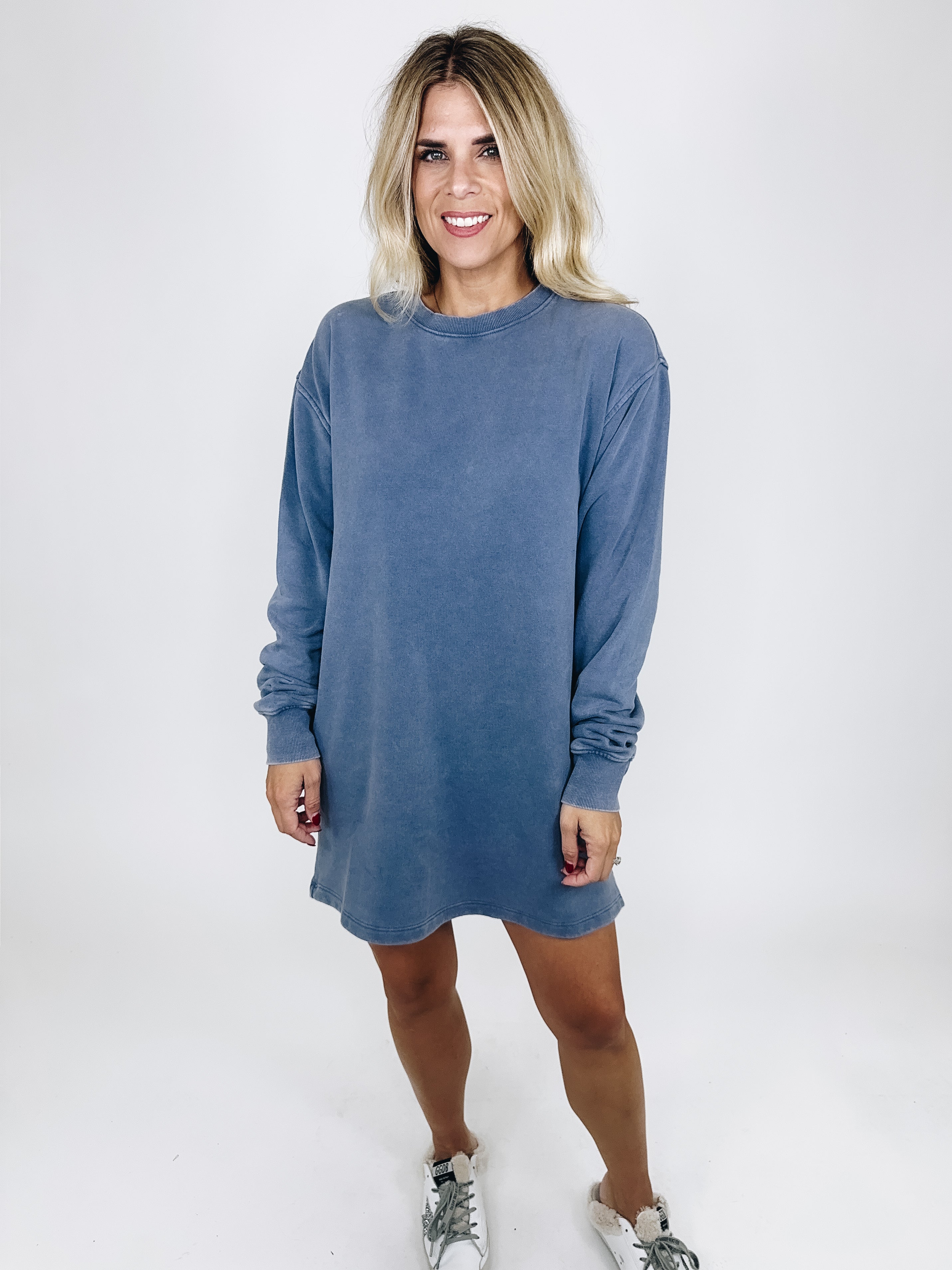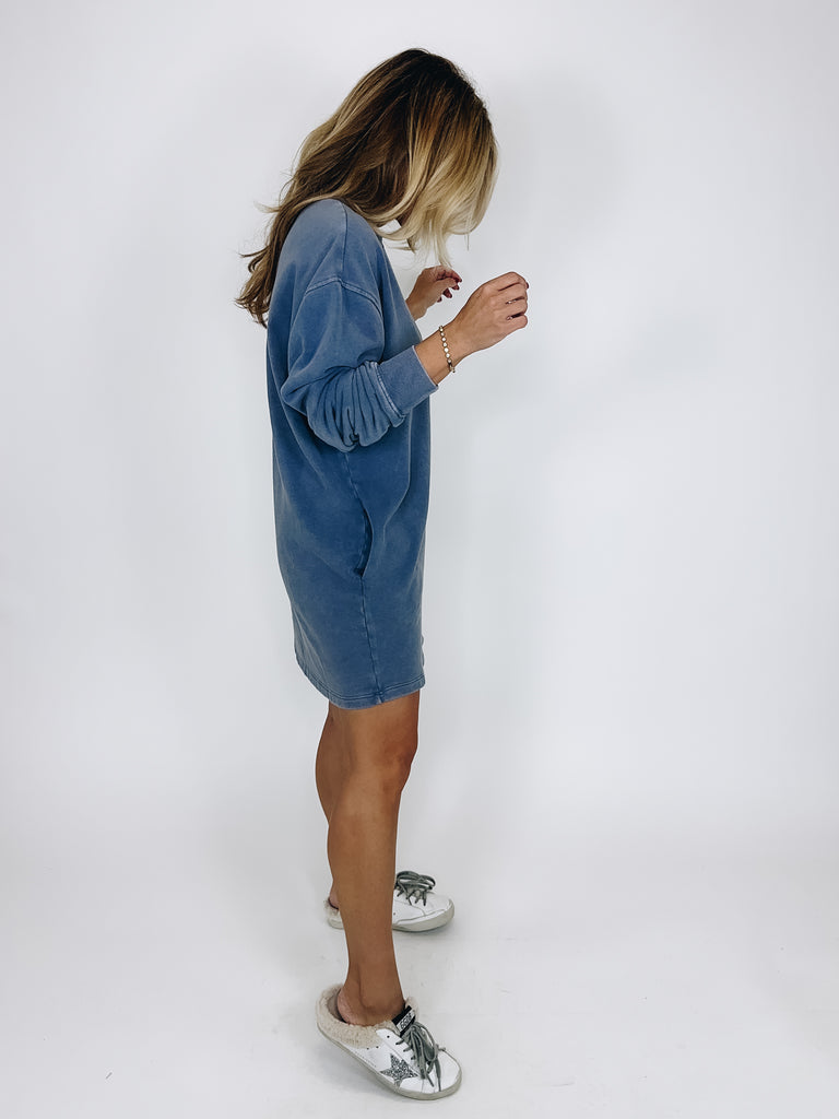 The Ezra Dress is your perfect everyday dress! This mineral wash dusty navy lightweight sweatshirt dress features a crew neckline, long drop sleeves, and a long mini length. Style with flats, sneakers or boots. Fits true to size.