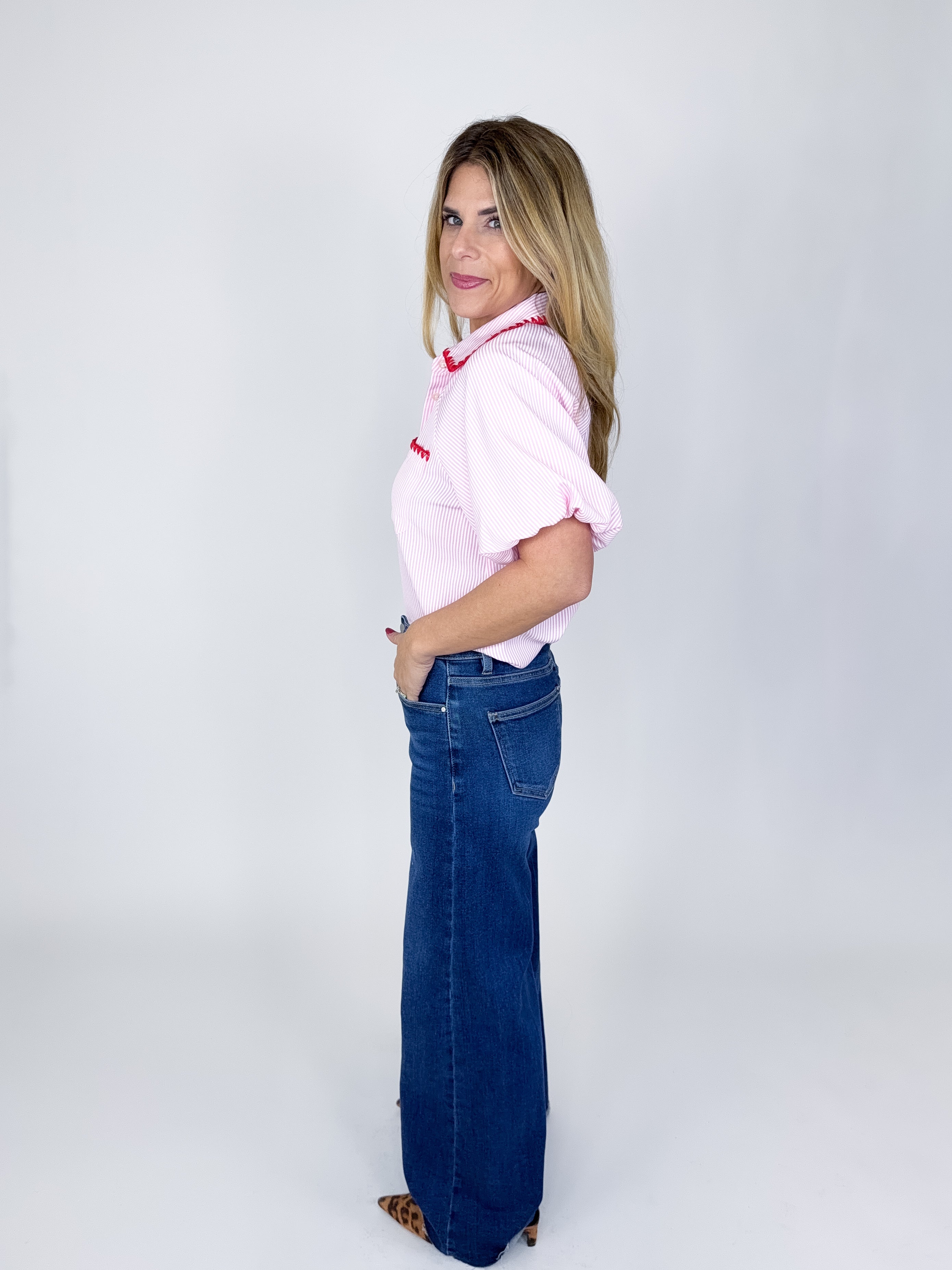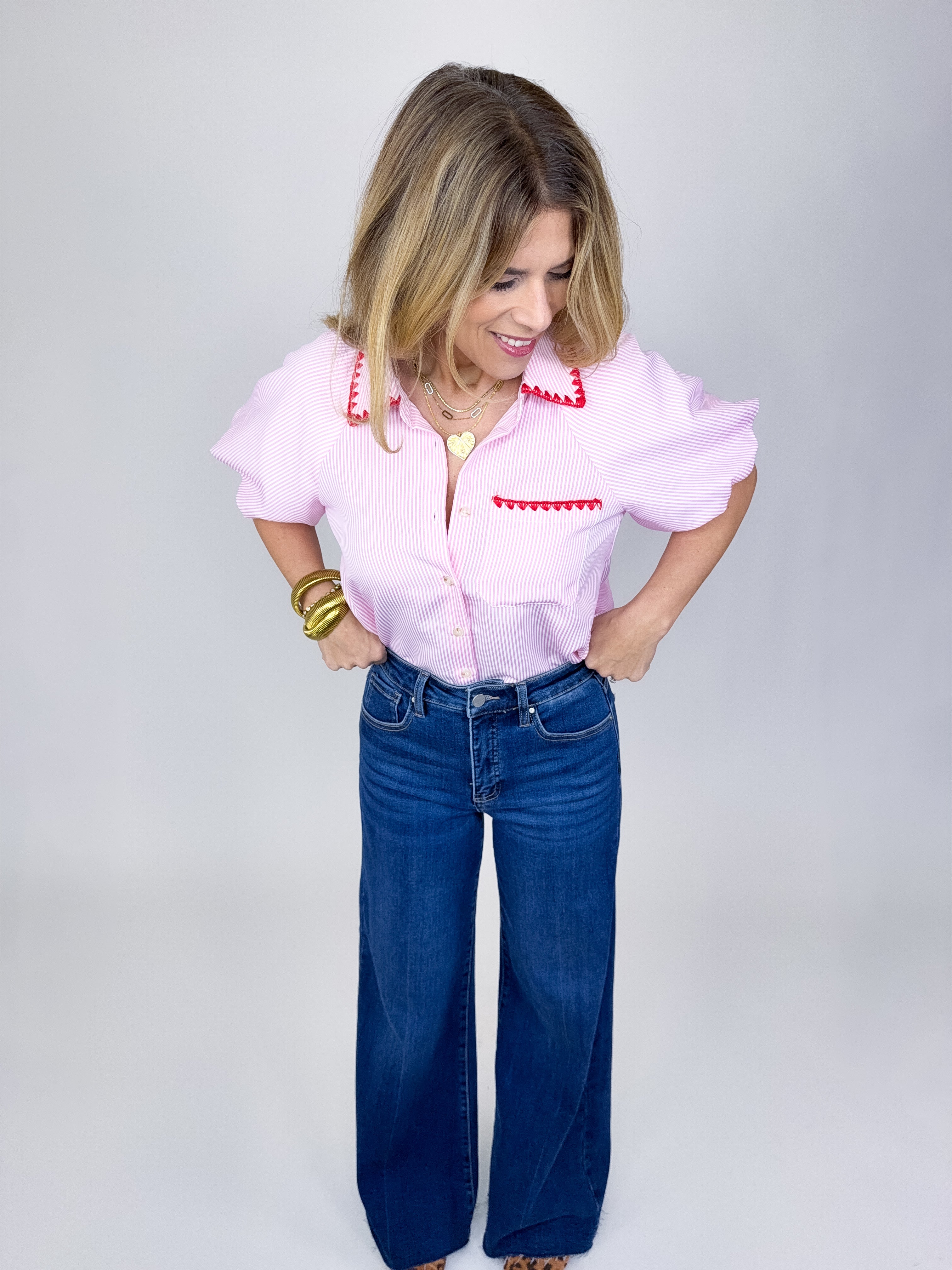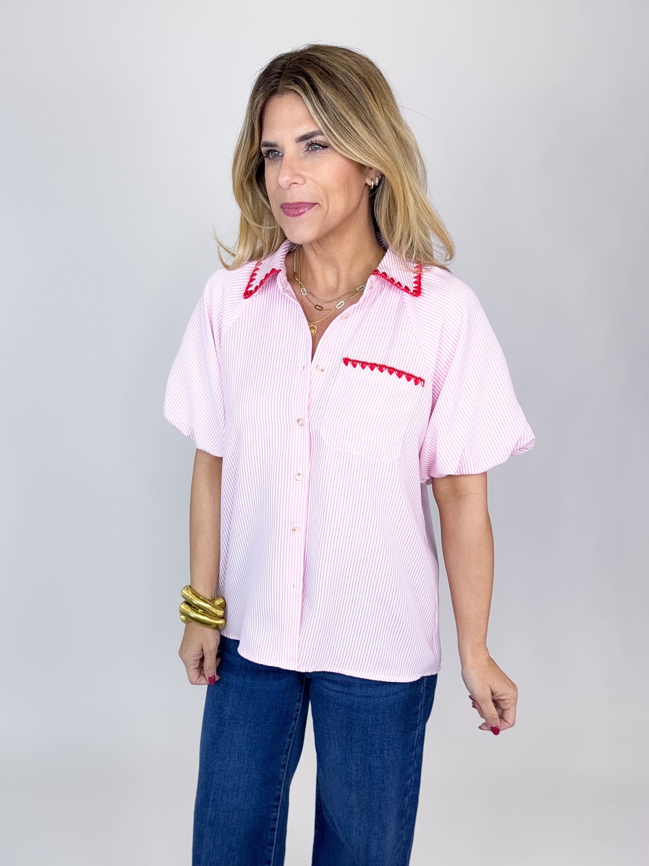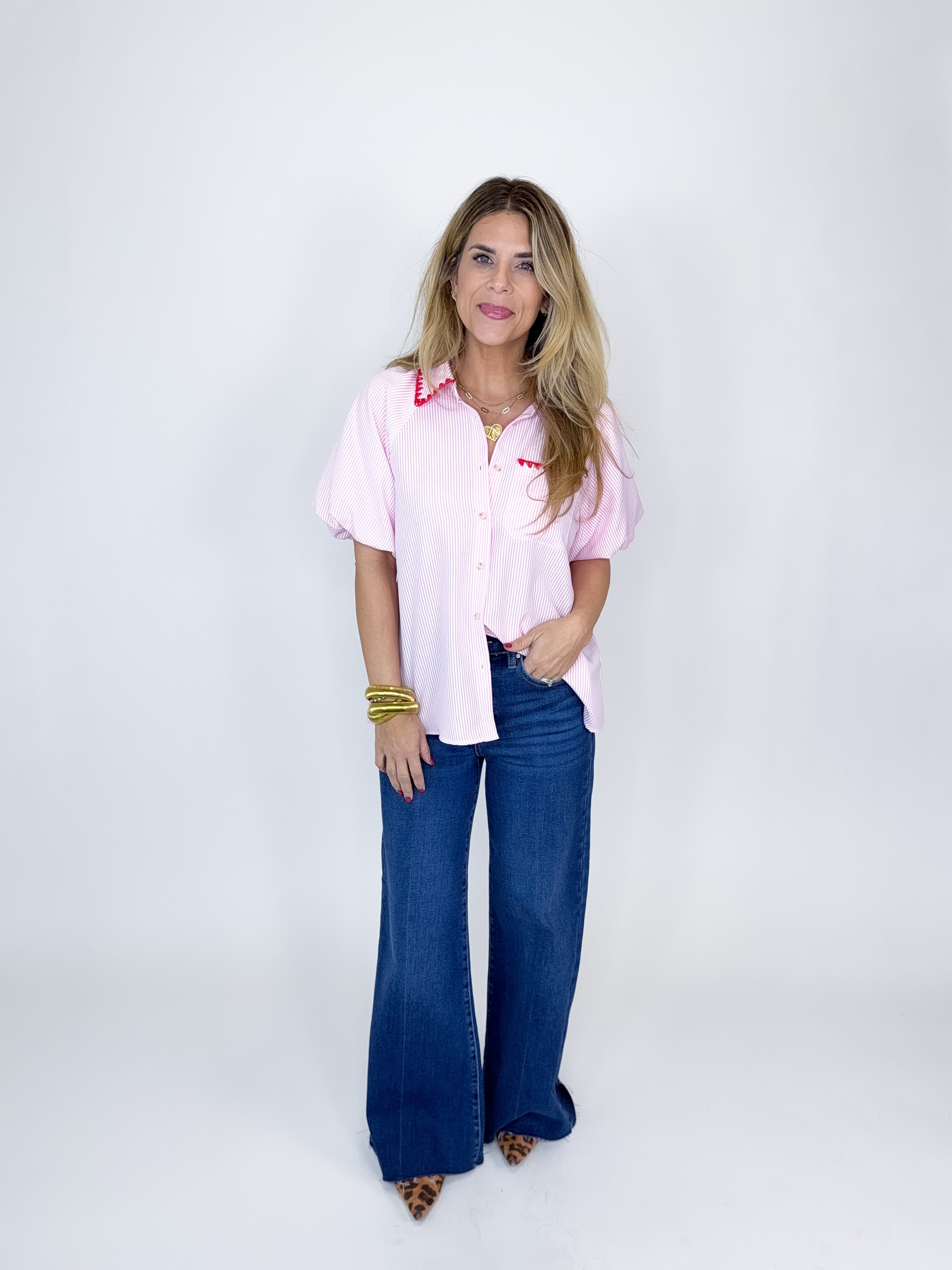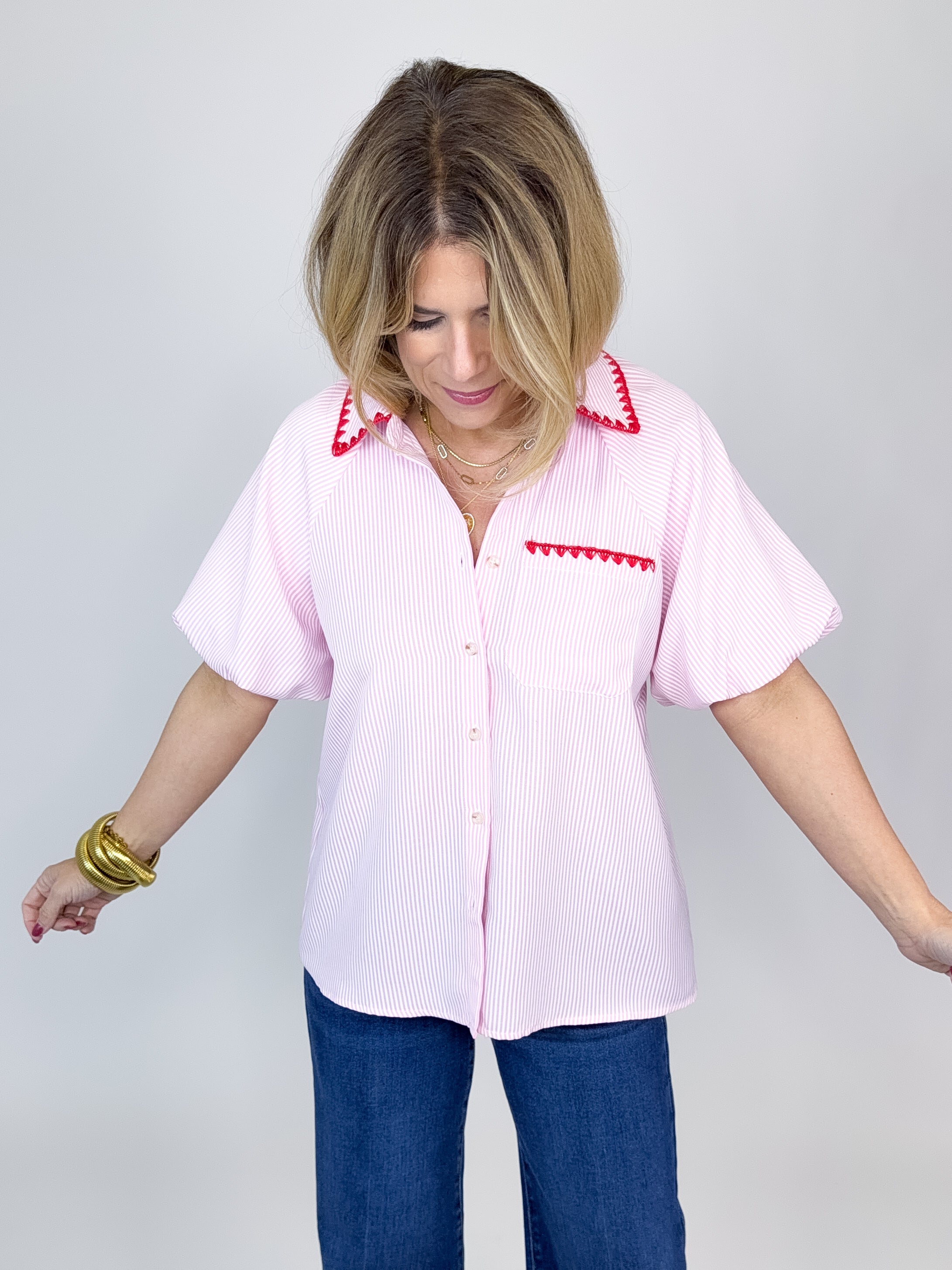 The Fallon Top is a showstopper! This pink and white stripe top features a button front, collar with a scallop embroidered trim and short balloon sleeves. Pairs well with everything from denim, flats, heels, dress pants, skirts and more! Fits true to size.