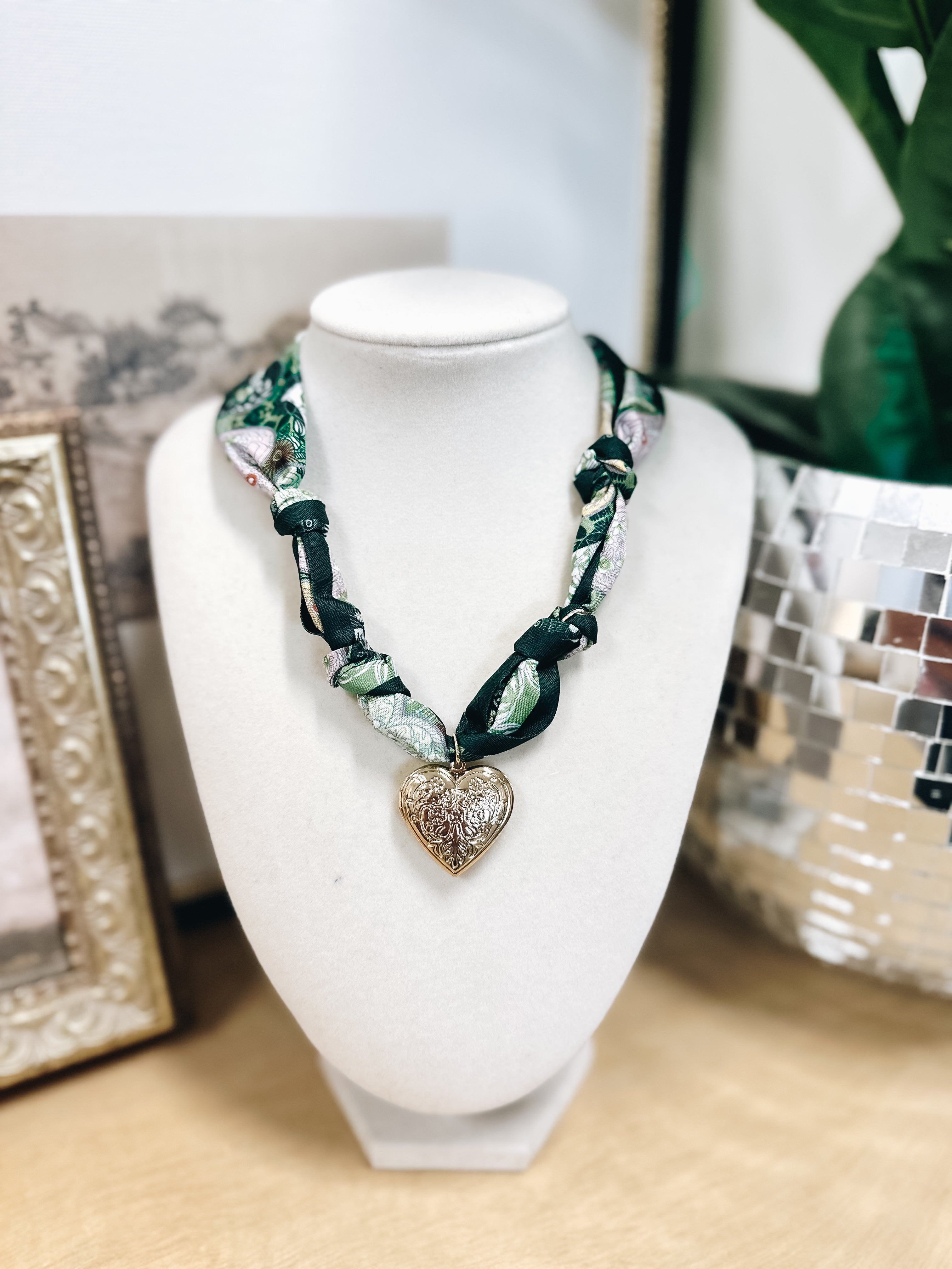 Our Handmade Scarf Necklace in green features a gold heart charm on a lightweight scarf. Adjustable length.