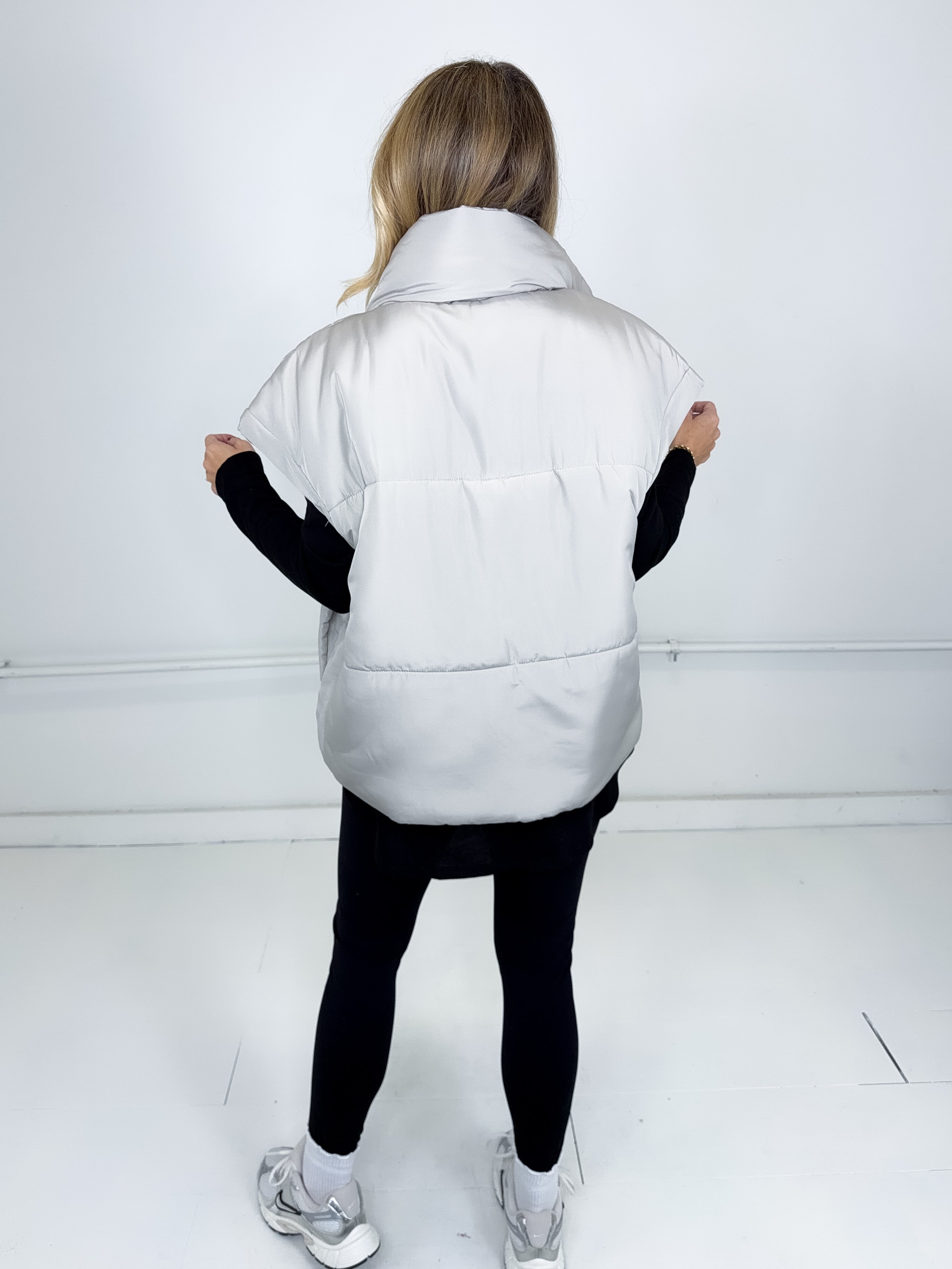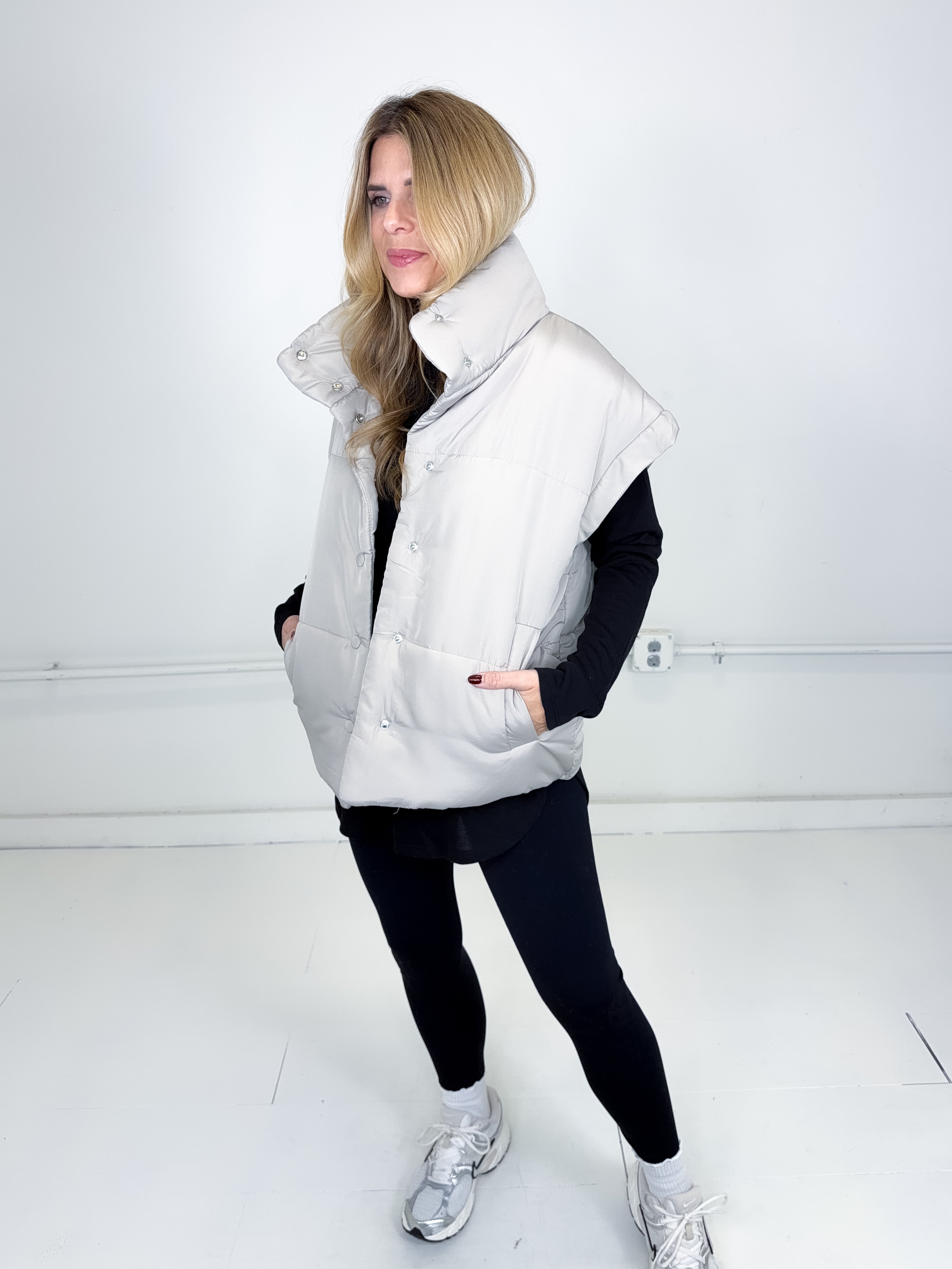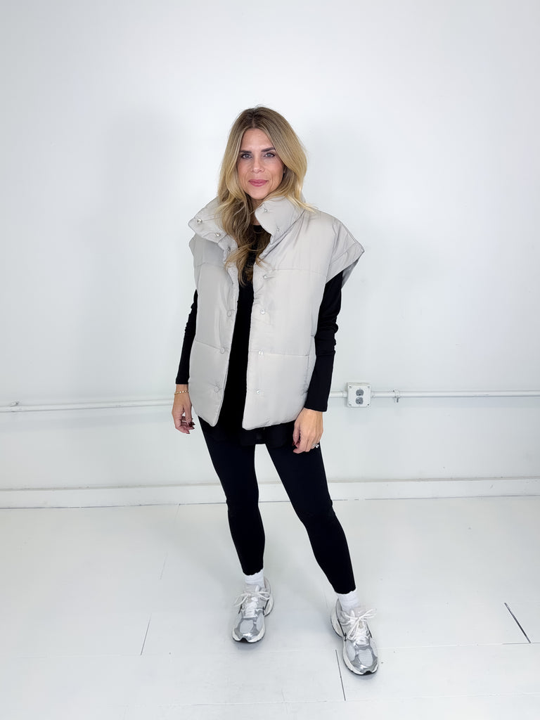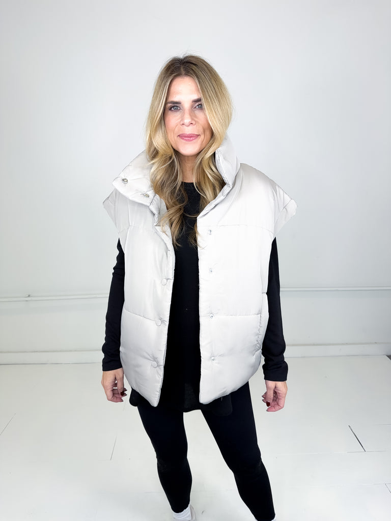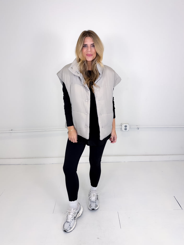 The Hart Vest is a is the perfect puffer vest. This soft gray colored vest features a snap front, stand up collar, drop shoulder, front pockets and an oversized fit. Wear it over a dress, with tops and denim, or dress it down with leggings and tennis shoes. Dress up or down. Oversized fit.