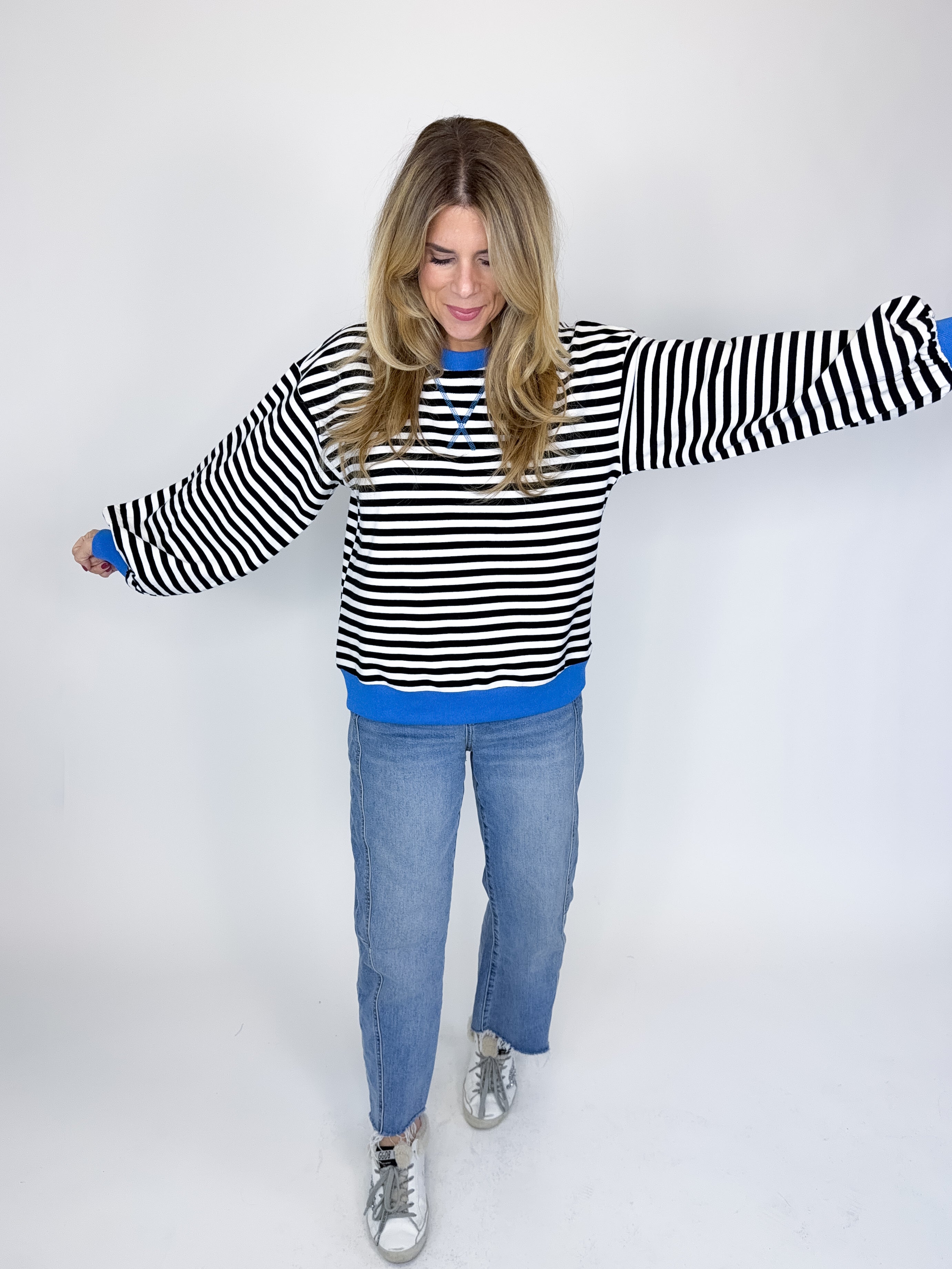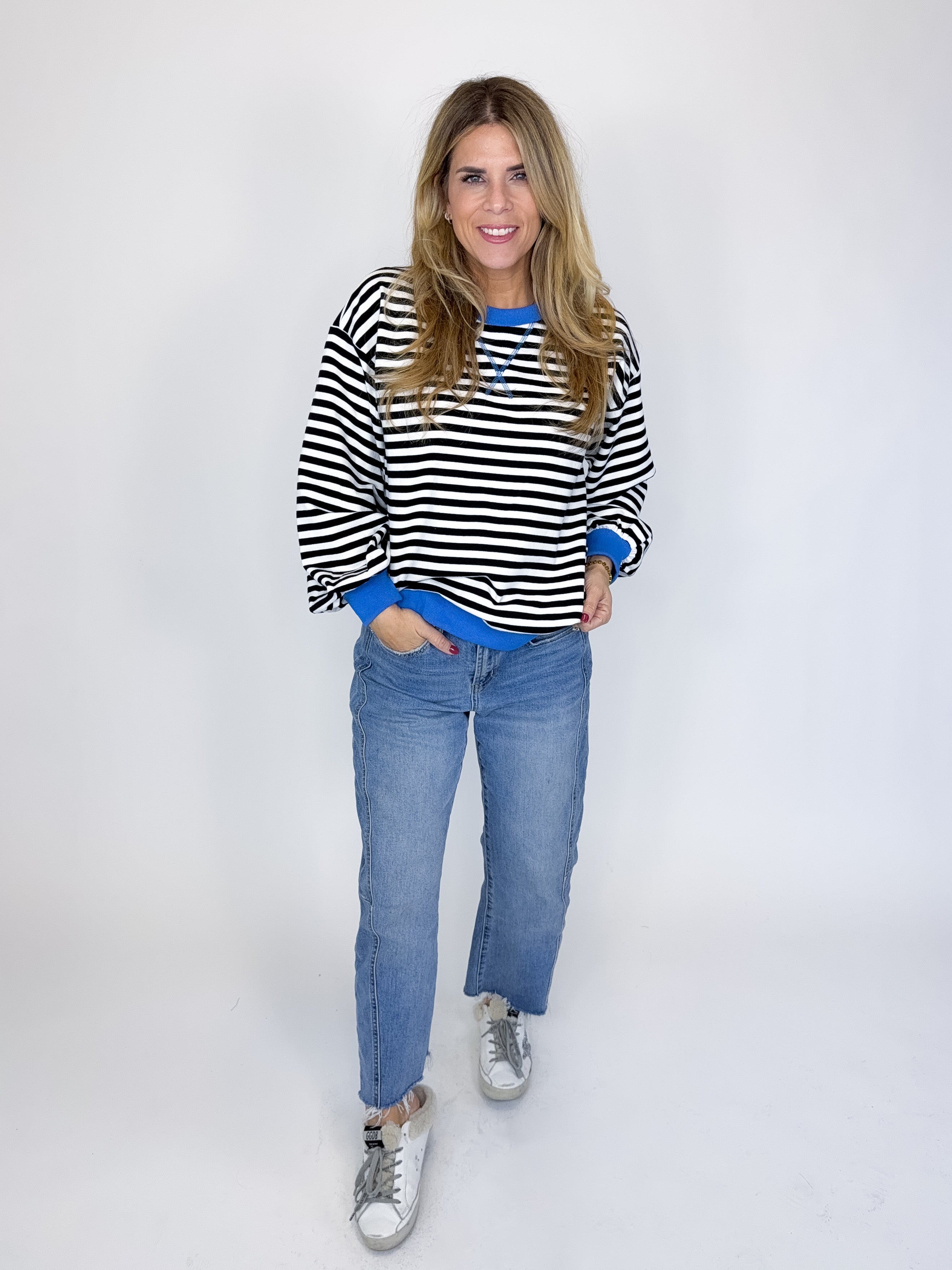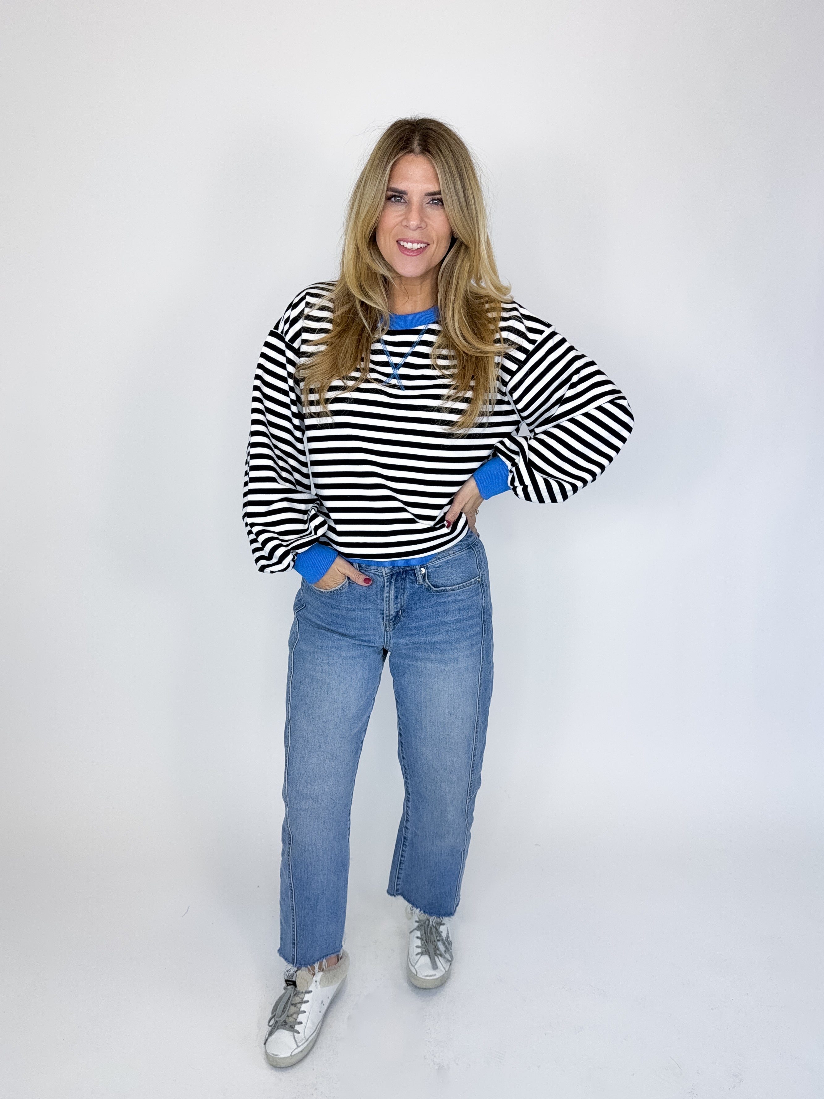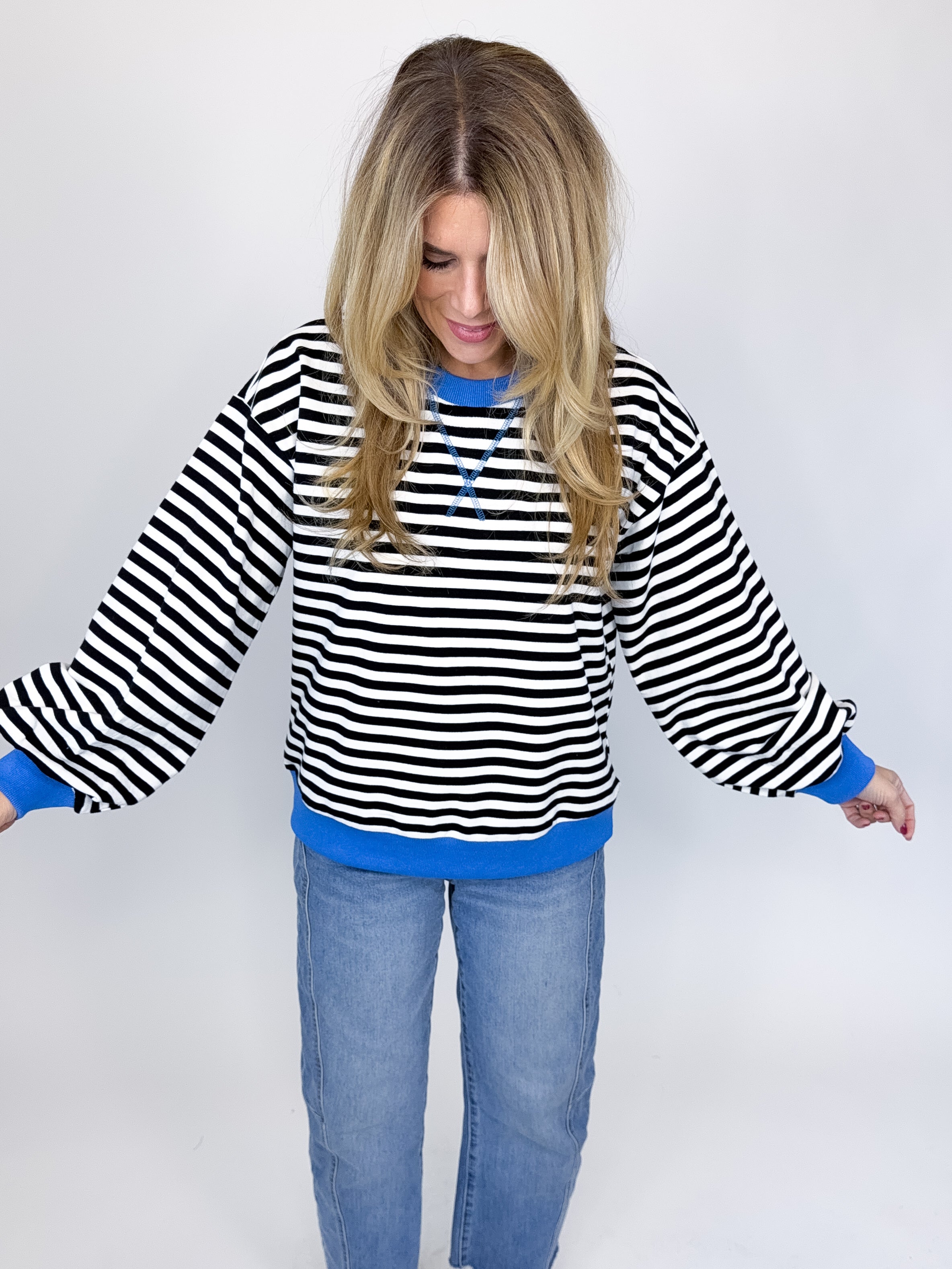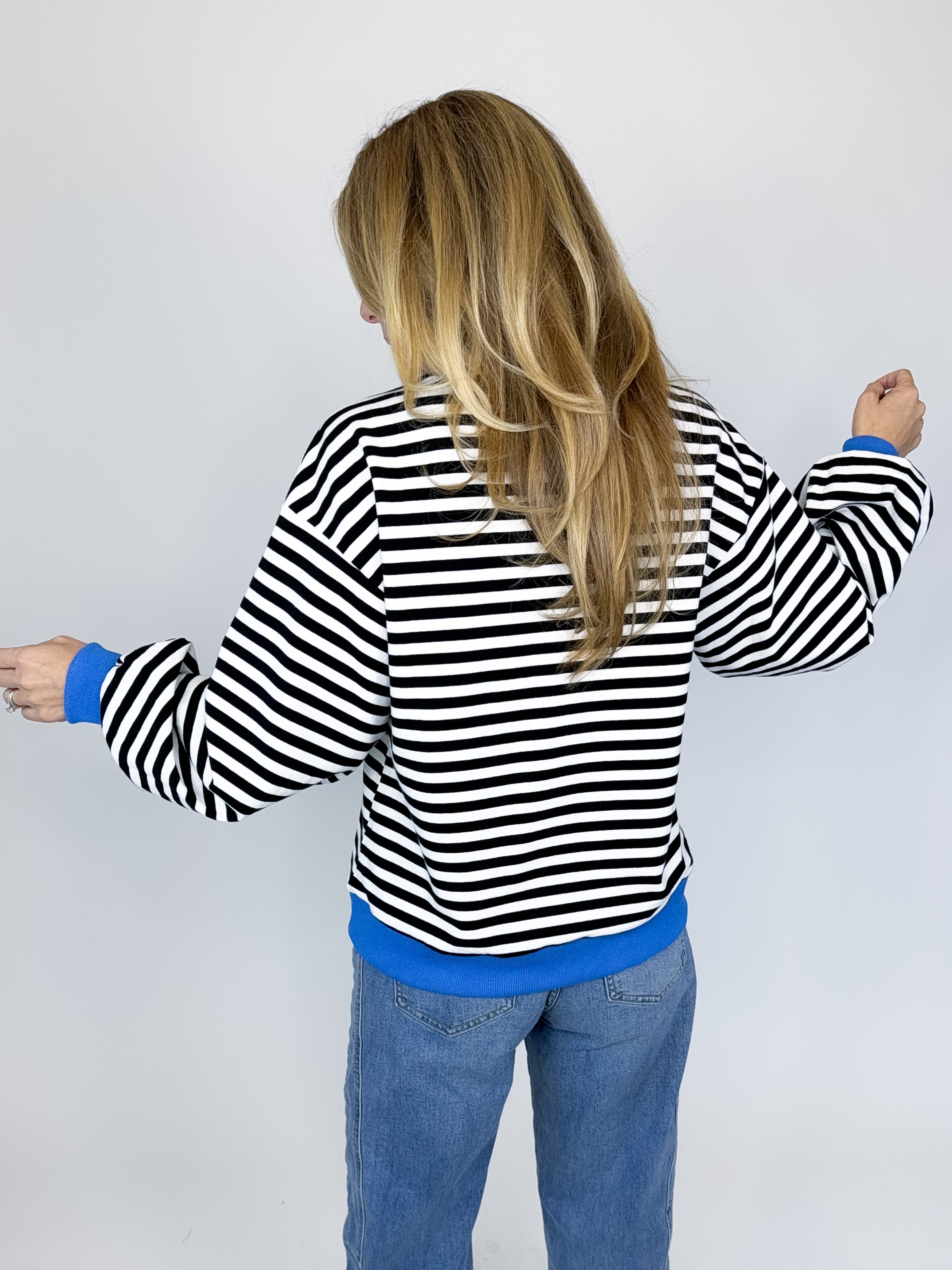The Hattie Top is a must have! This light weight black and white striped knit top features a crew neck, long sleeves with a banded cuff and a banded hemline. Pair with denim, dress pants, skirts and more! Fits true to size.