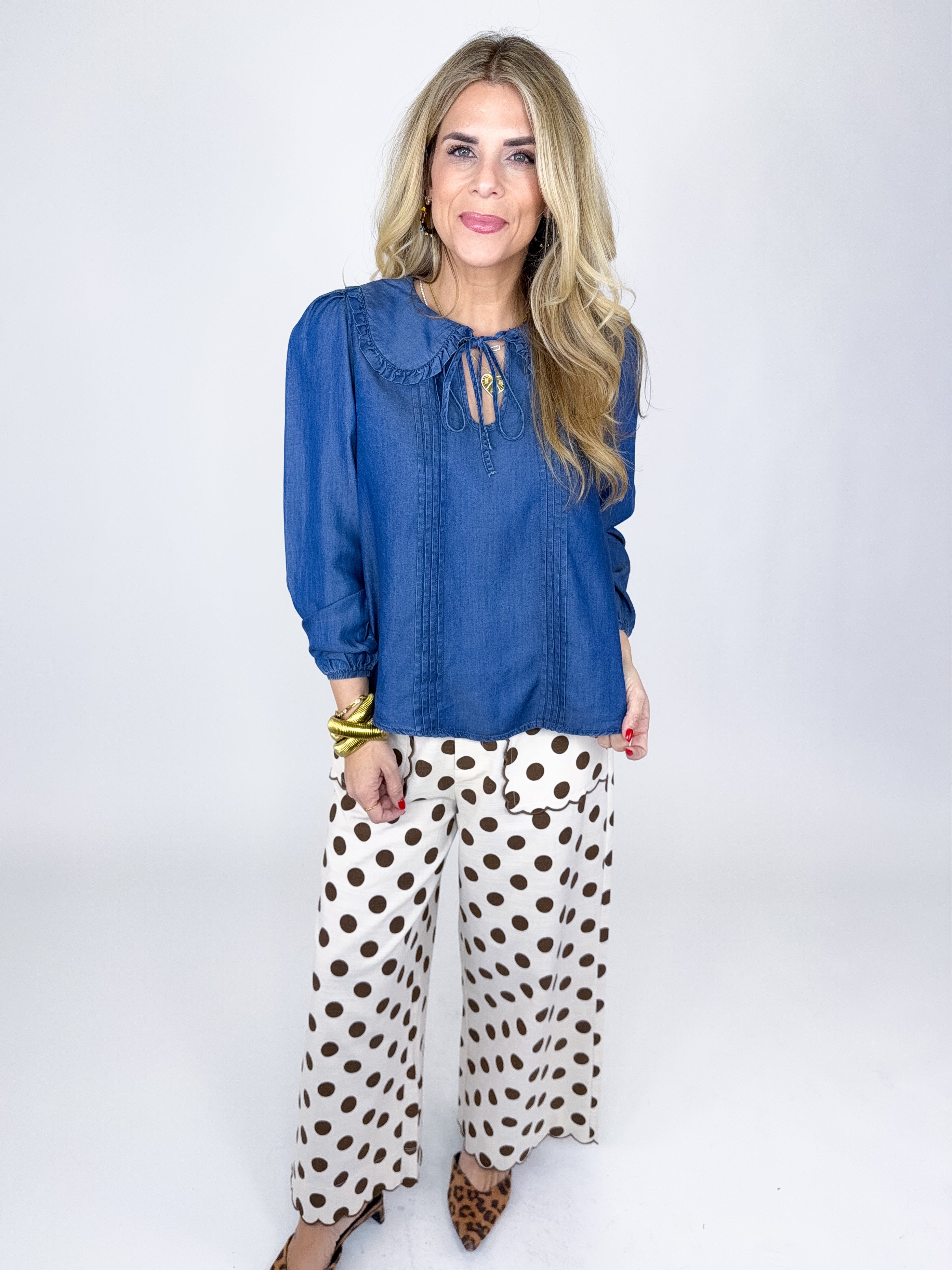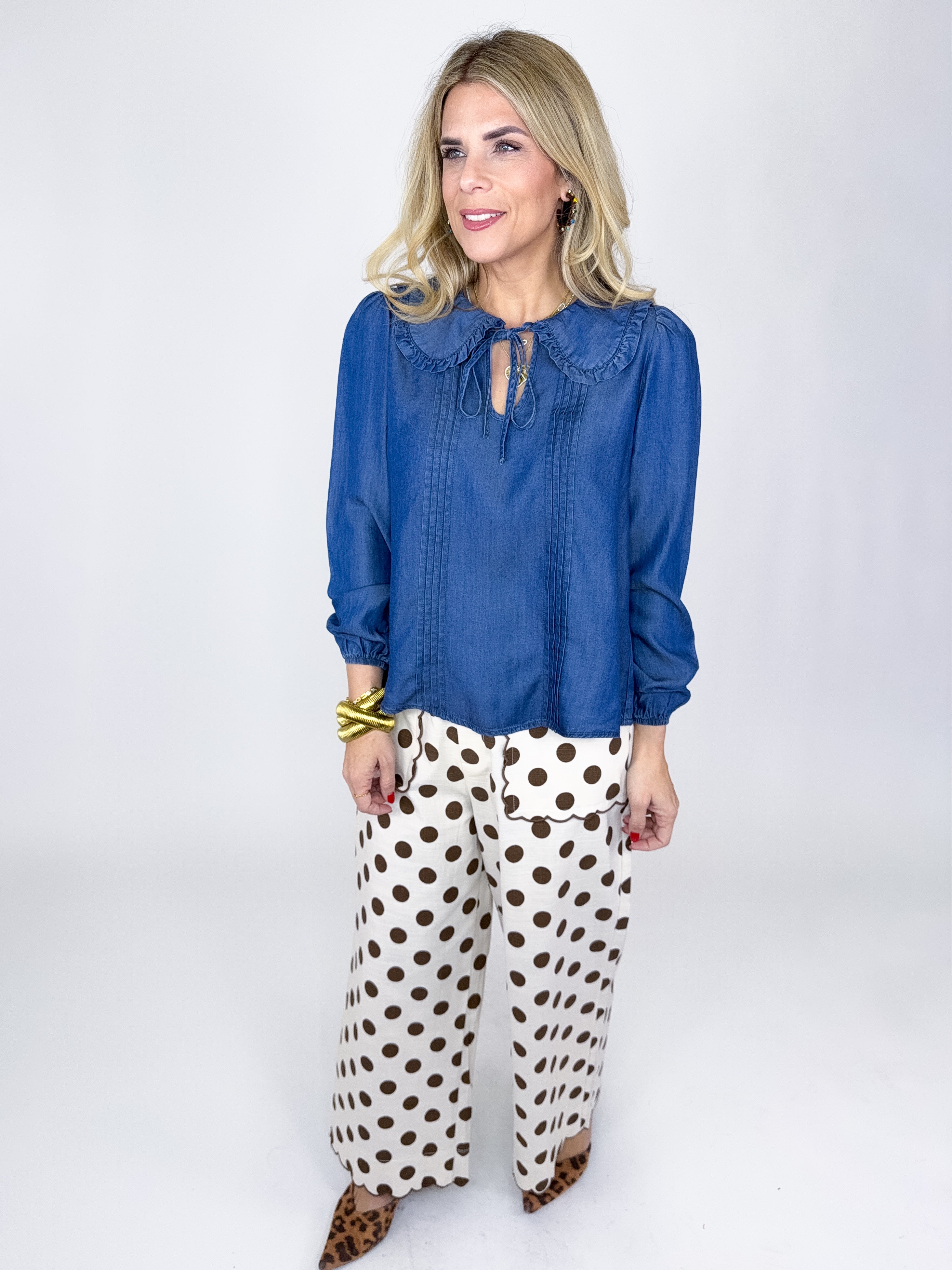 The Jane Top is such a fun top! This denim blouse features a key hole neckline with a tie, ruffle collar, pin tuck bodice and long balloon sleeves. Pairs well with everything from denim, flats, heels, dress pants, skirts and more! Fits true to size.