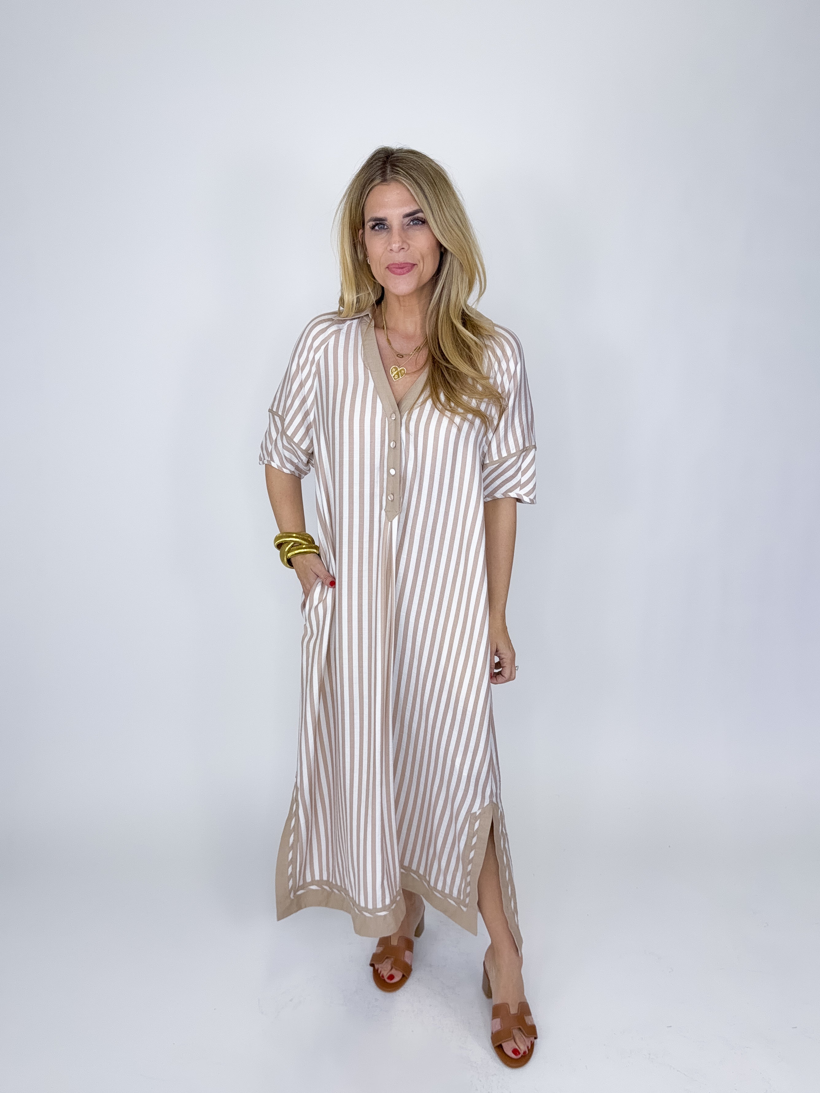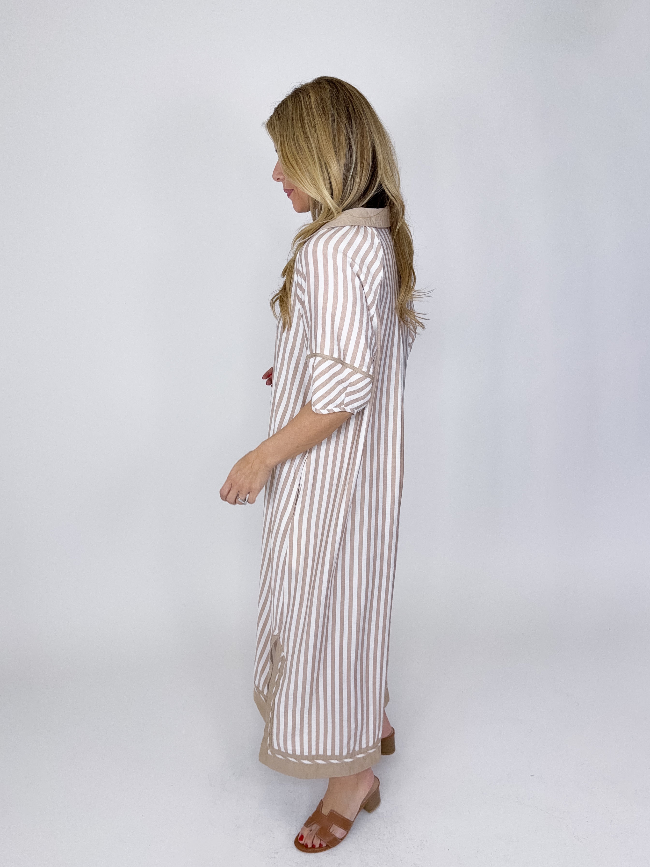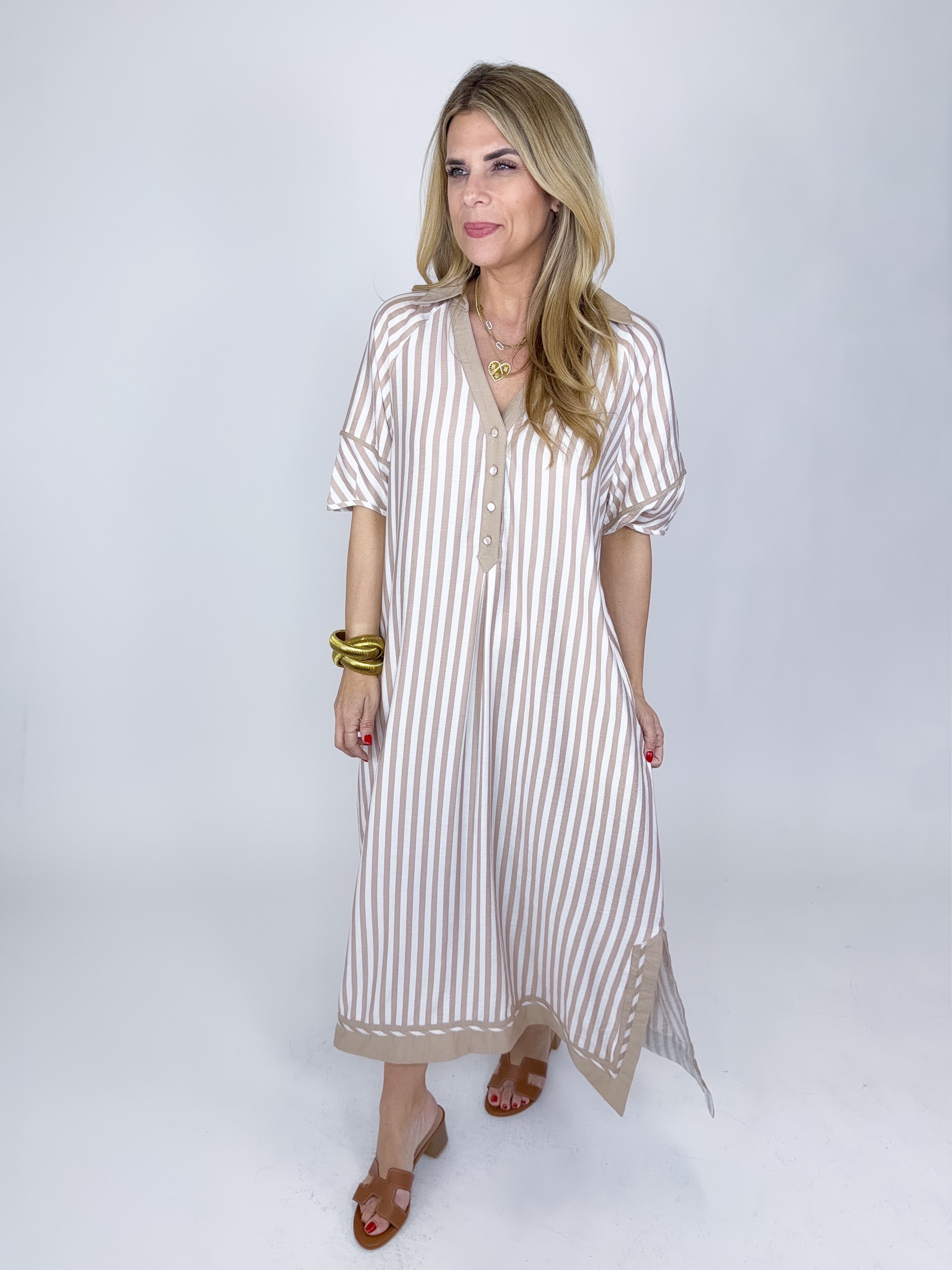 The Jayden Dress is a total classic! This taupe and white striped midi dress features a v-neck and collar, contrast trim, button front and a side slit. Pockets. Style with flats, wedges, sneakers and heels. Fits true to size.