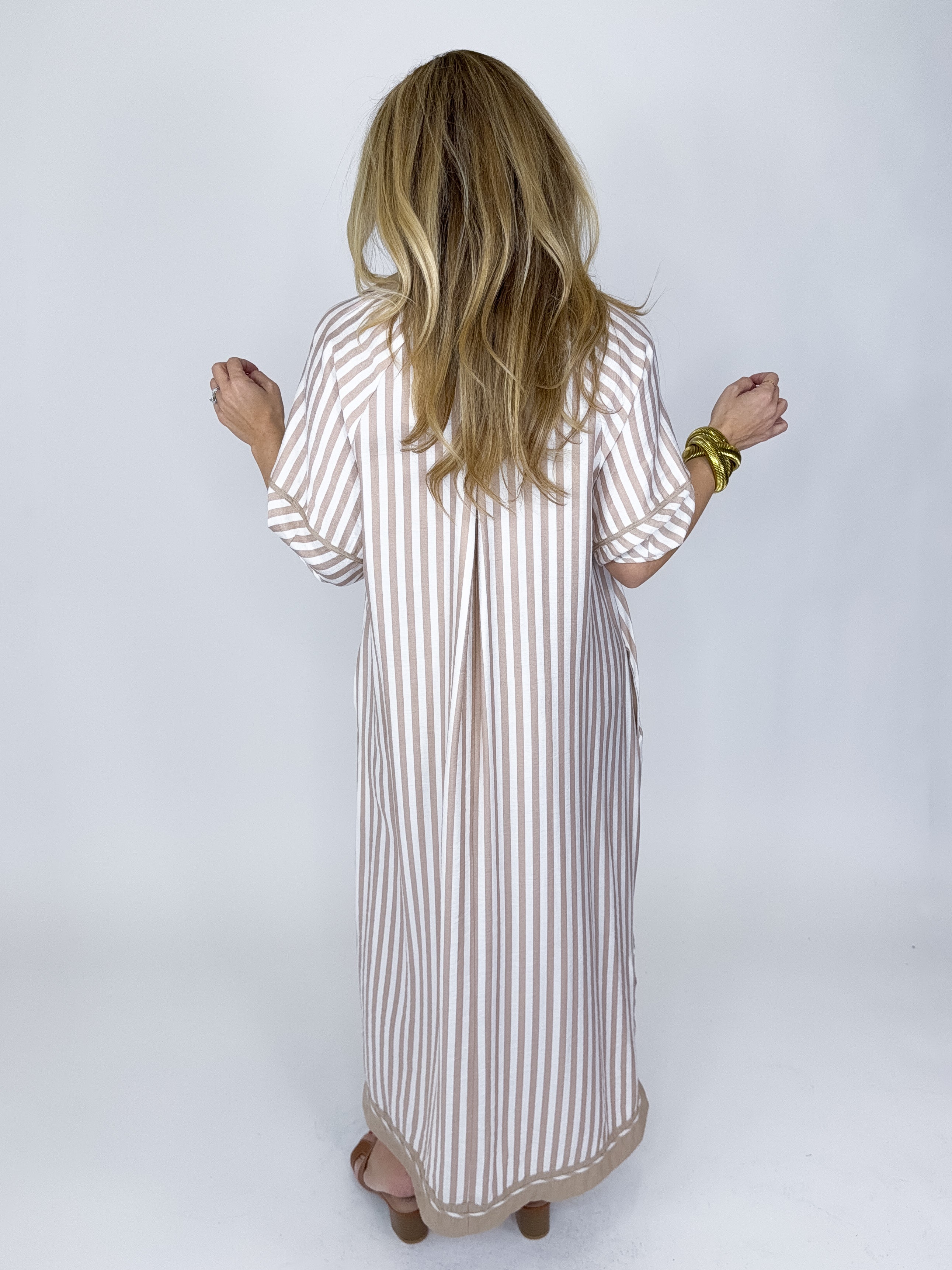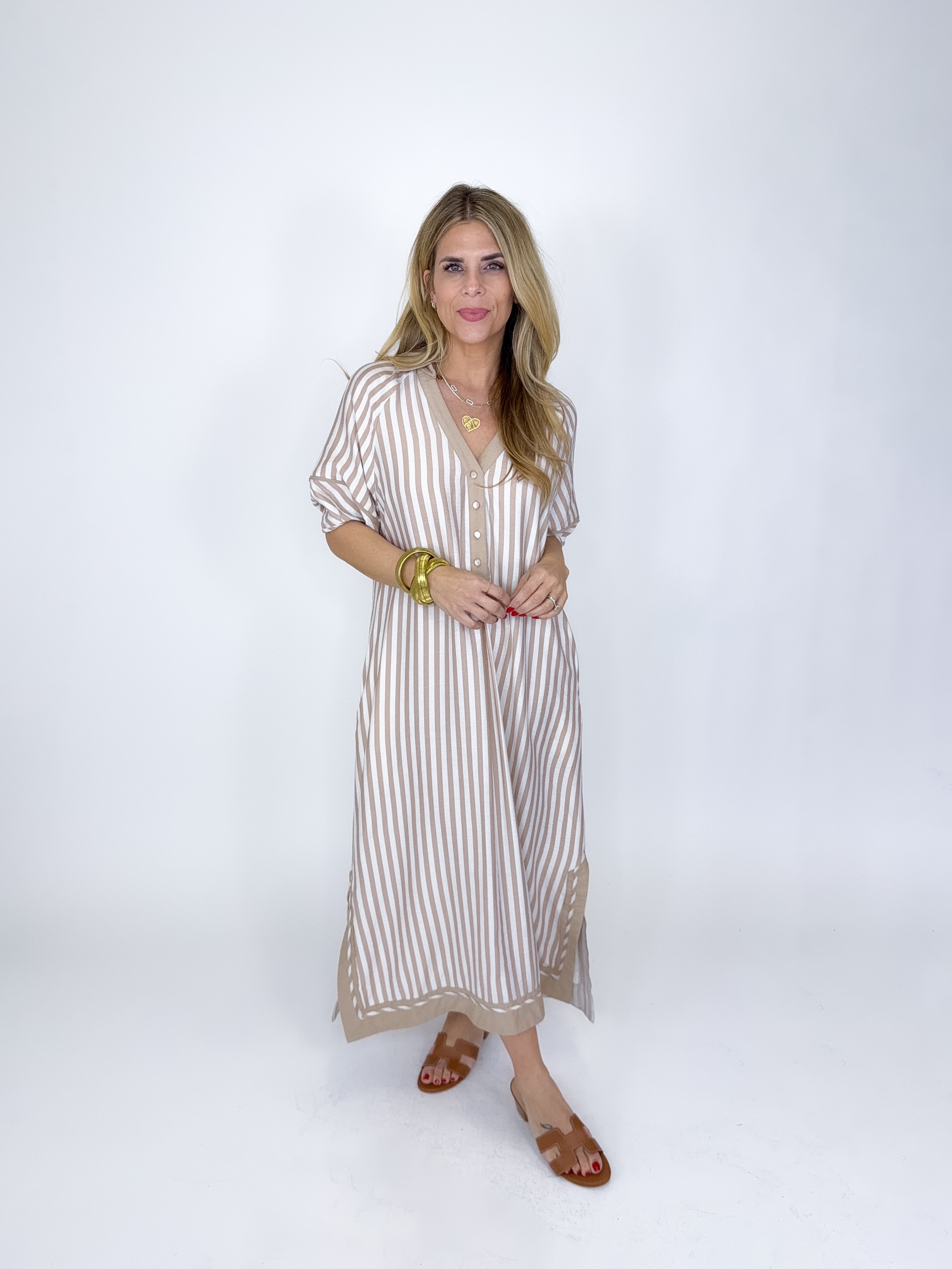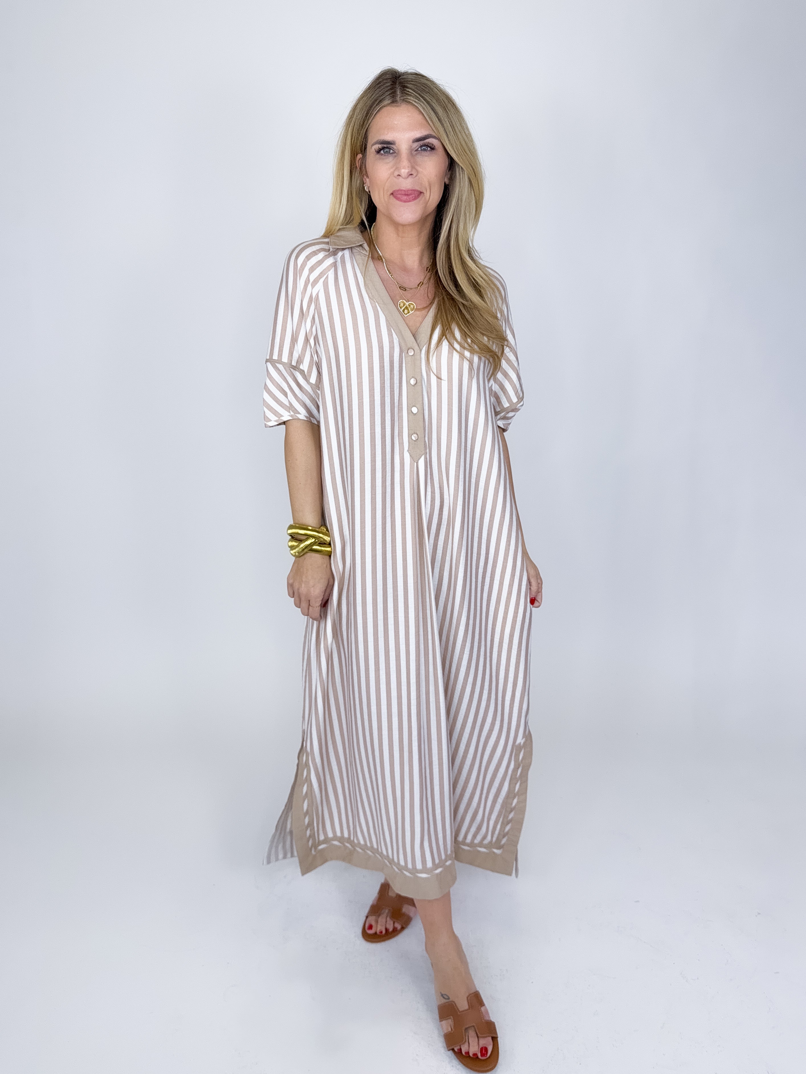 The Jayden Dress is a total classic! This taupe and white striped midi dress features a v-neck and collar, contrast trim, button front and a side slit. Pockets. Style with flats, wedges, sneakers and heels. Fits true to size.