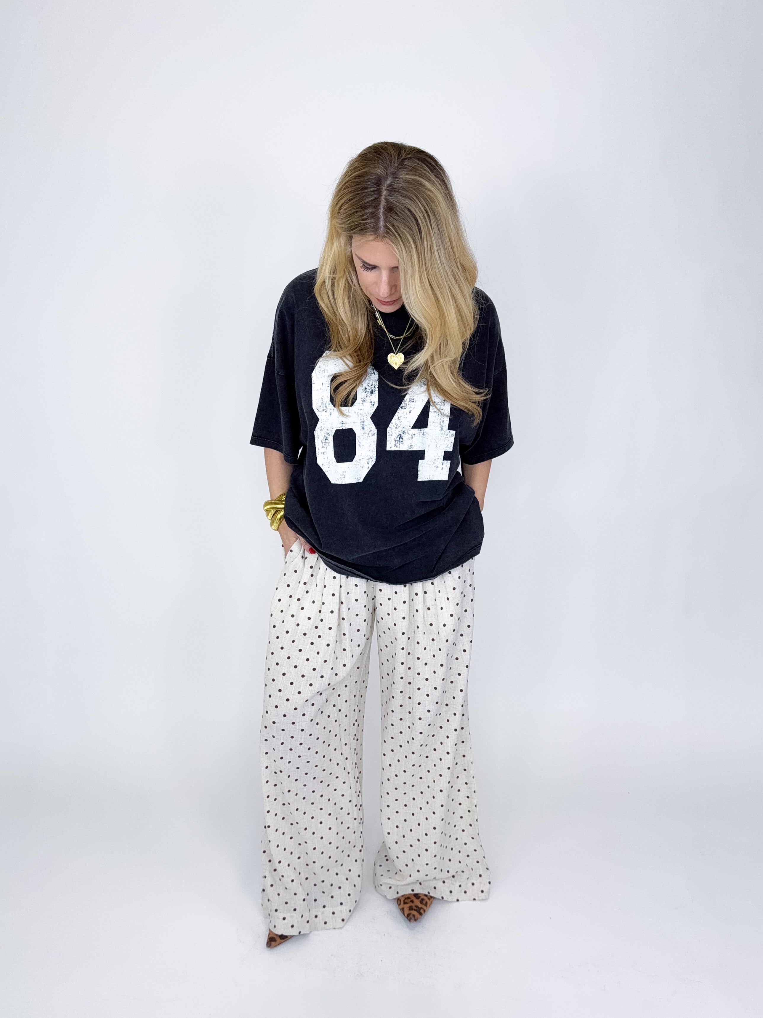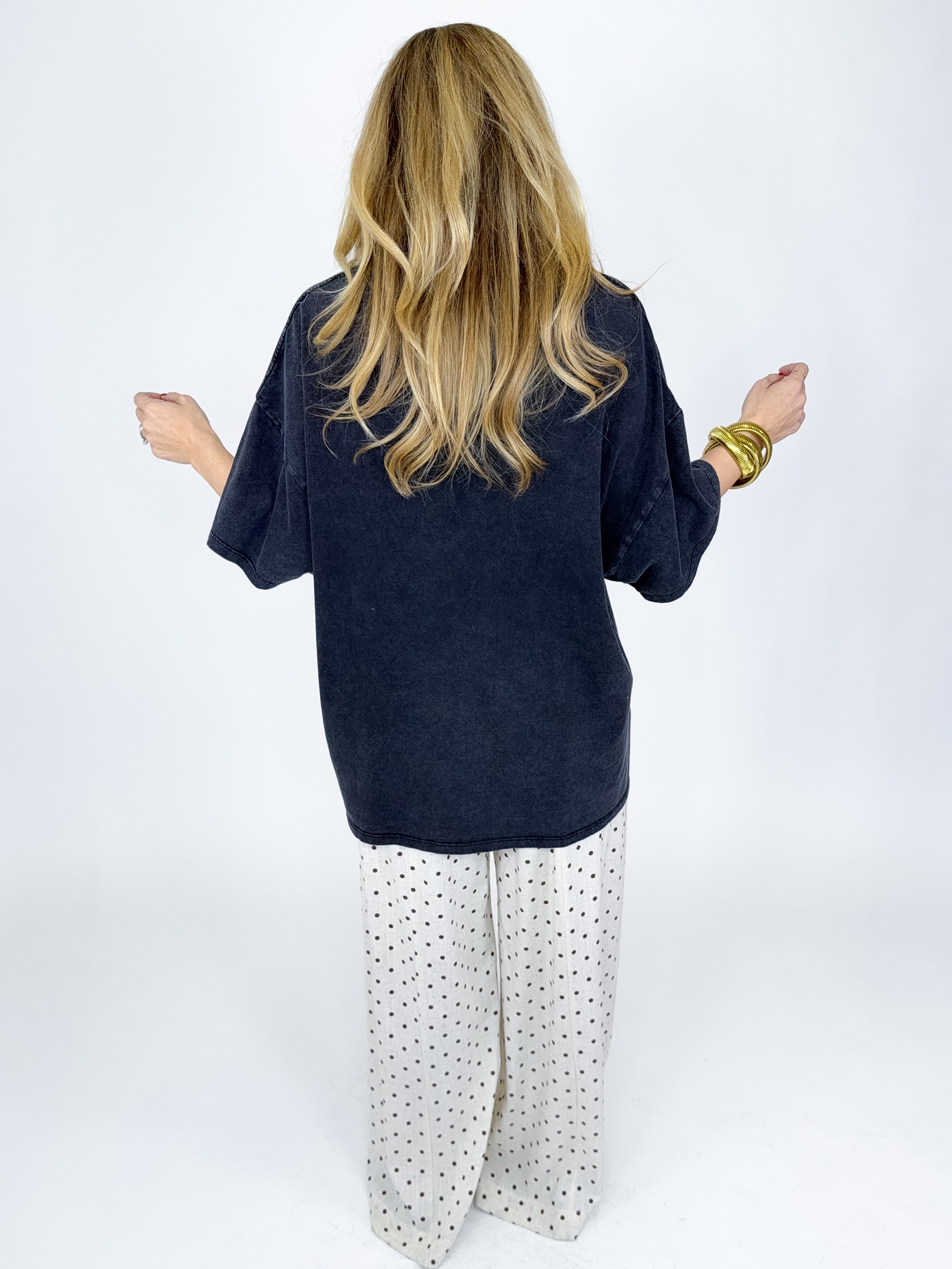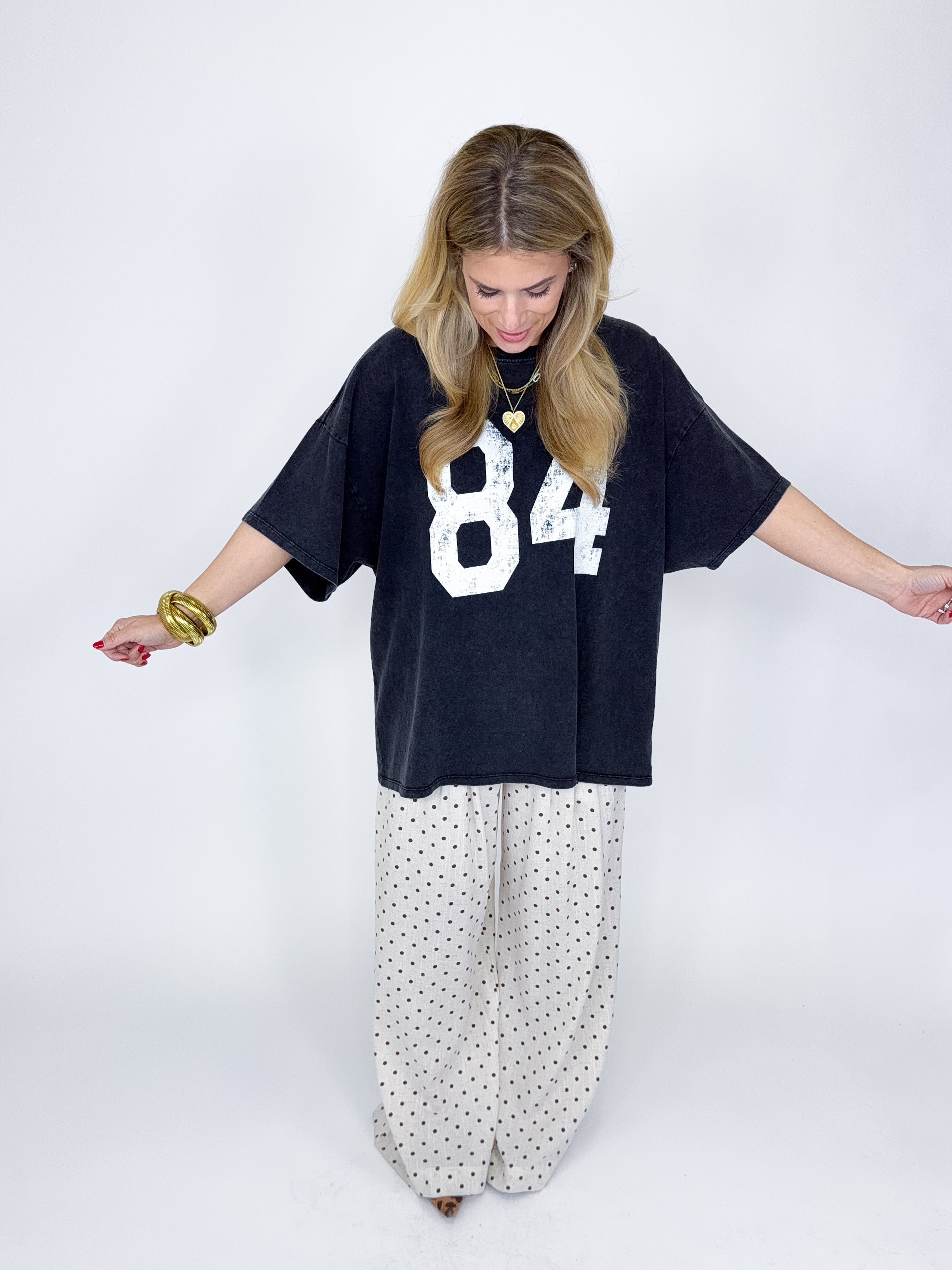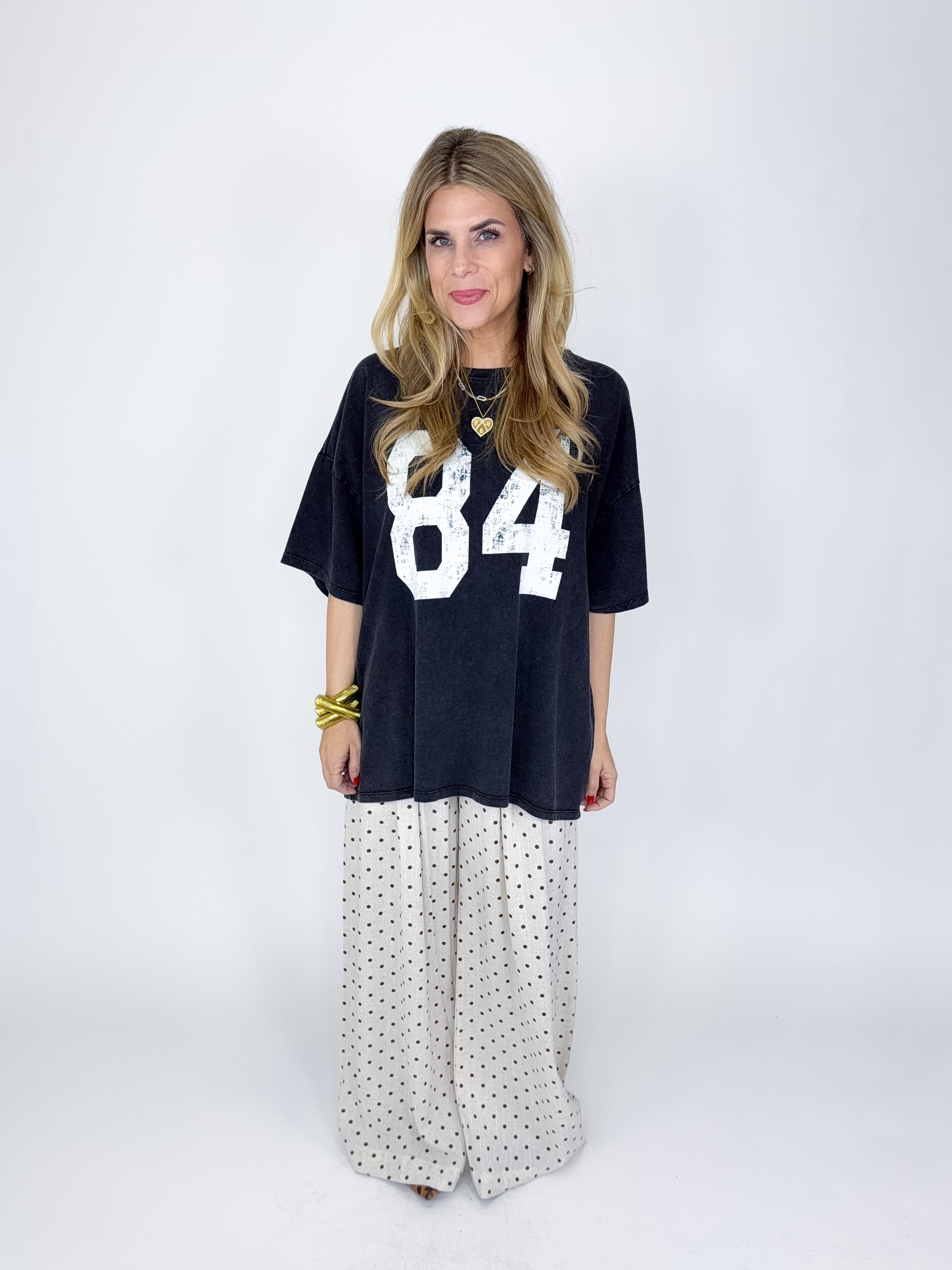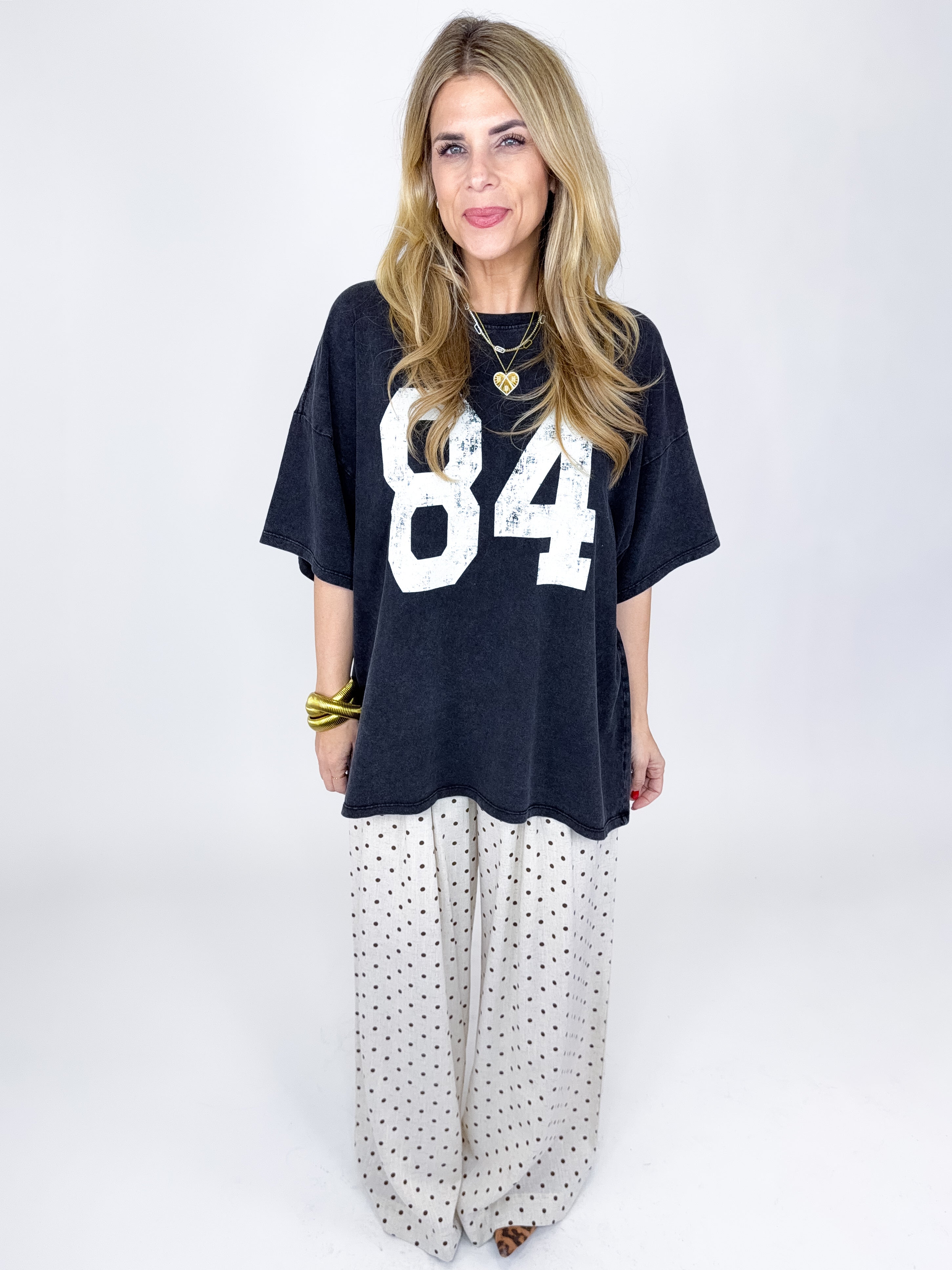 The Jones Tee is the perfect everyday top! This mineral washed tee features a crew neck, short drop sleeves, fun 84 graphic print on front and an oversized fit. A must have! Pairs well with everything from denim, flats, heels, skirts, leggings, sweatpants and more! Fits true to size.