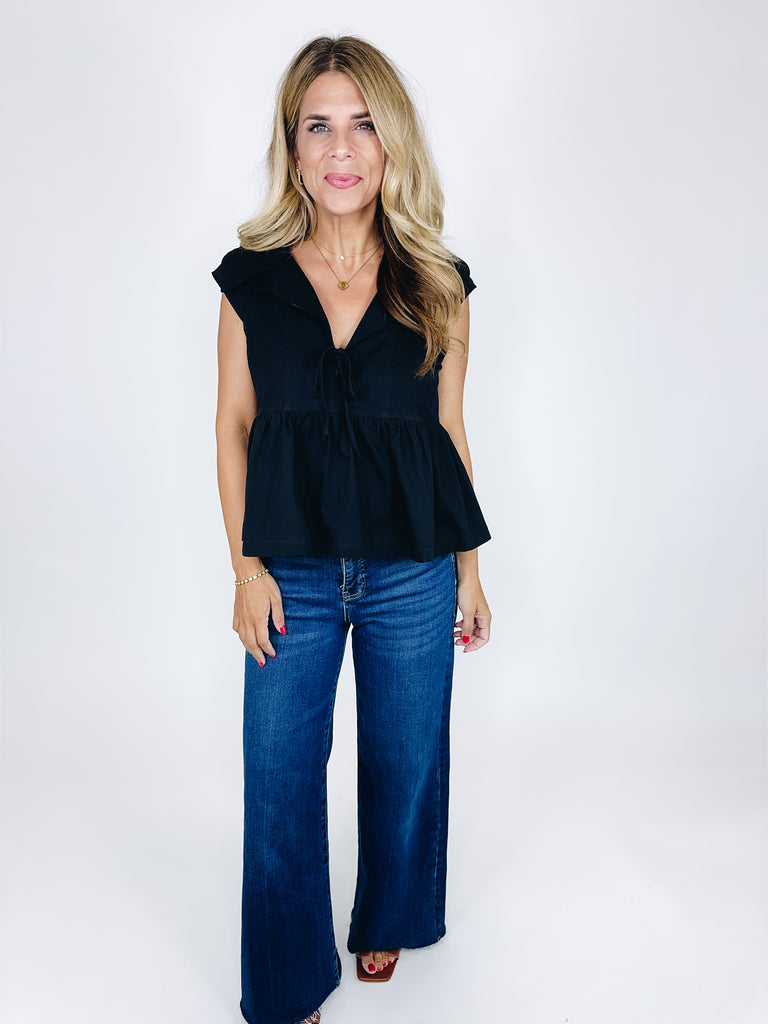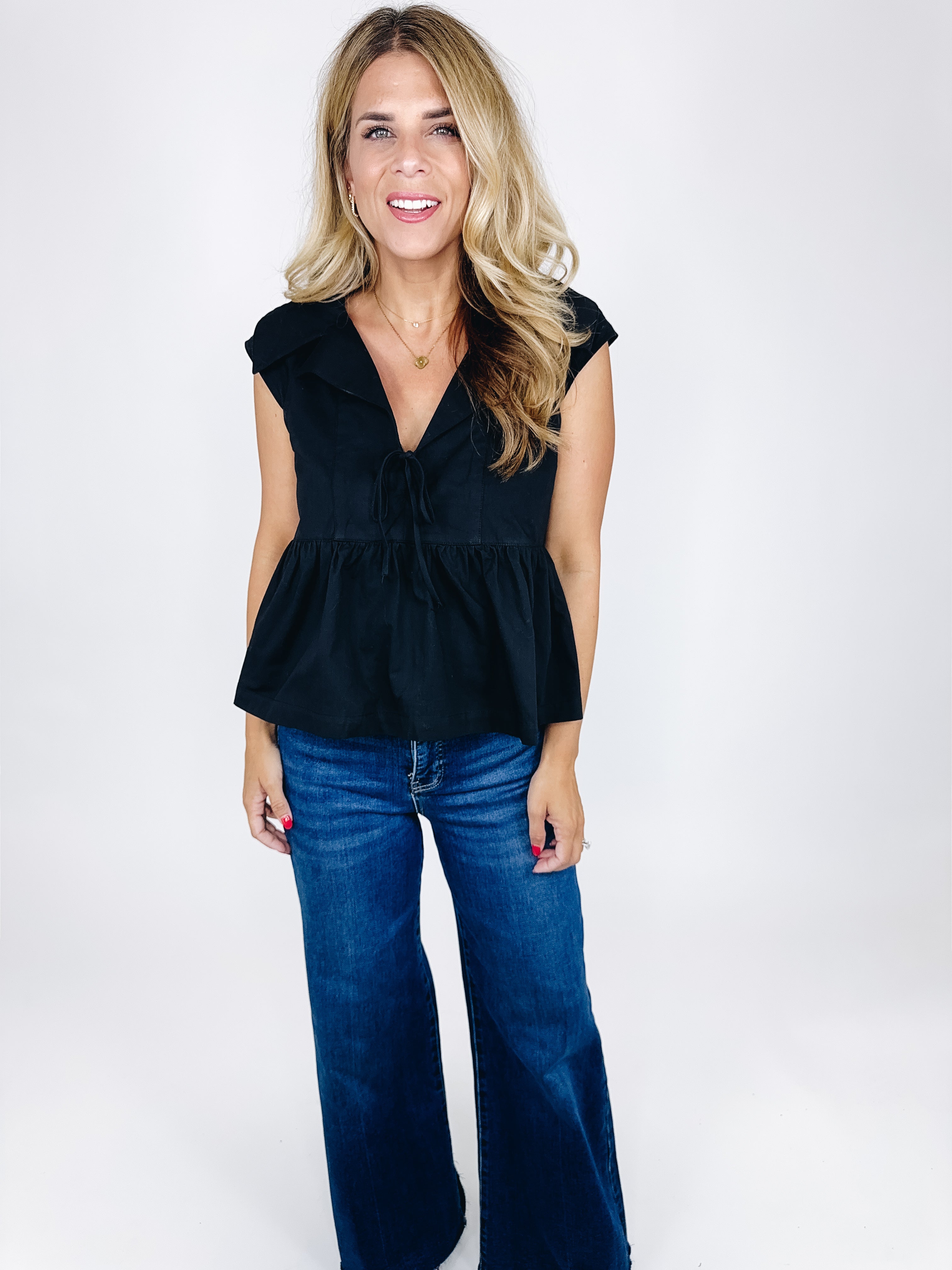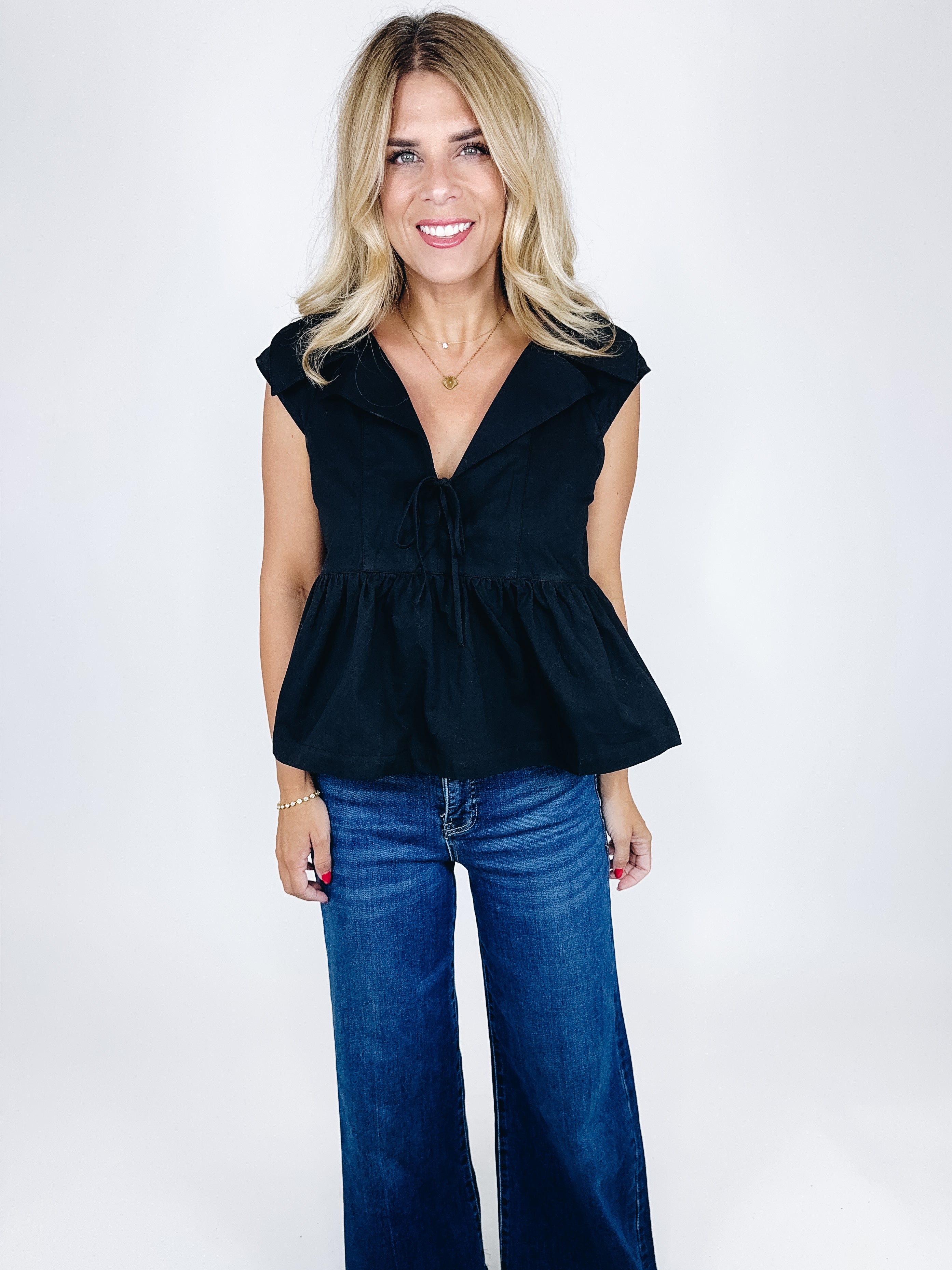 The Julian Top is the perfect black top! This blouse features a sleeveless silhouette, collar neckline with a tie front, and a skimmer length with a peplum hem. Pairs well with everything from denim, flats, heels, dress pants, skirts and more! Fits true to size.