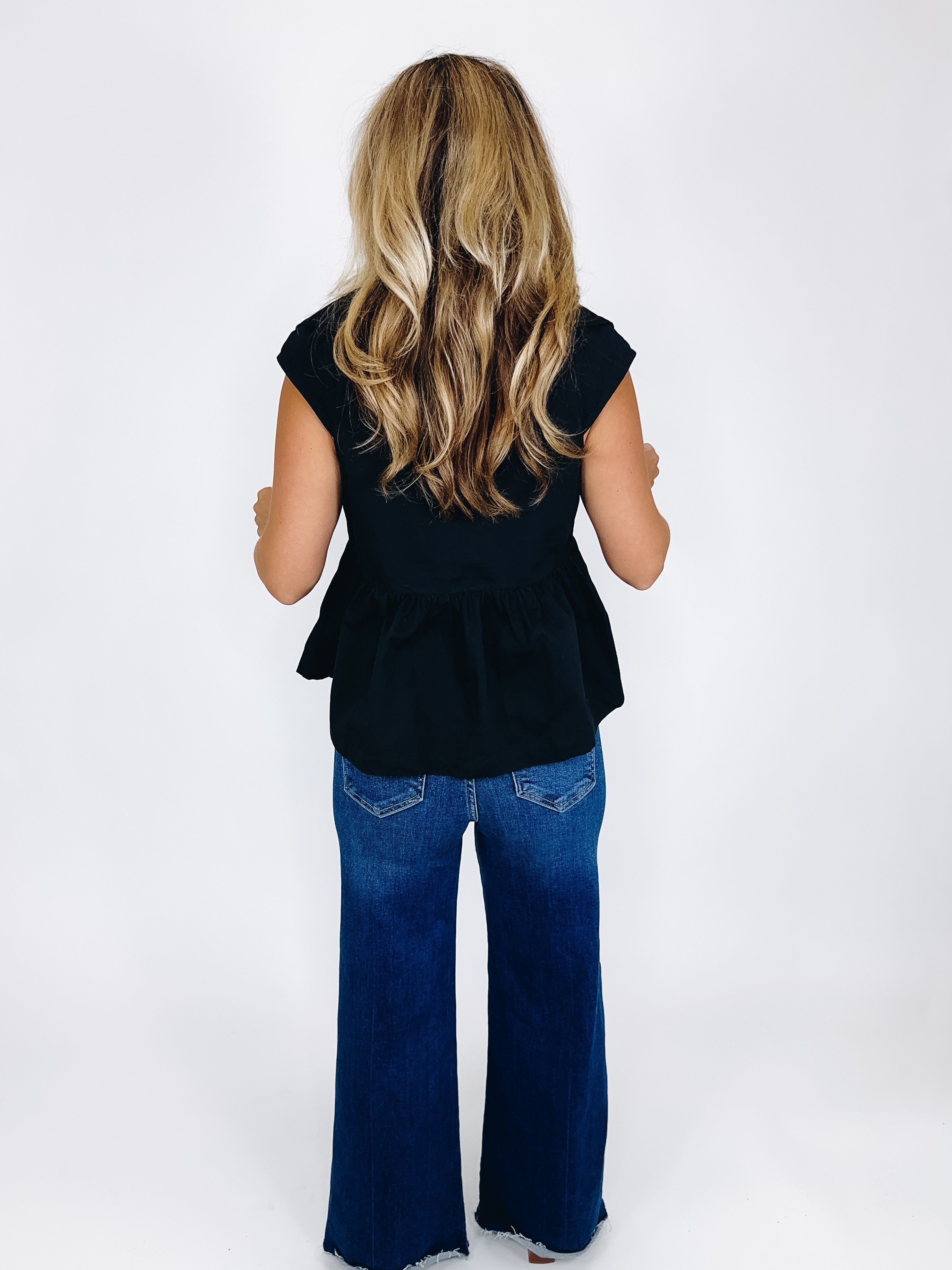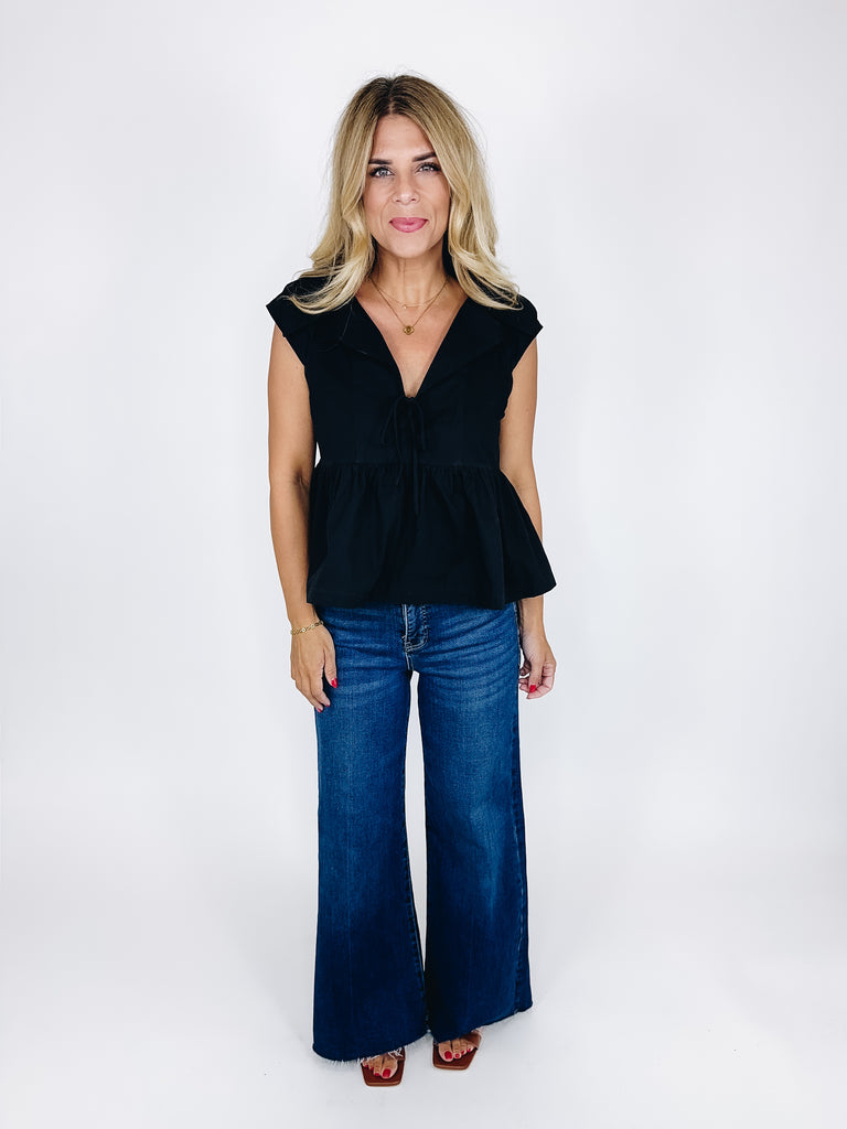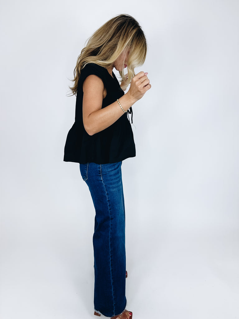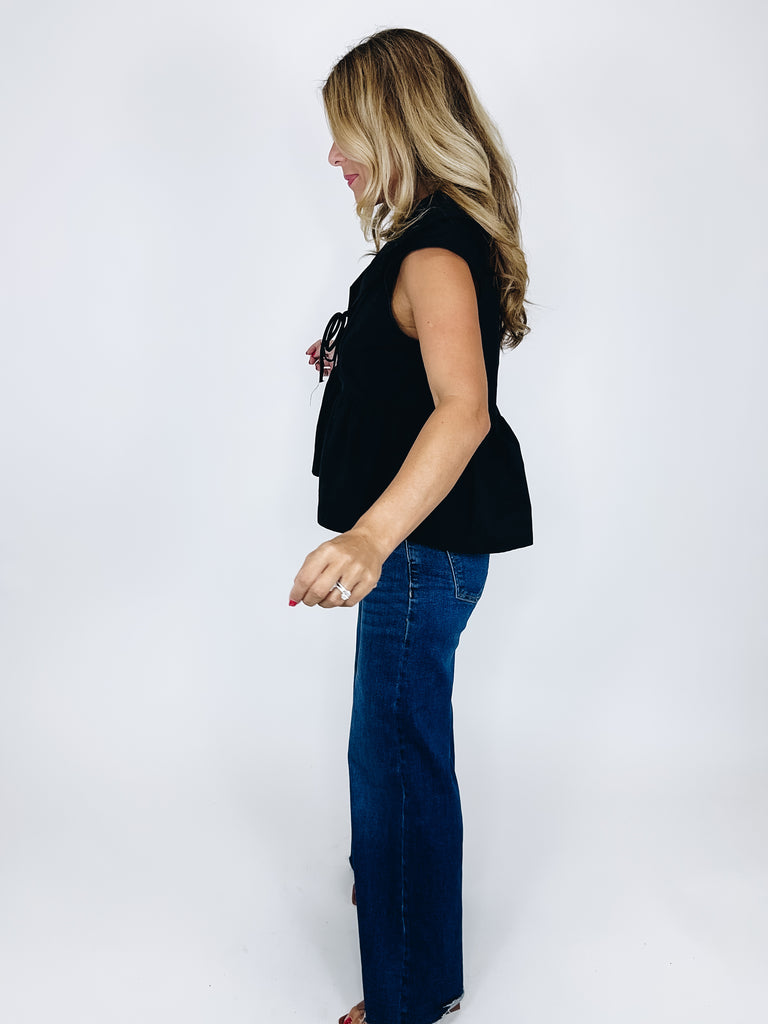 The Julian Top is the perfect black top! This blouse features a sleeveless silhouette, collar neckline with a tie front, and a skimmer length with a peplum hem. Pairs well with everything from denim, flats, heels, dress pants, skirts and more! Fits true to size.