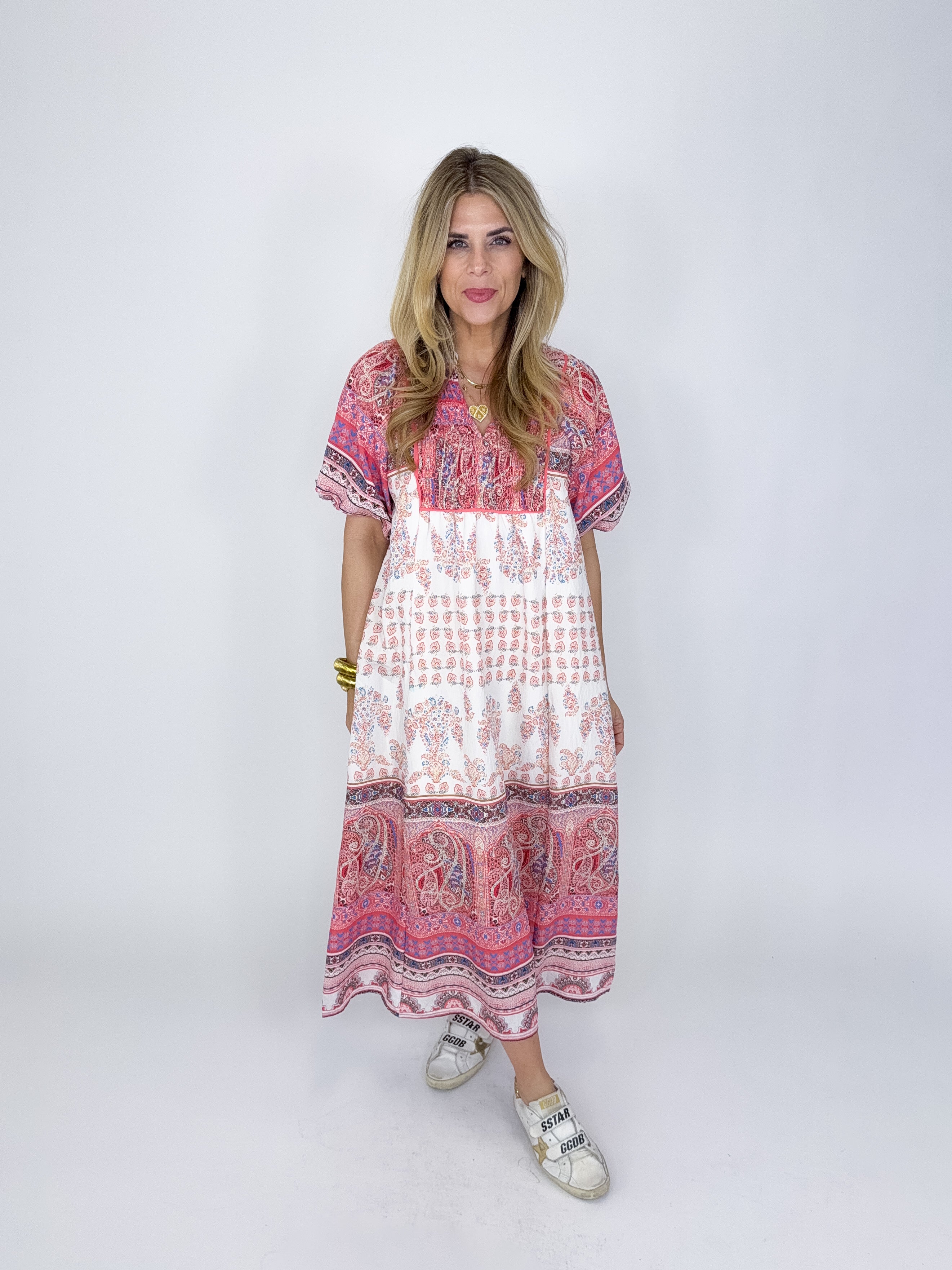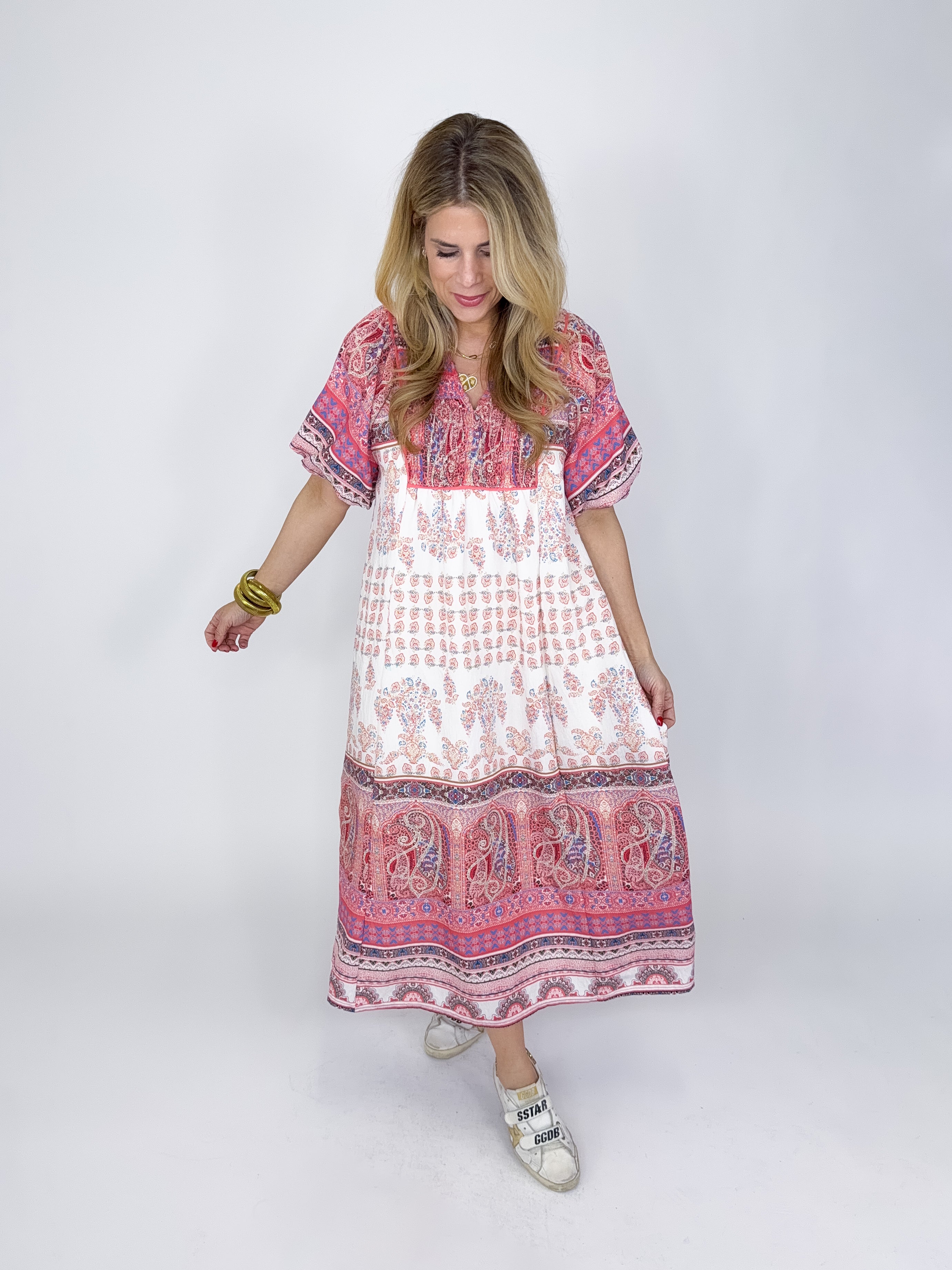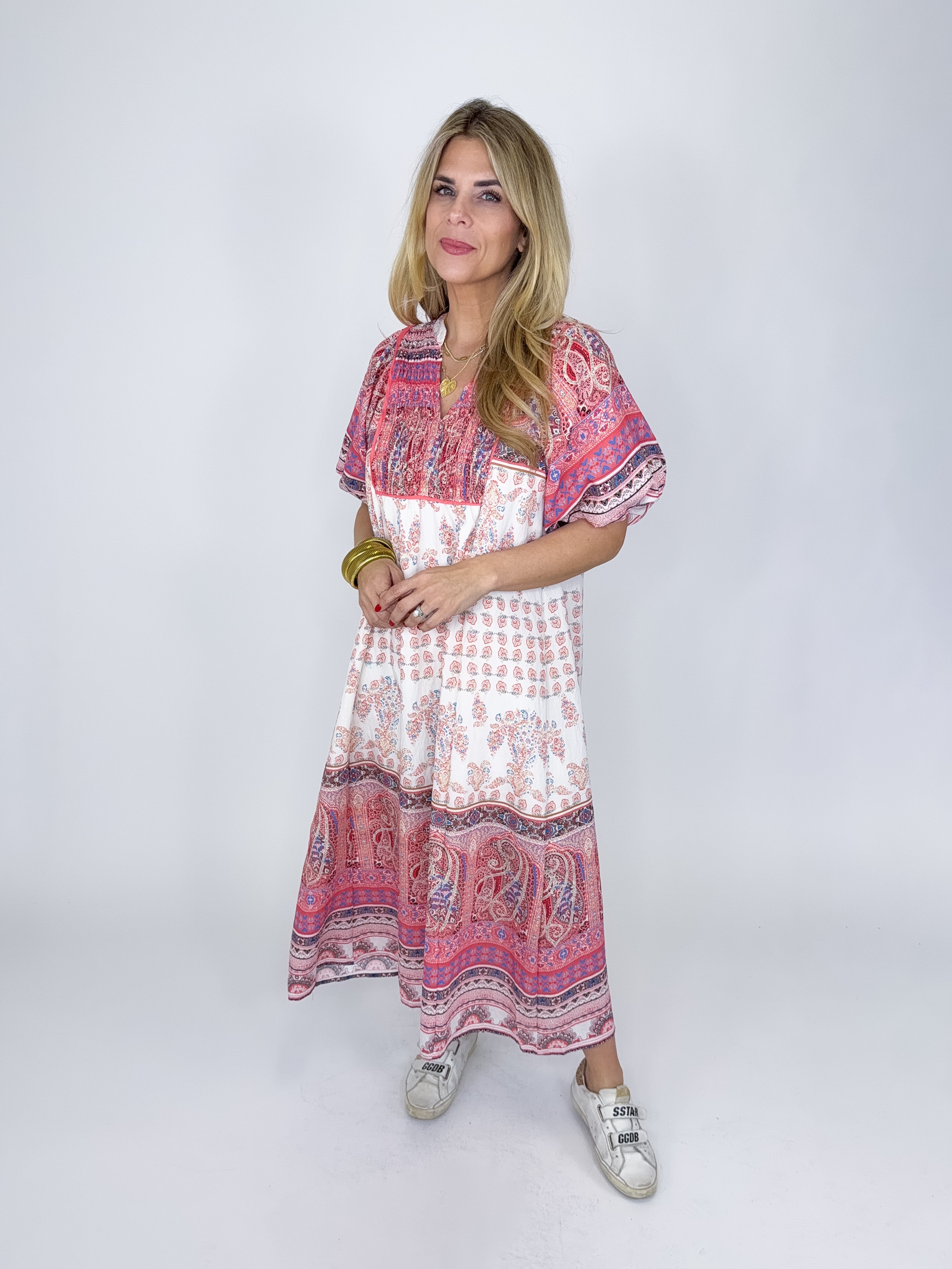 The Laken Dress is darling! This pink boho floral print dress features s notched neck, smocked bodice, short puff sleeves and an easy fit. Lined. Style with flat sandals, wedges and even sneakers! Dress up or down. Fits true to size.