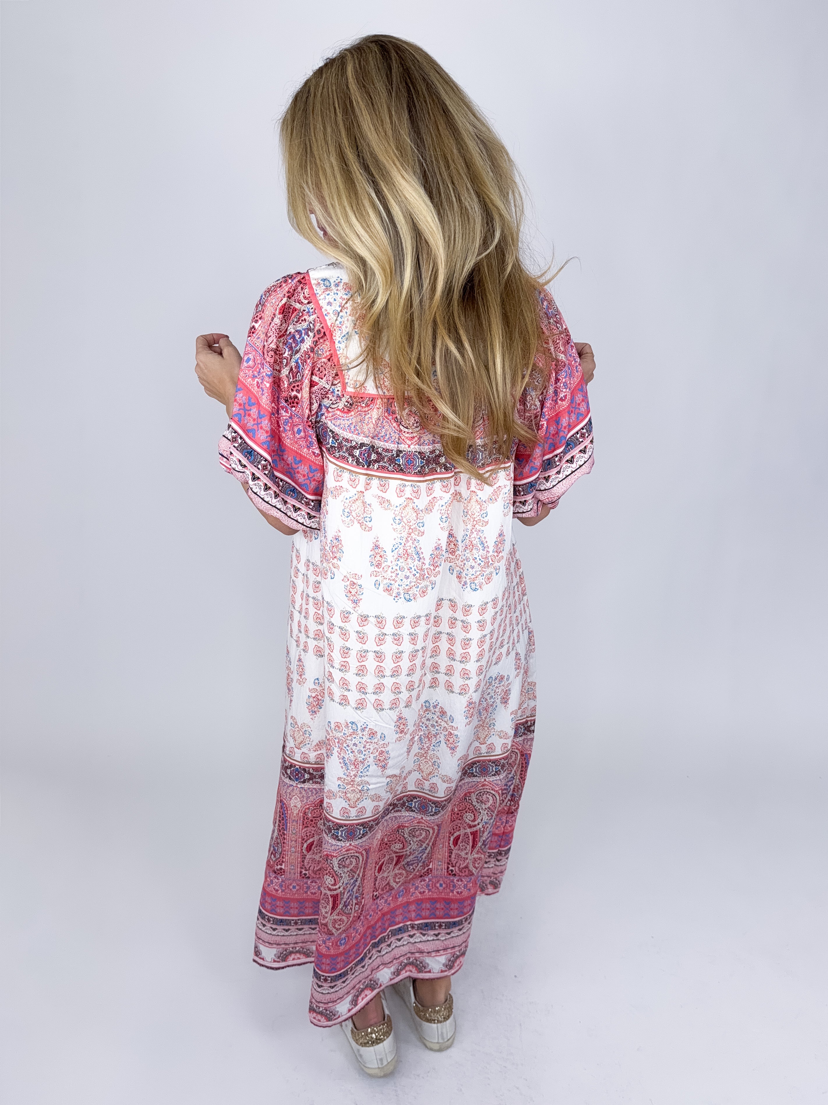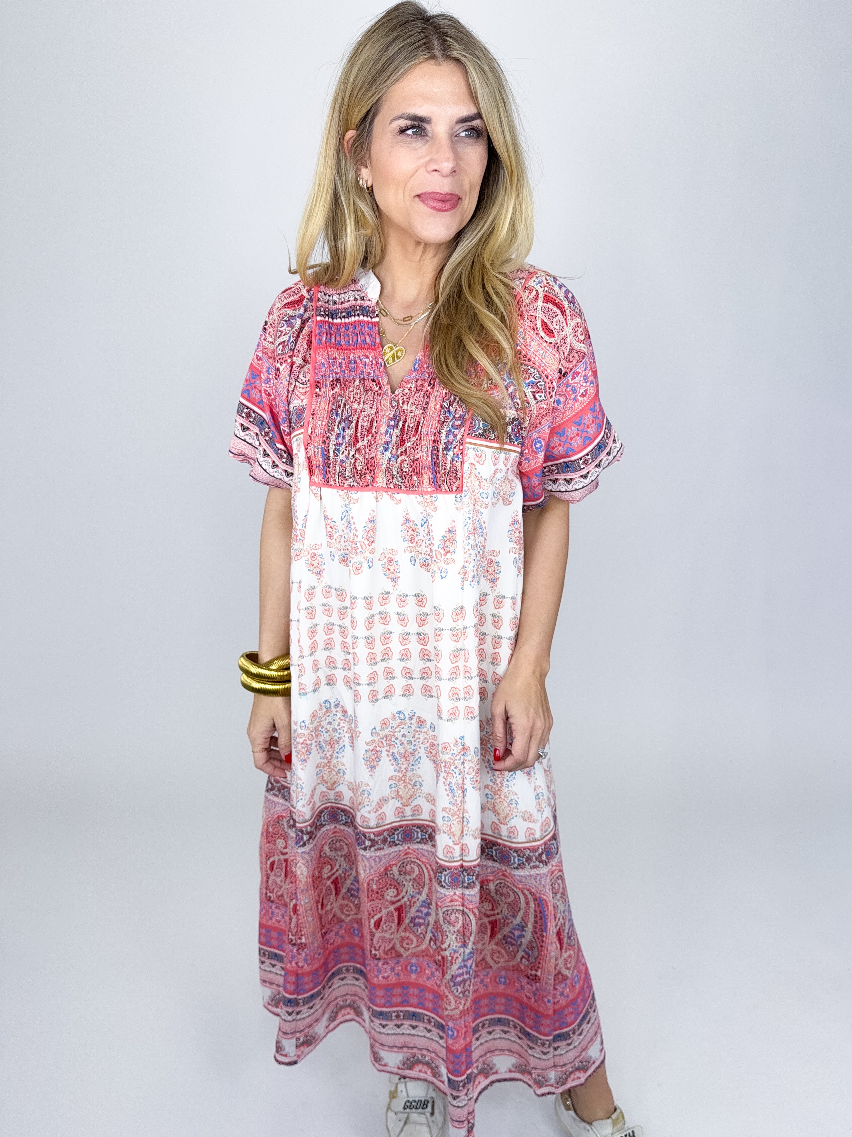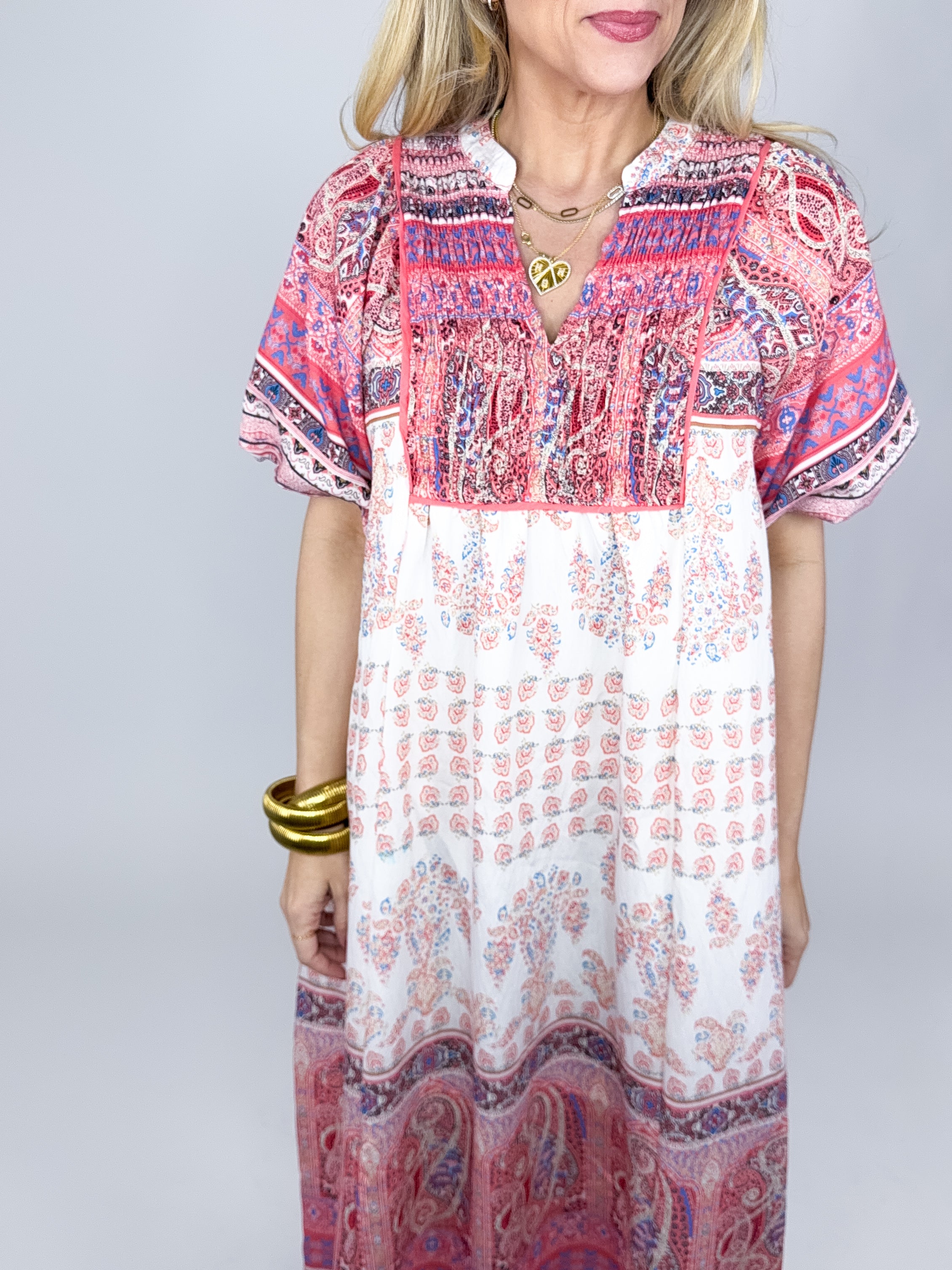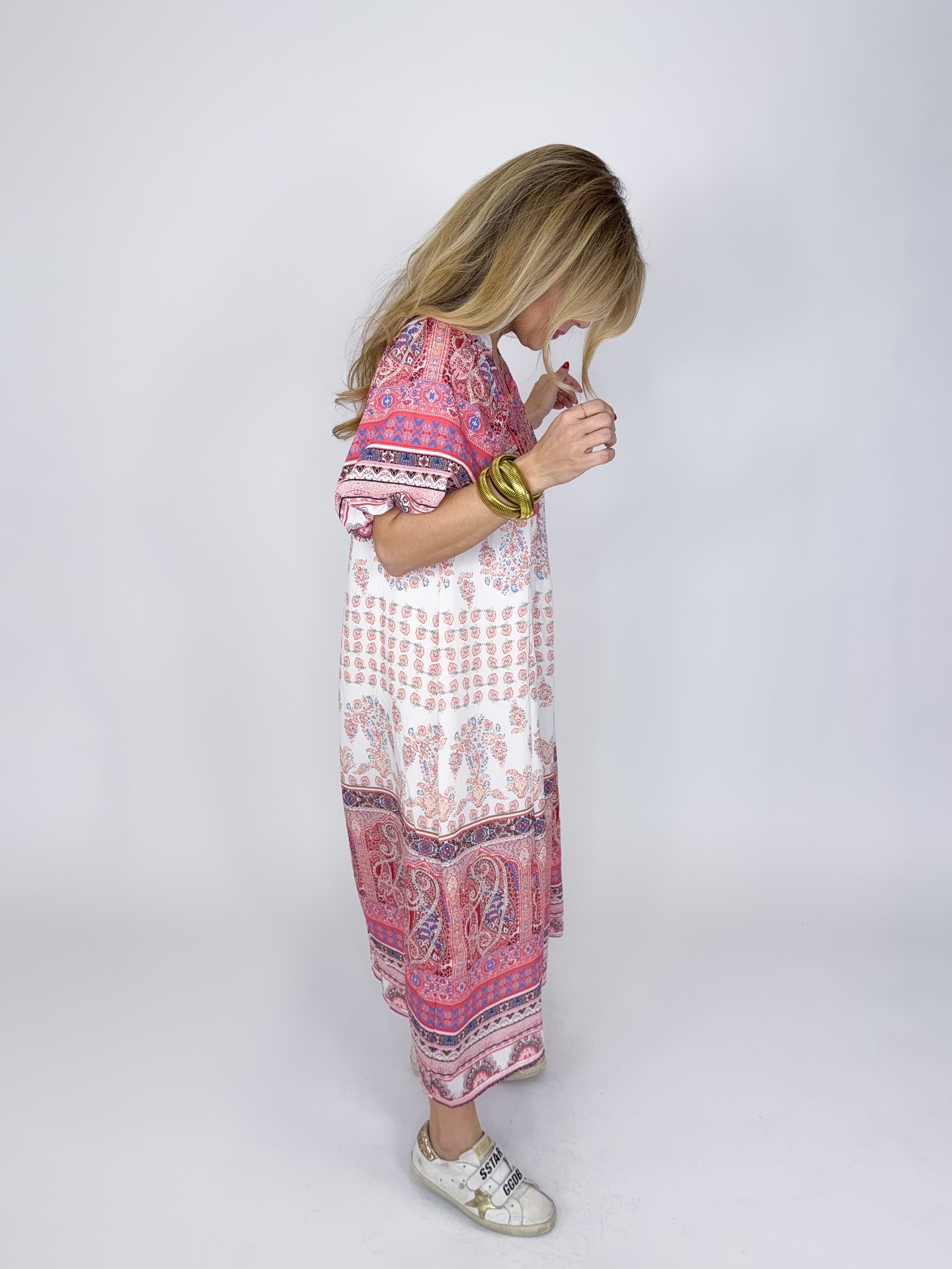 The Laken Dress is darling! This pink boho floral print dress features s notched neck, smocked bodice, short puff sleeves and an easy fit. Lined. Style with flat sandals, wedges and even sneakers! Dress up or down. Fits true to size.