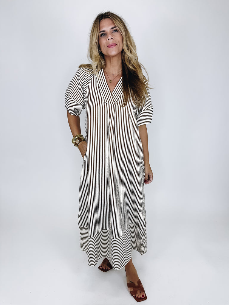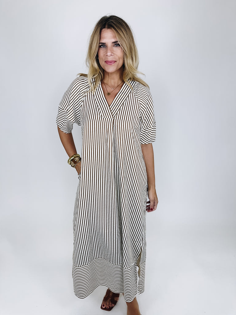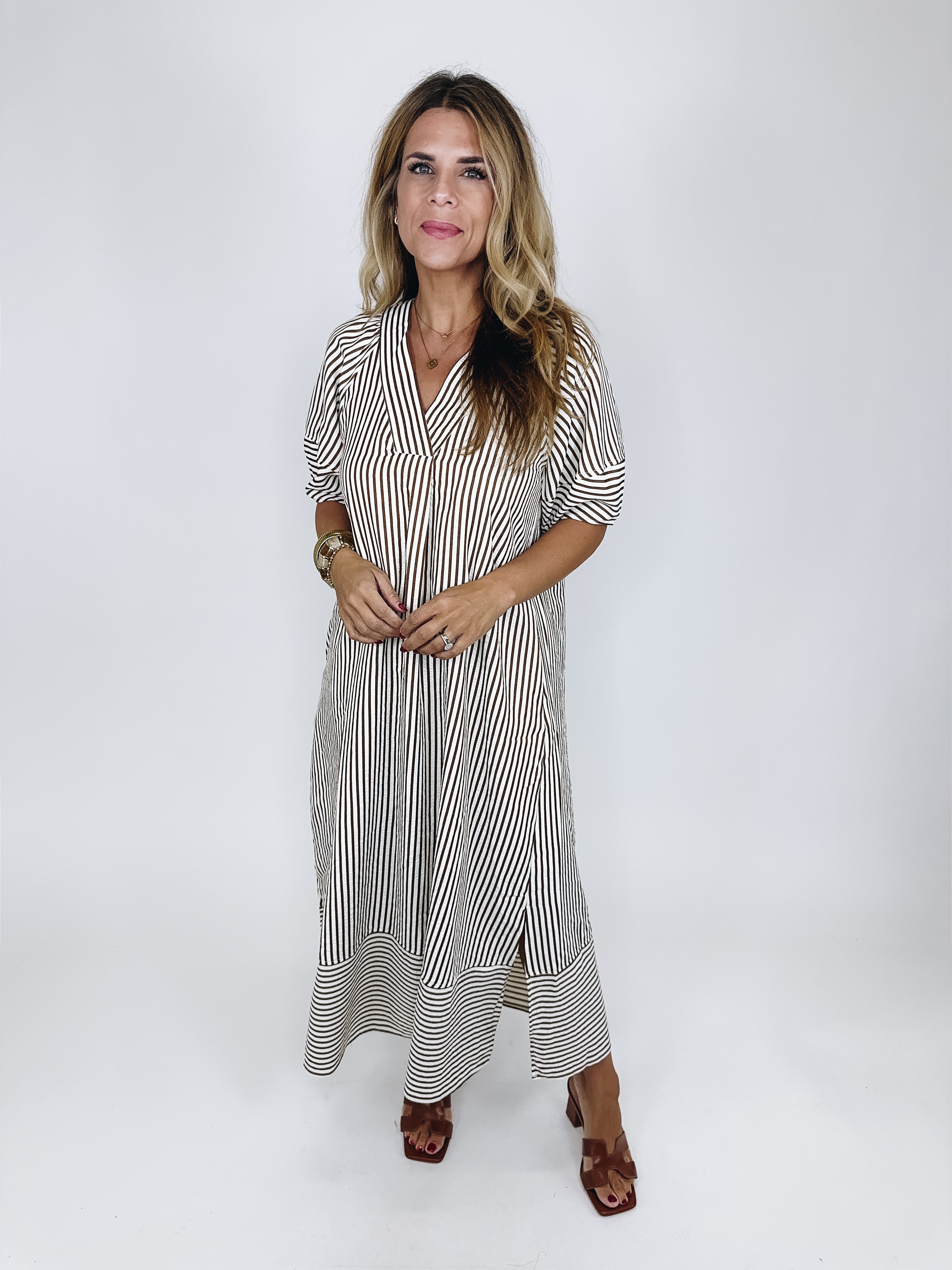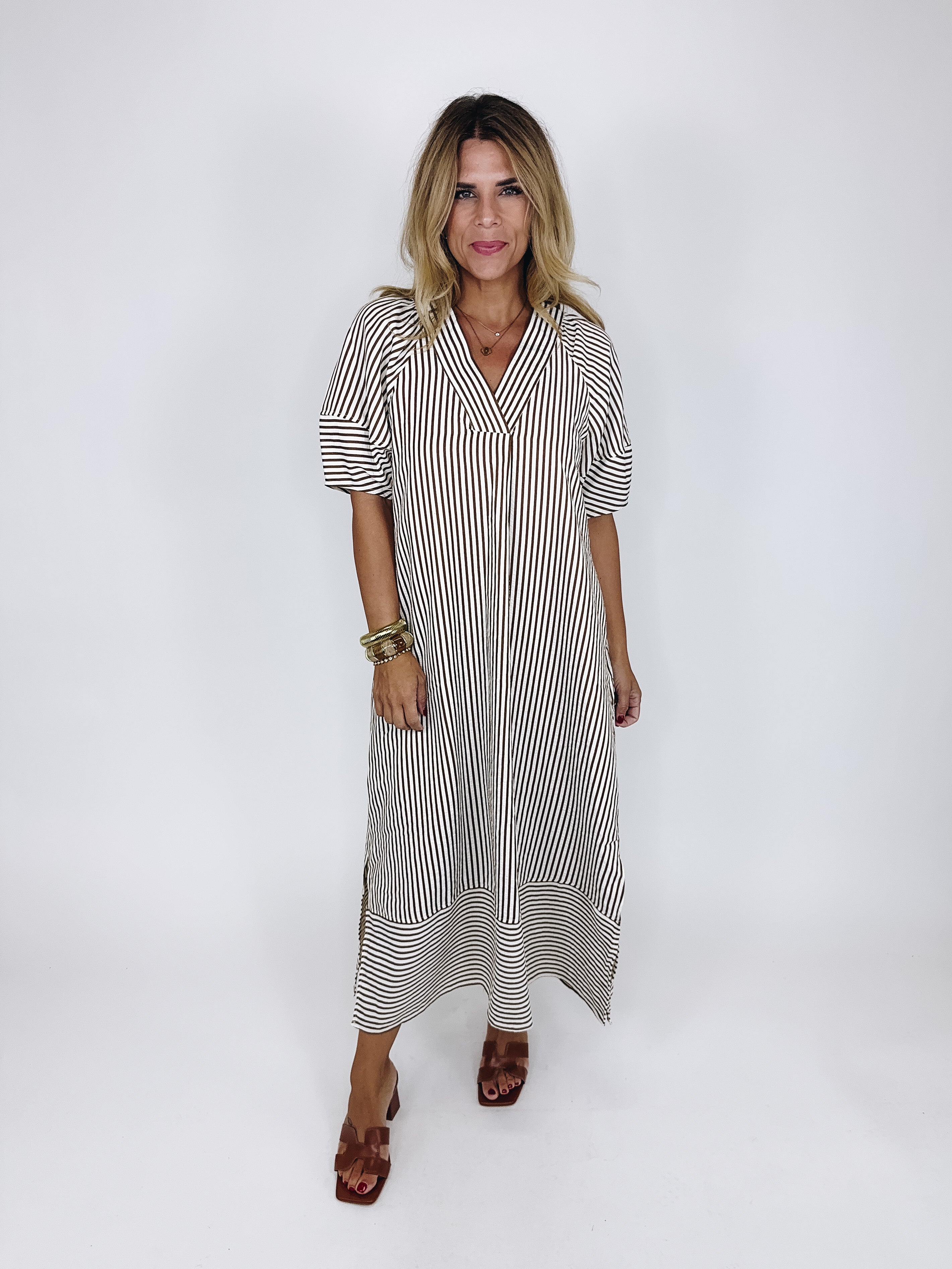 The Lily Dress is a total classic! This taupe striped maxi shirt dress features a v-neck, short balloon sleeves, split hem with coordinating stripe and a lined skirt. Pockets. Style with flats, wedges, sneakers and heels. Fits true to size.