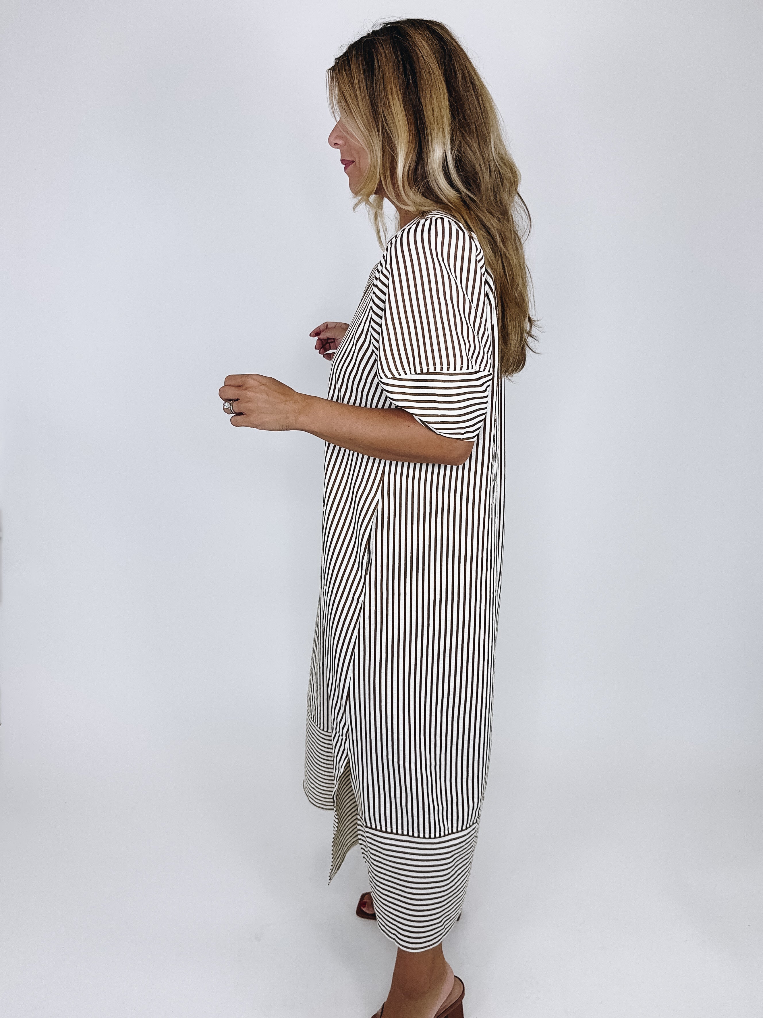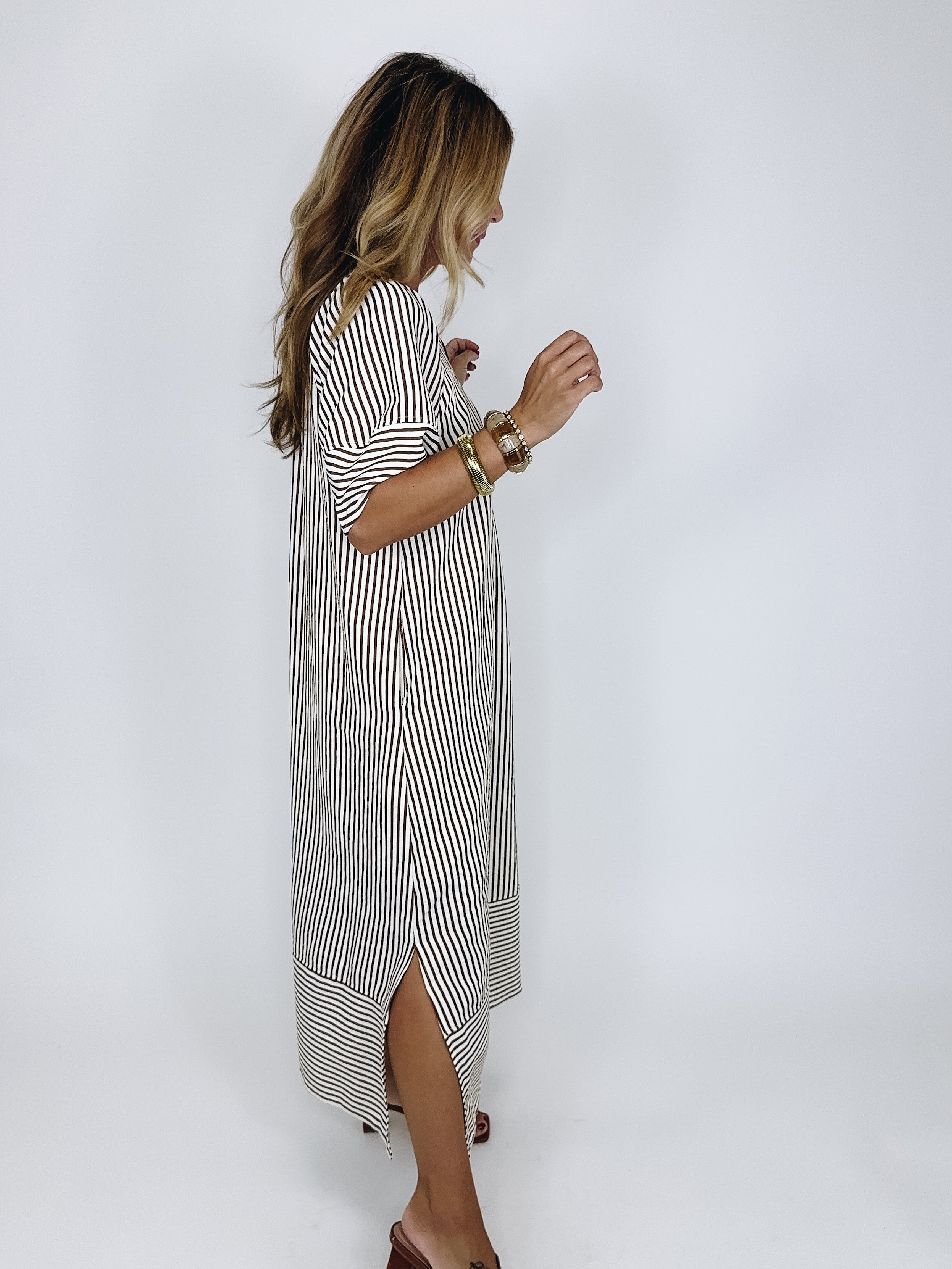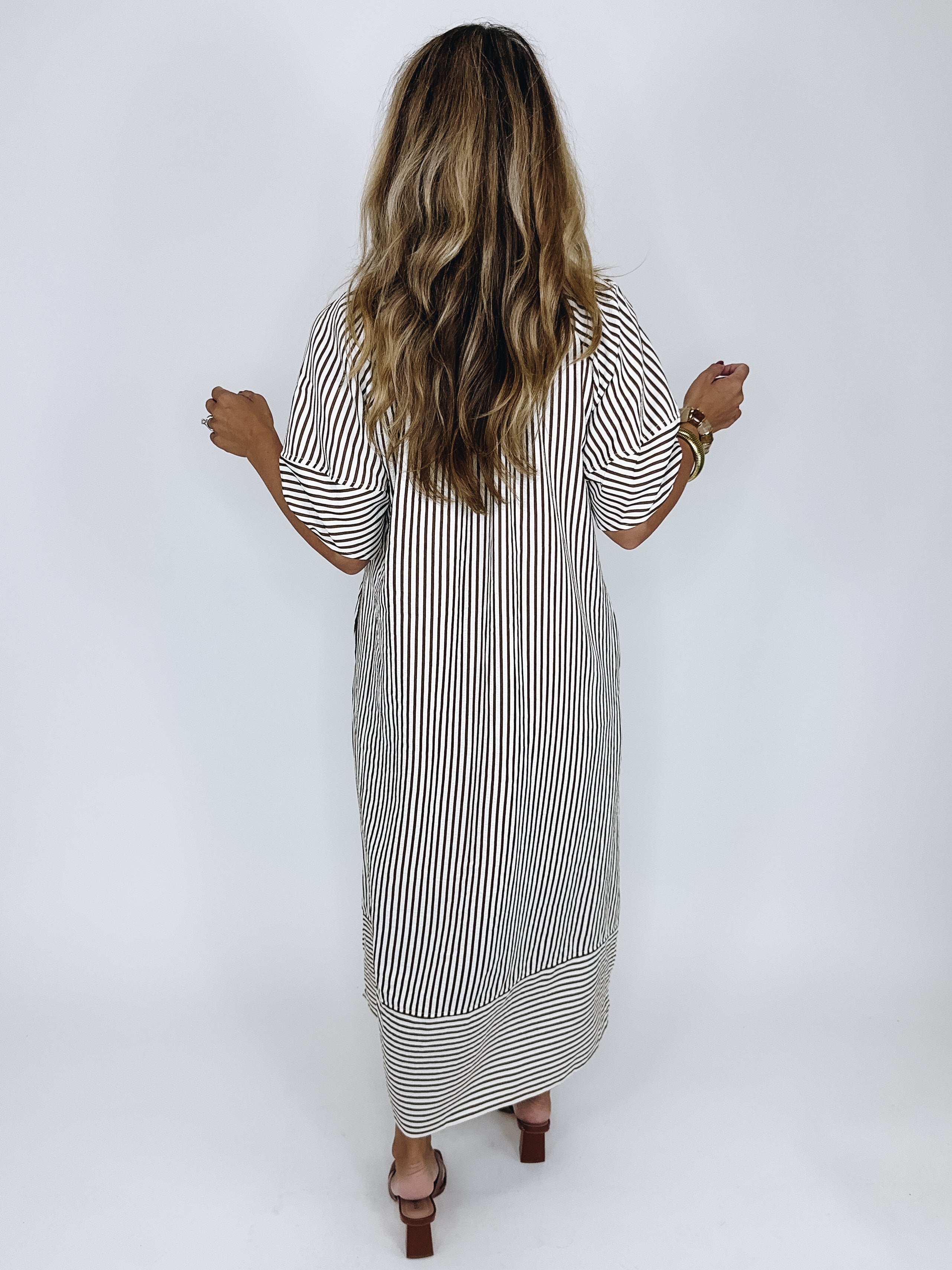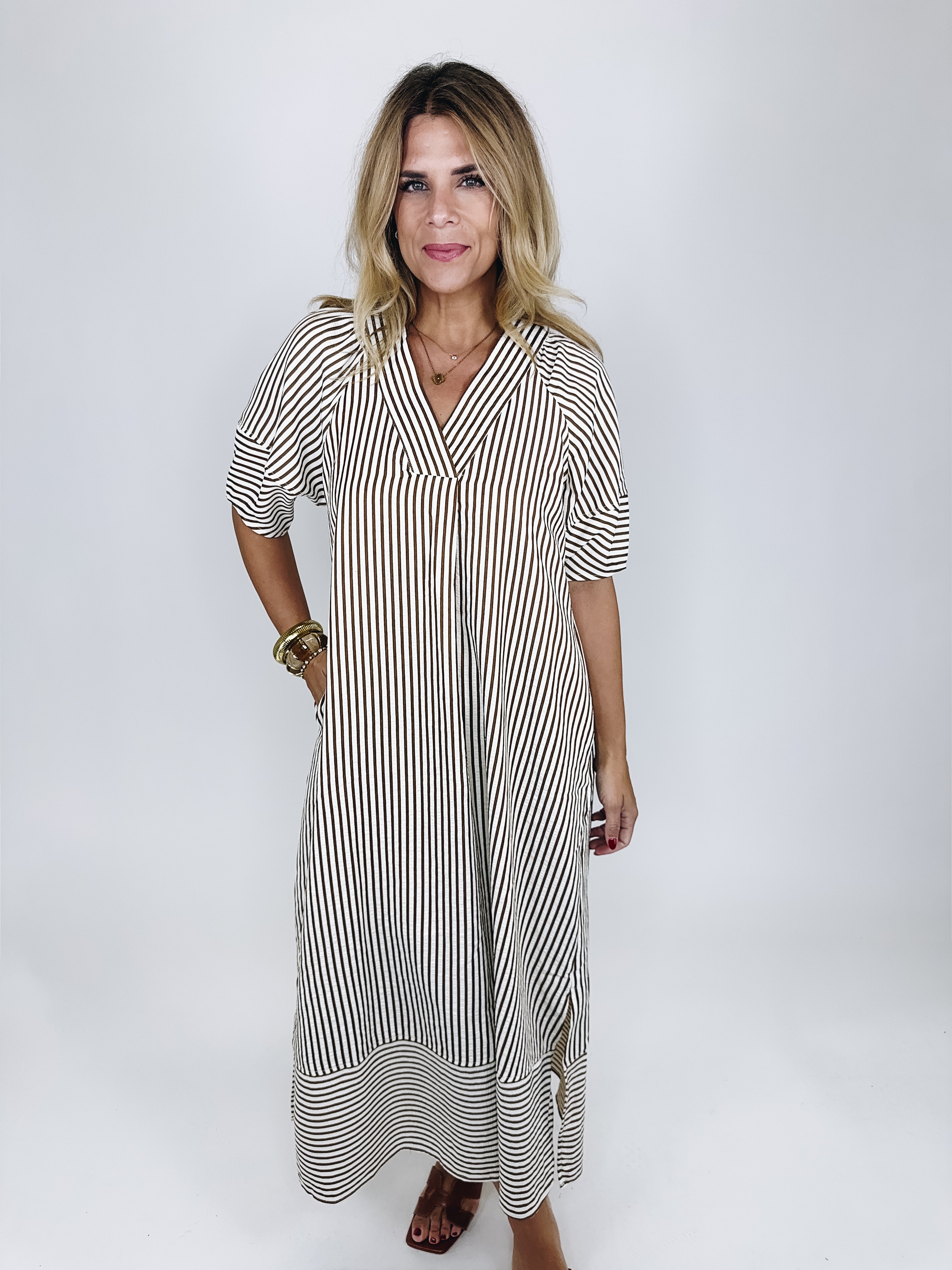 The Lily Dress is a total classic! This taupe striped maxi shirt dress features a v-neck, short balloon sleeves, split hem with coordinating stripe and a lined skirt. Pockets. Style with flats, wedges, sneakers and heels. Fits true to size.
