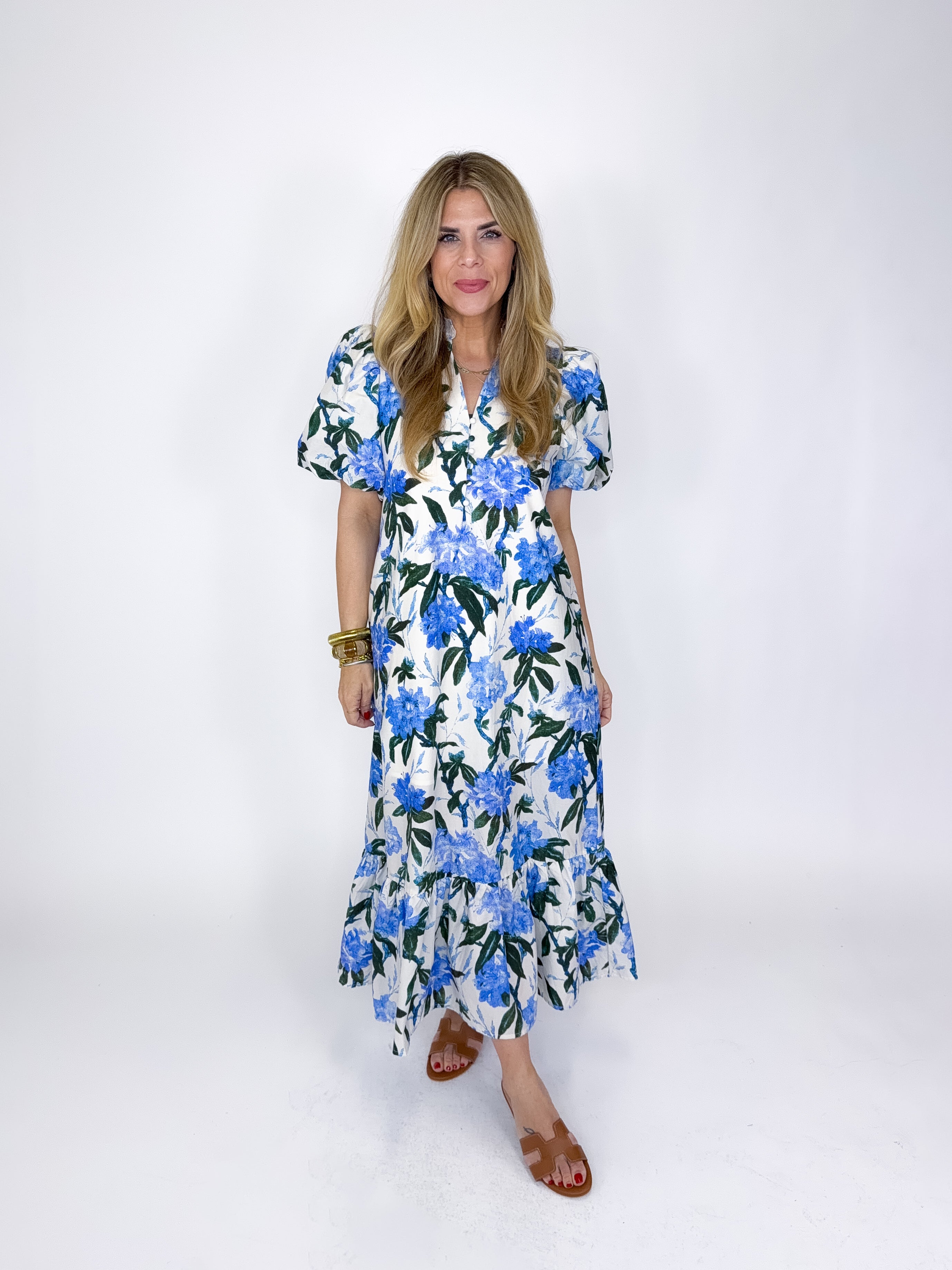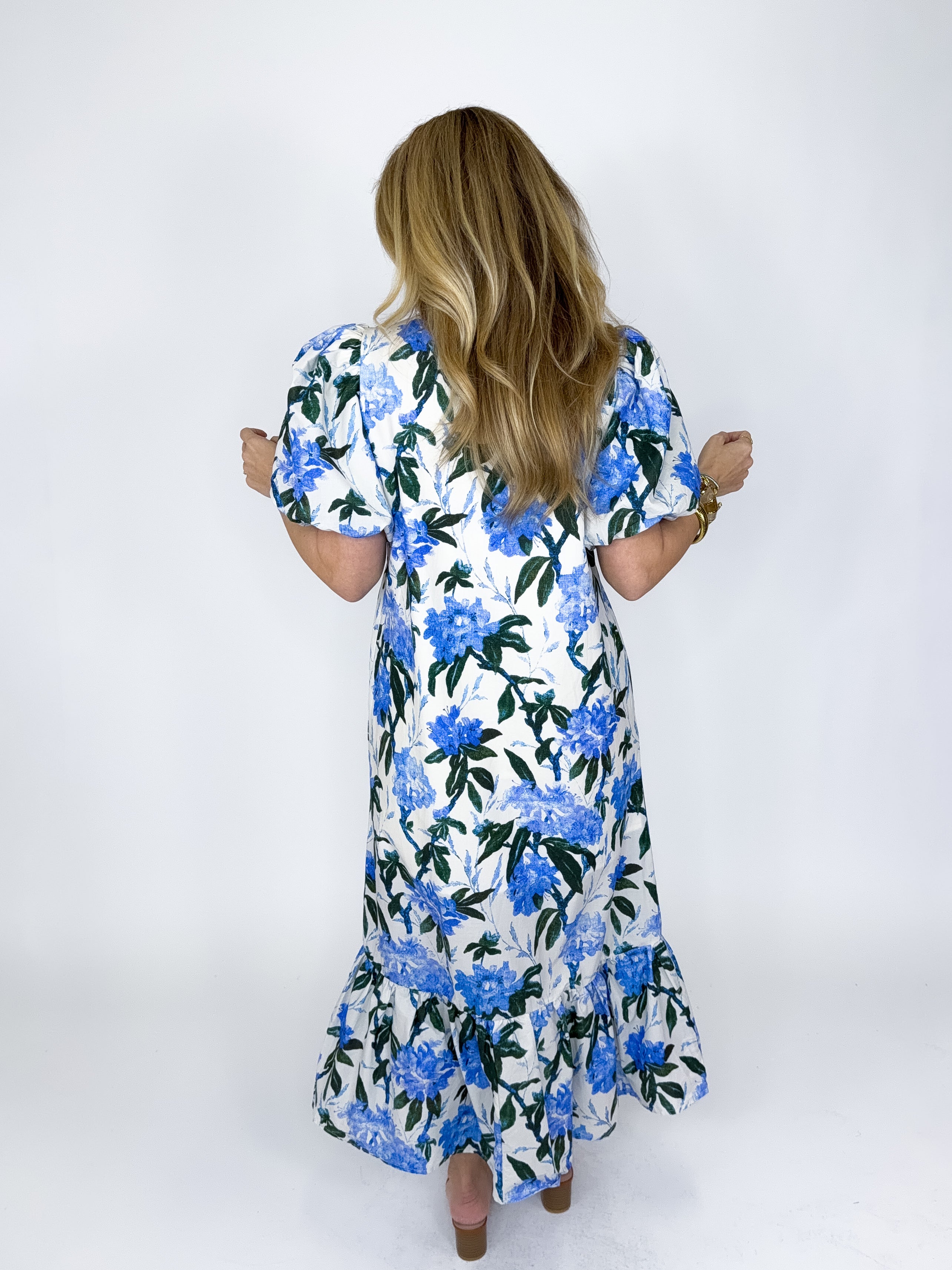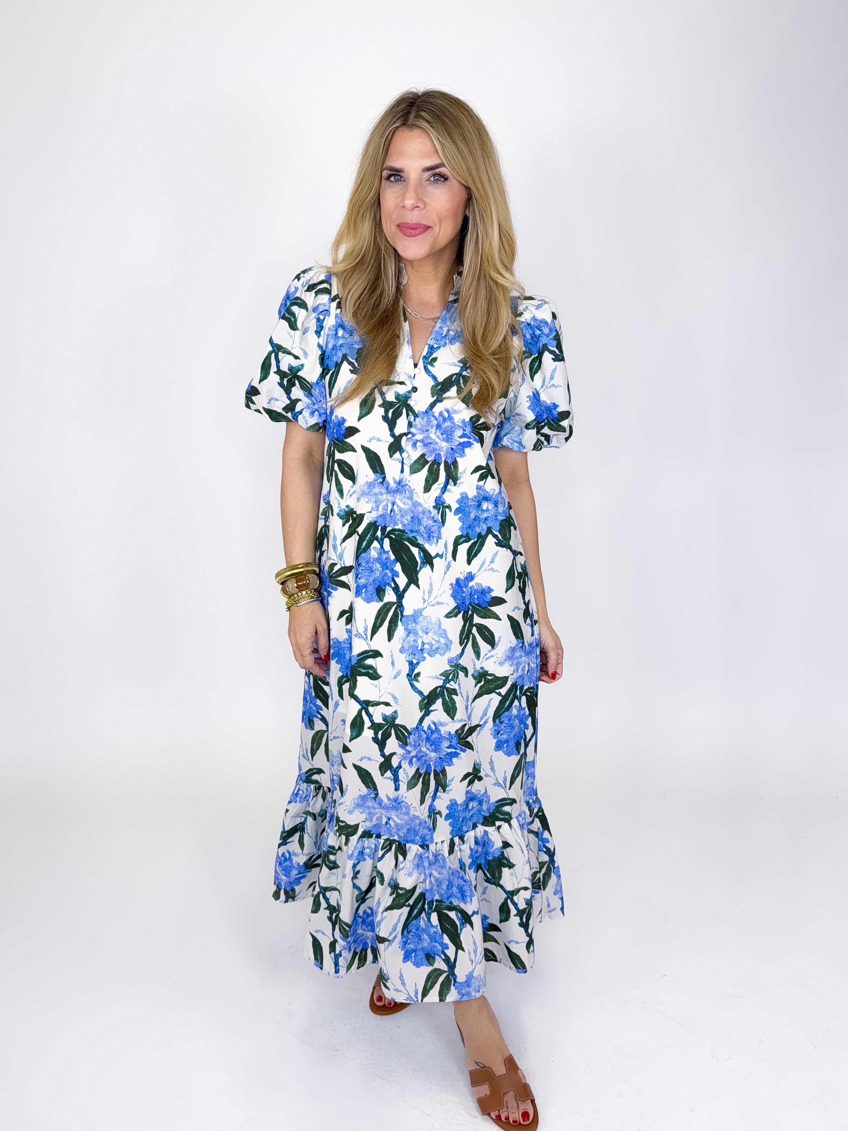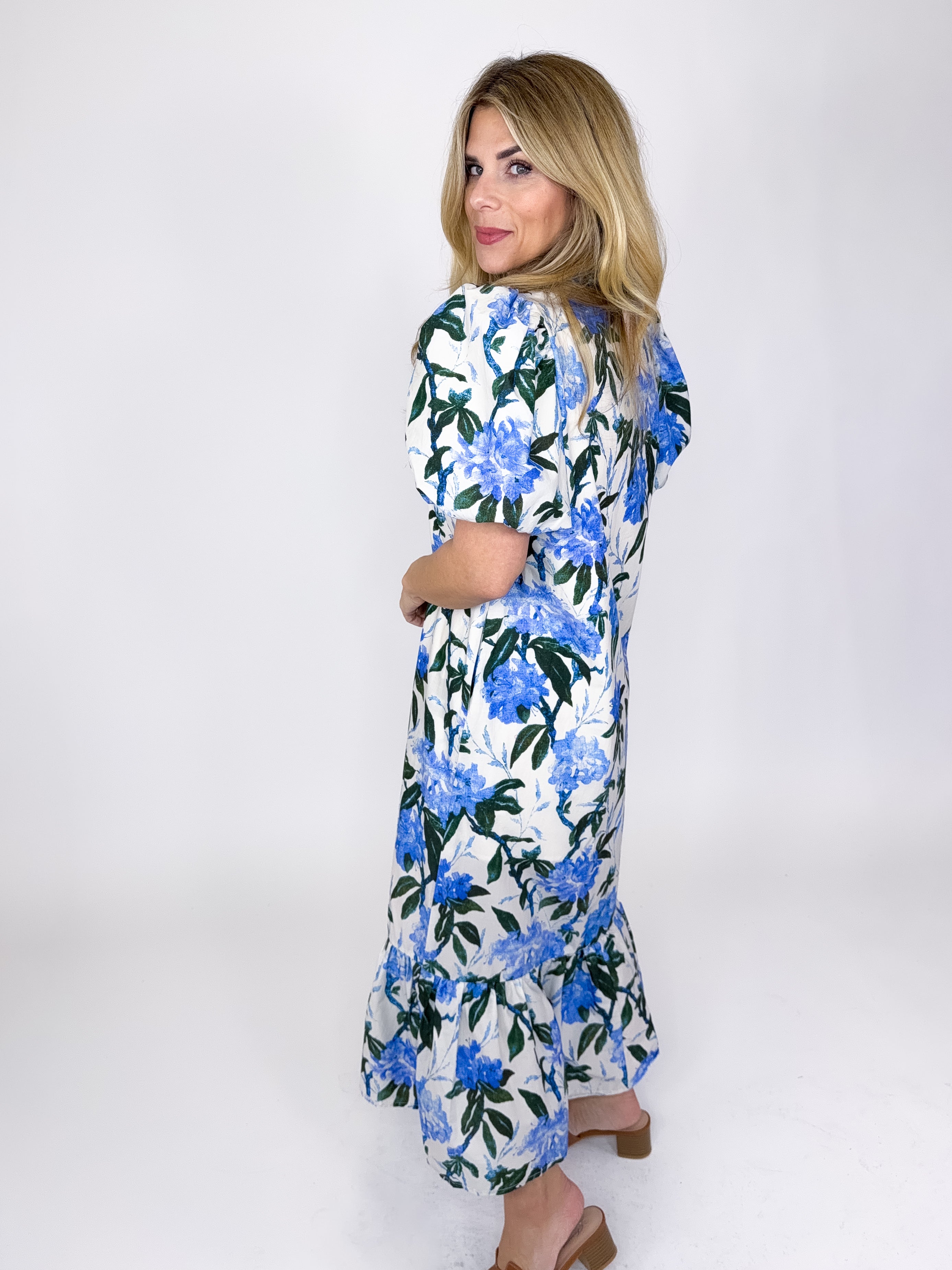 The Maisie Dress is a must have. This blue floral print midi dress features short puff sleeves, notched mock neck, button front, and a ruffle tier hem. Pockets. Lined. Style with flats, heels, wedges and sneakers! Fits true to size.
