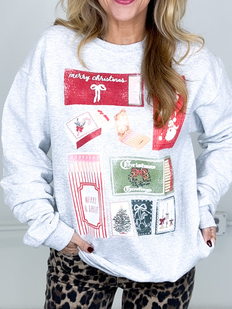 Our Matchbox graphic sweatshirt is a must have for the holidays! This Heather grey sweatshirt with a fun holiday print graphic is SO soft and offers a great fit, longer length and long sleeves. Style with denim, shorts, skirts, leggings and bike shorts! Fits true to size.