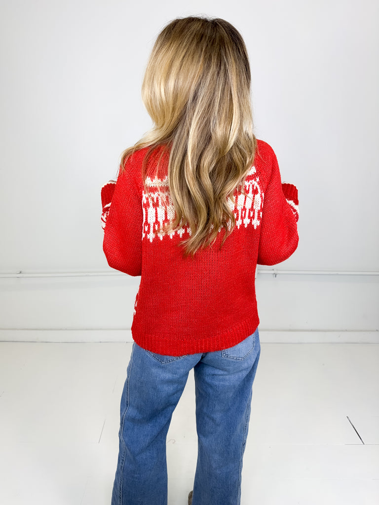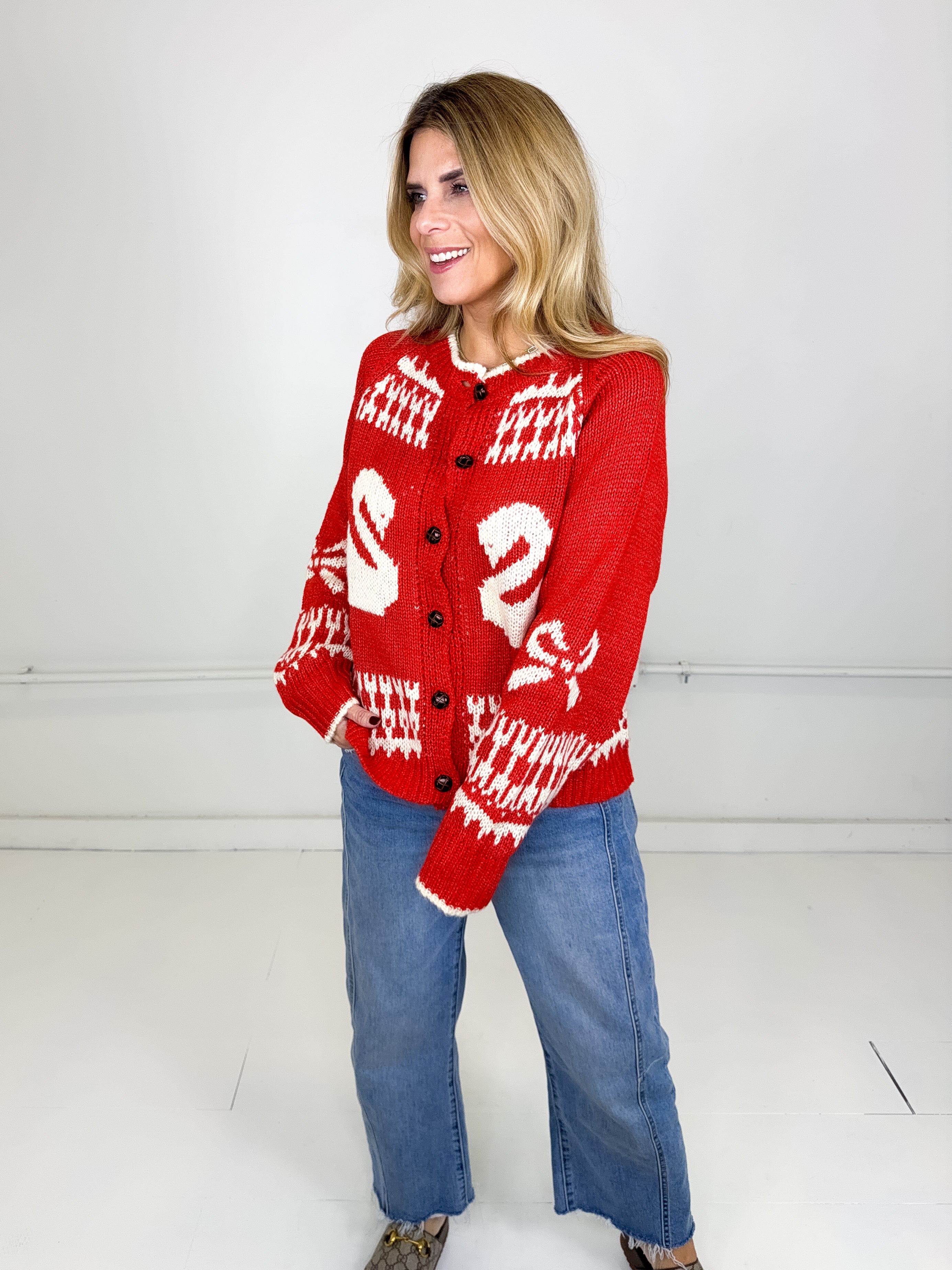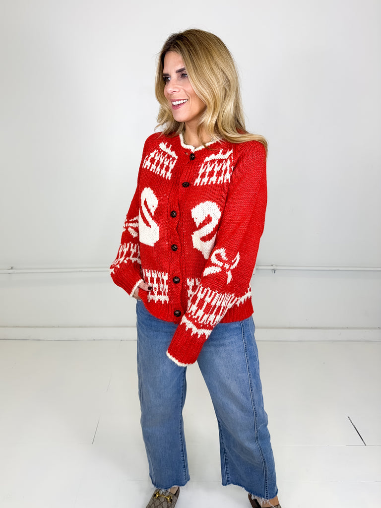 The Merrill Cardigan will be the one you reach for over and over this winter! This red graphic print knit cardigan features a classic fit, button front and long sleeves. Pairs well with everything from denim, flats, heels, dress pants, boots and more! Great fit! Fits true to size.