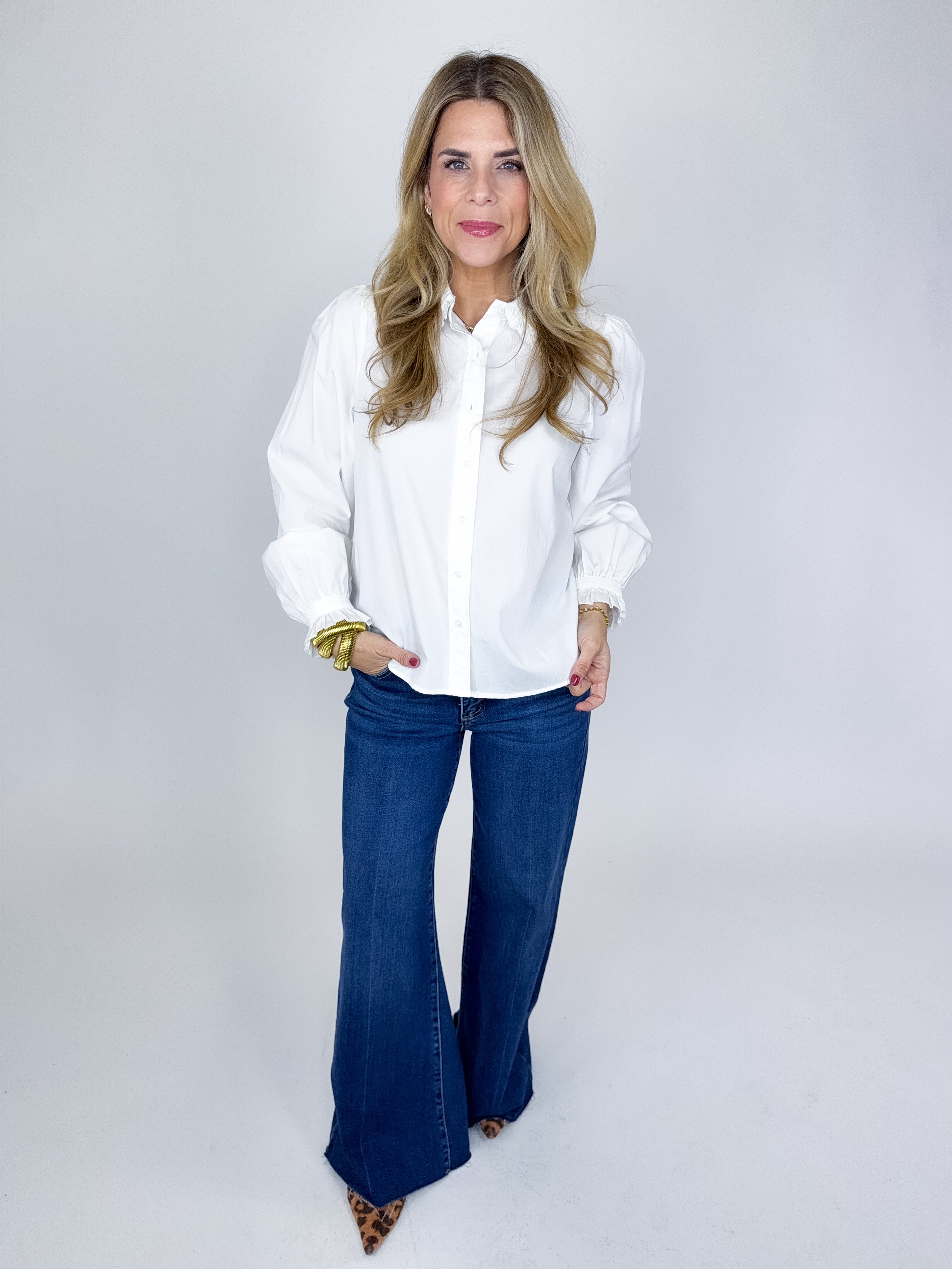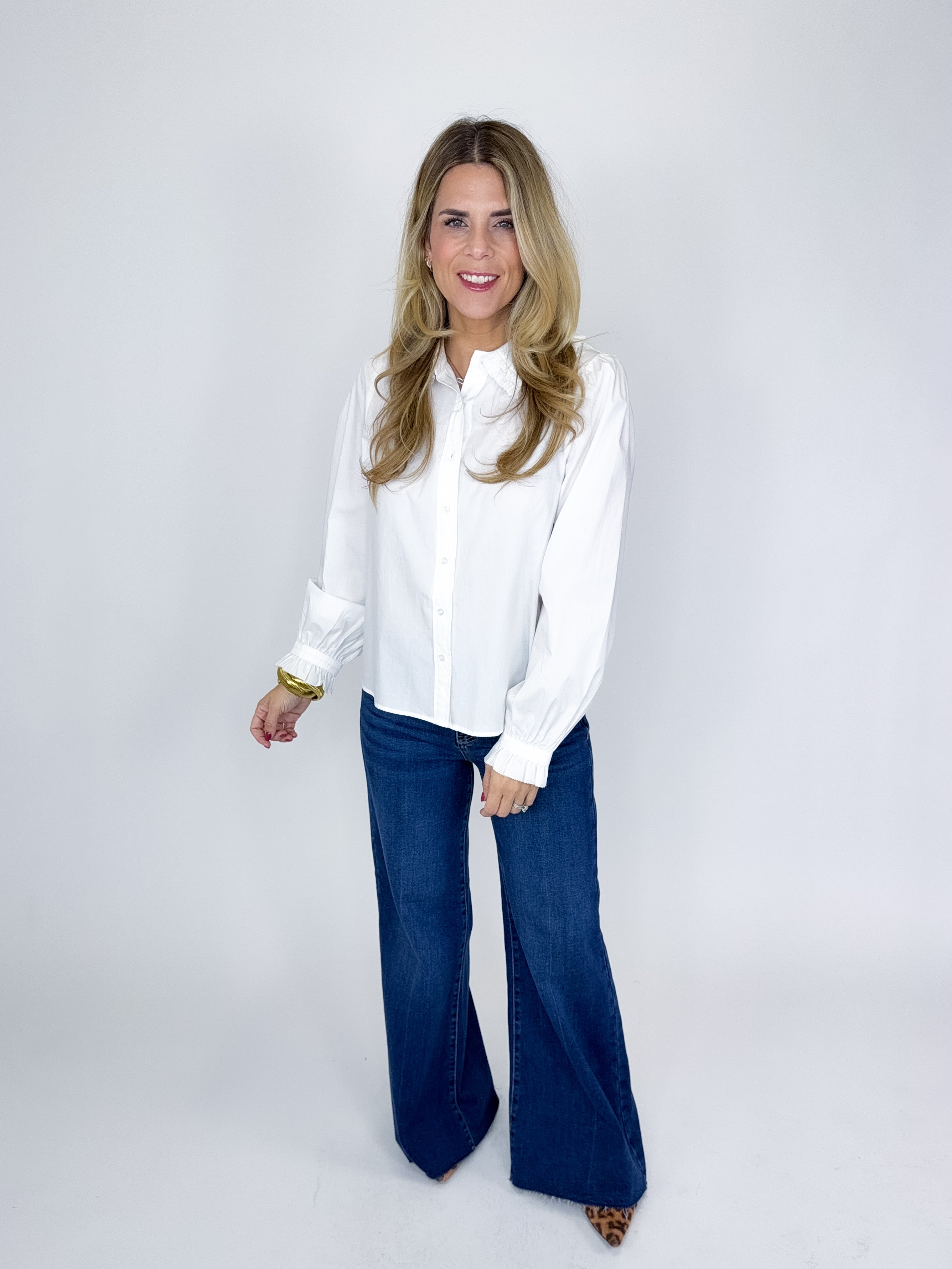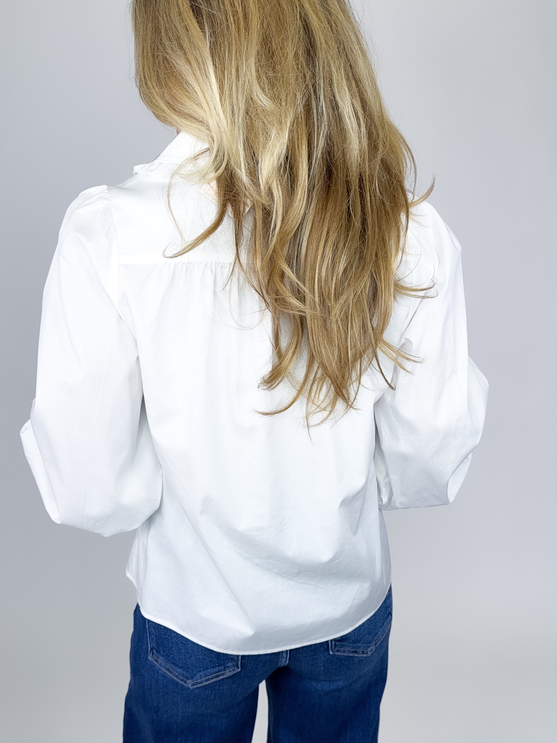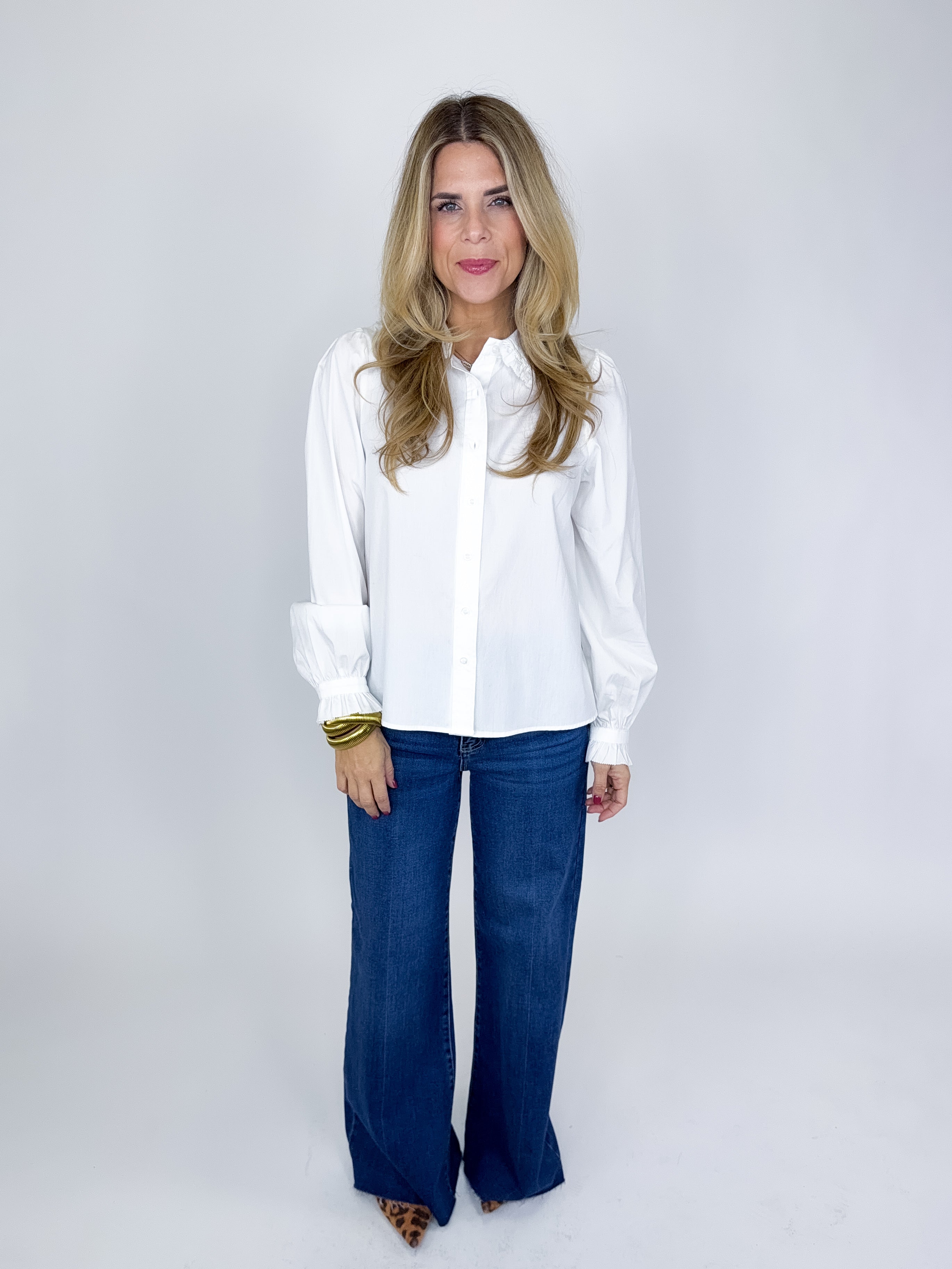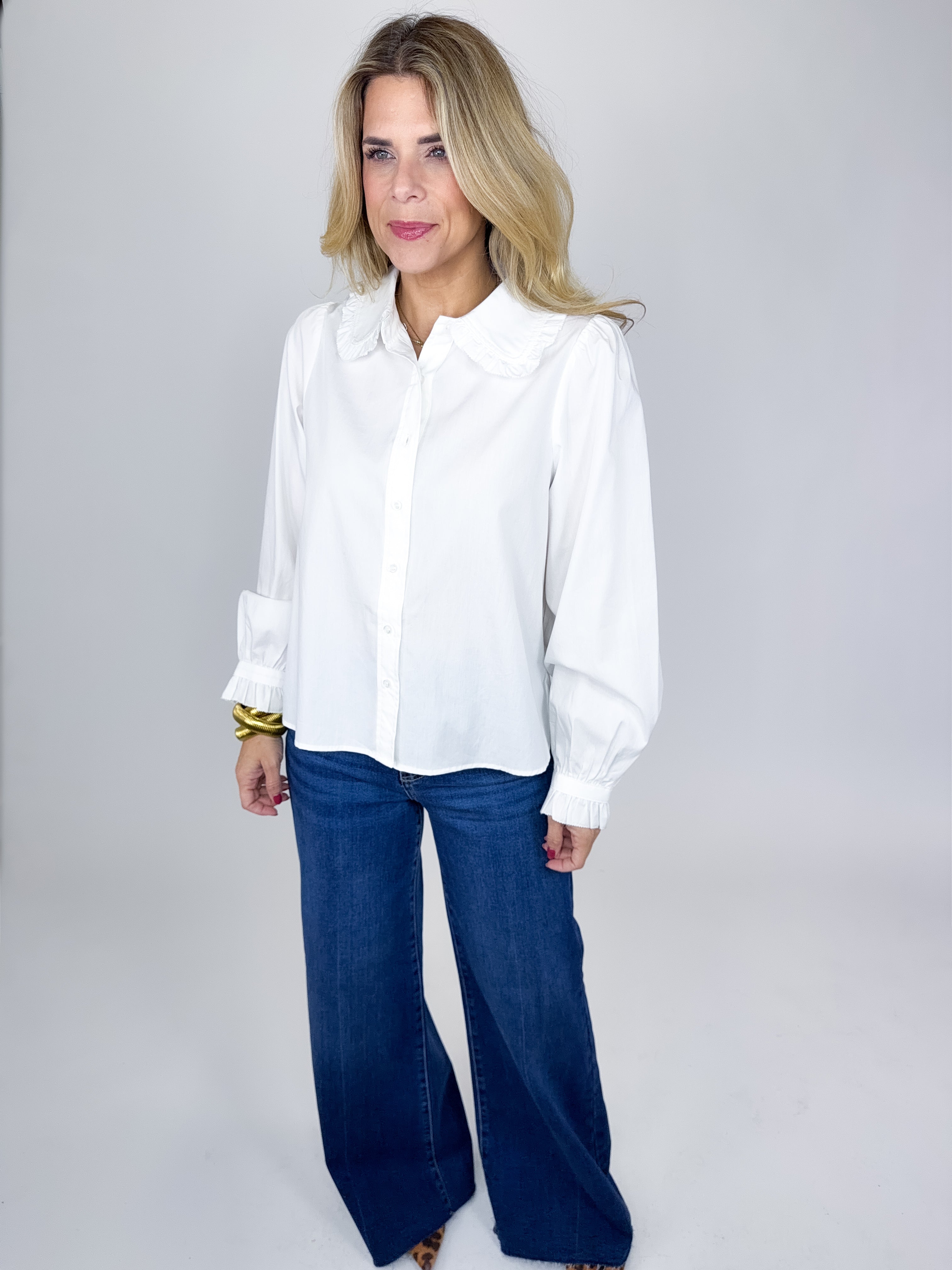 The Mills Top is such a fun top! This white blouse features a button front, ruffle trim collar, long sleeves with a ruffle cuff and great length. Pairs well with everything from denim, flats, heels, boots, skirts and more! Fits true to size.