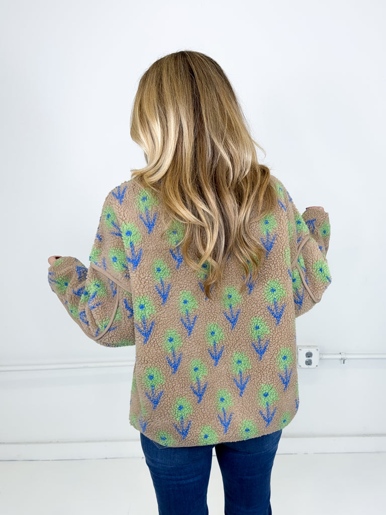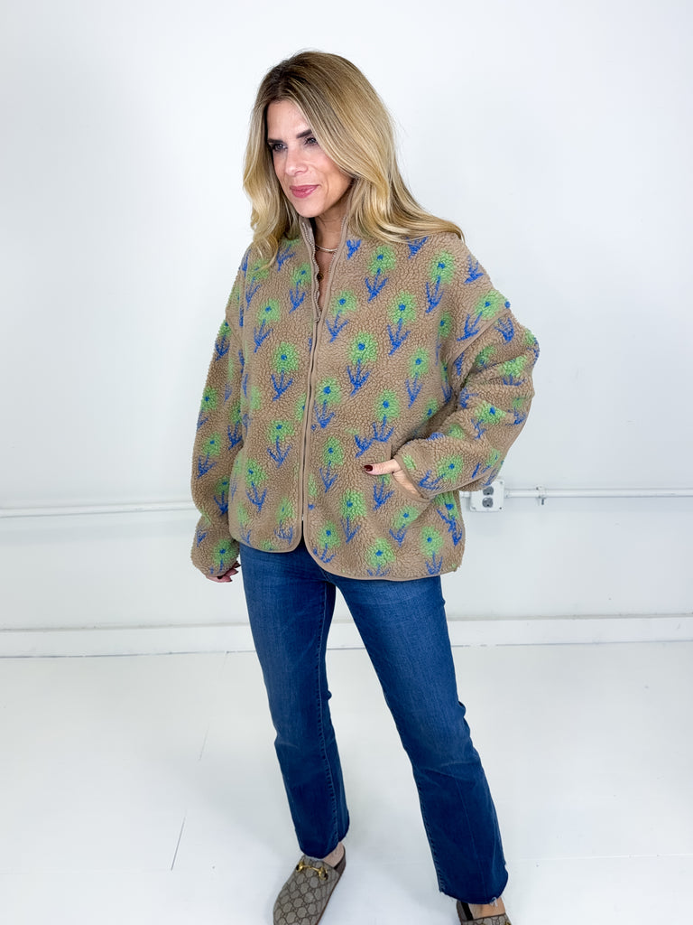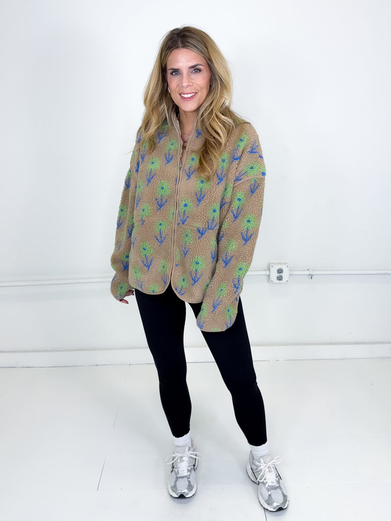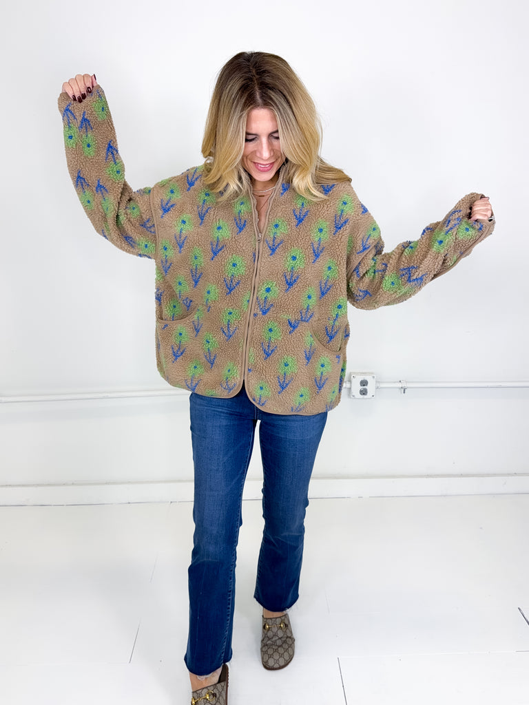 This jacket was made to be layered with everything! Our Noah jacket is a mid weight mocha floral pattern fleece jacket. Zipper front, great length, long sleeves, drop shoulder with a high neck. Stye with everything from skirts and heels to denim and booties. Fits true to size.