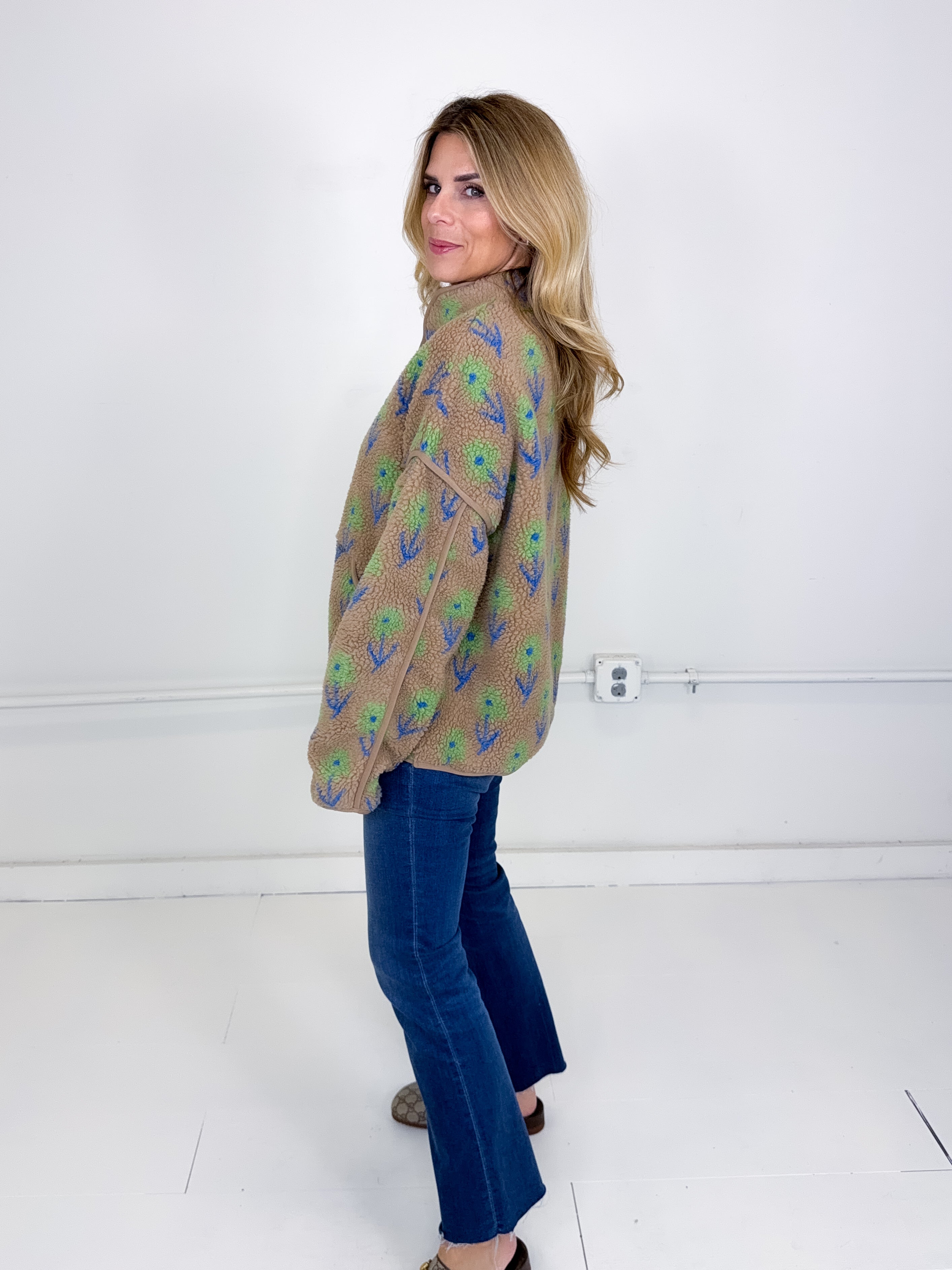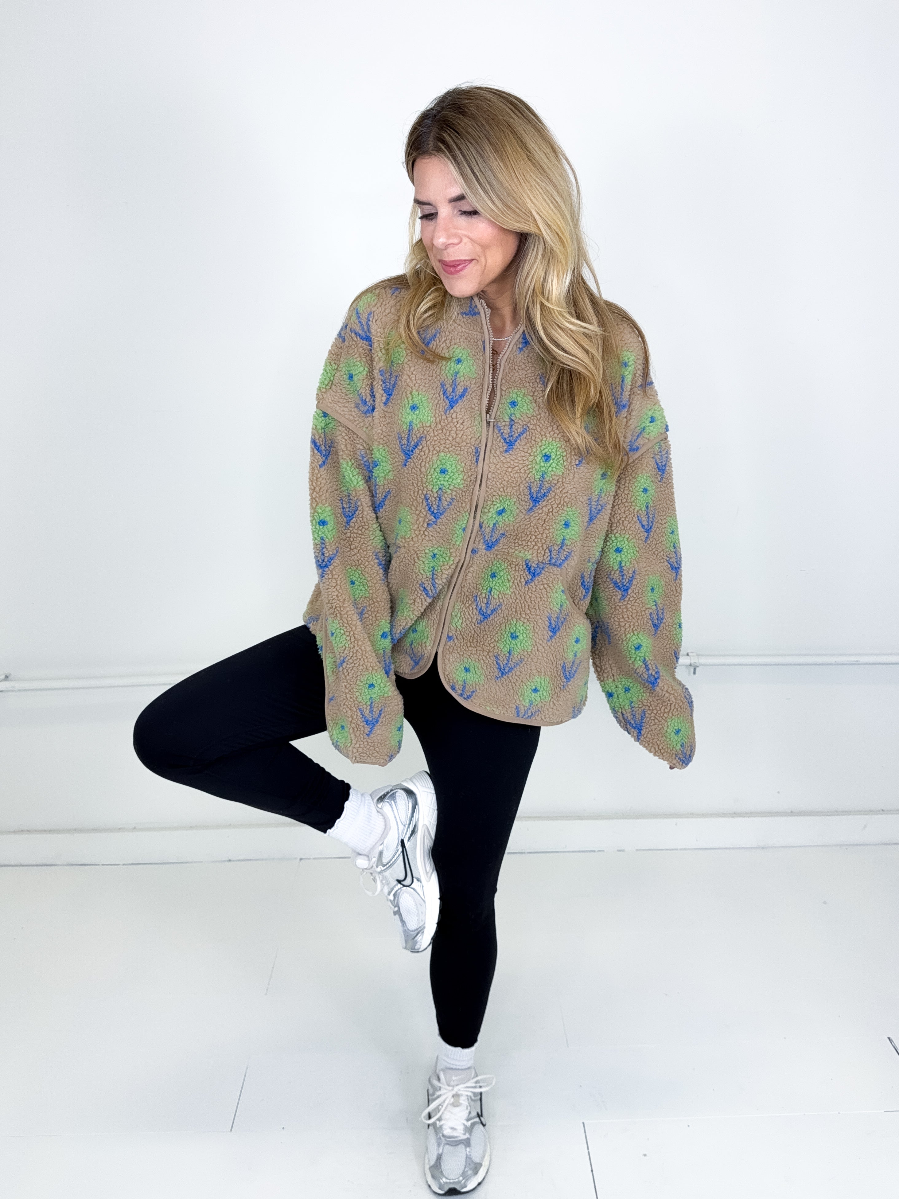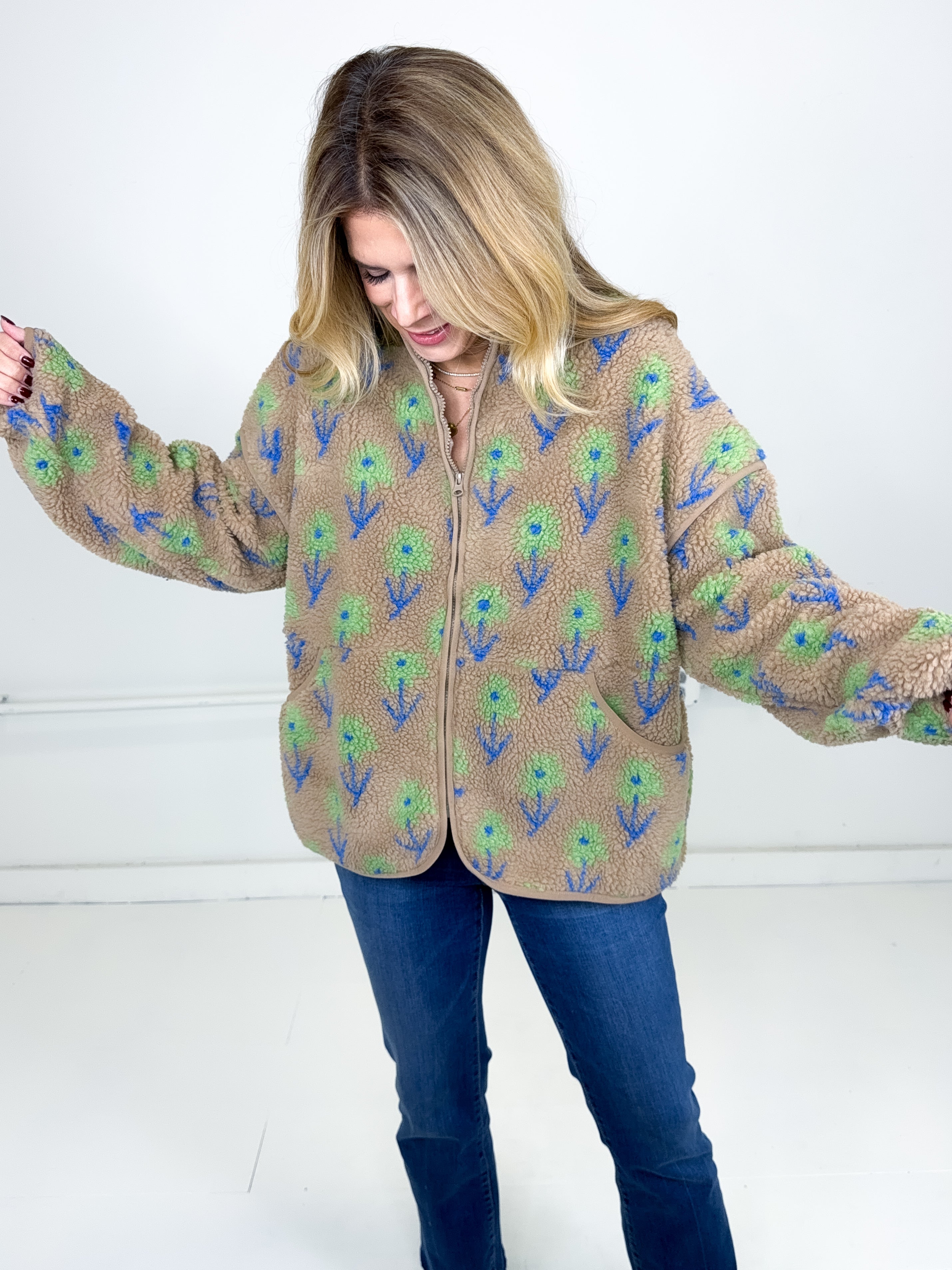 This jacket was made to be layered with everything! Our Noah jacket is a mid weight mocha floral pattern fleece jacket. Zipper front, great length, long sleeves, drop shoulder with a high neck. Stye with everything from skirts and heels to denim and booties. Fits true to size.