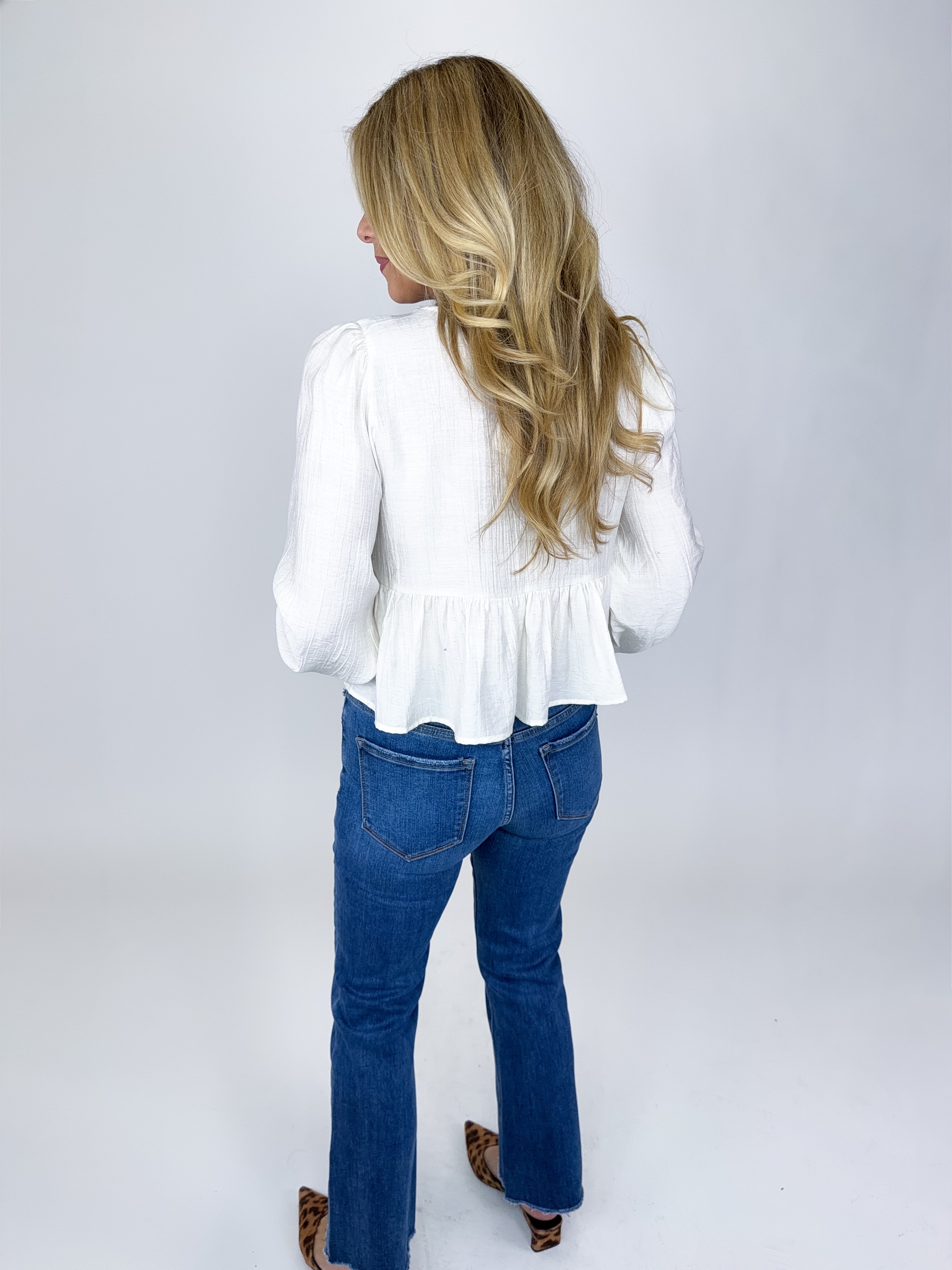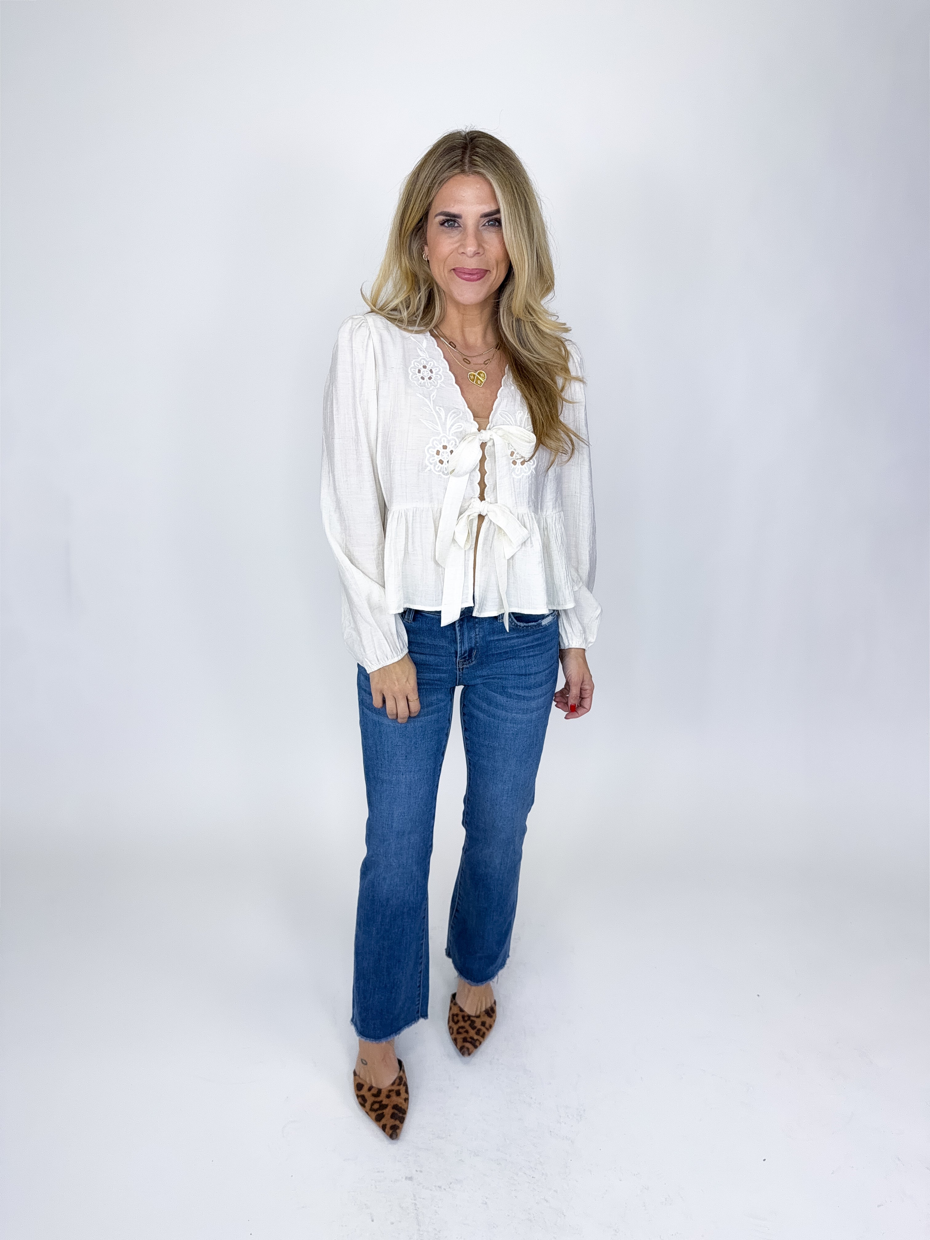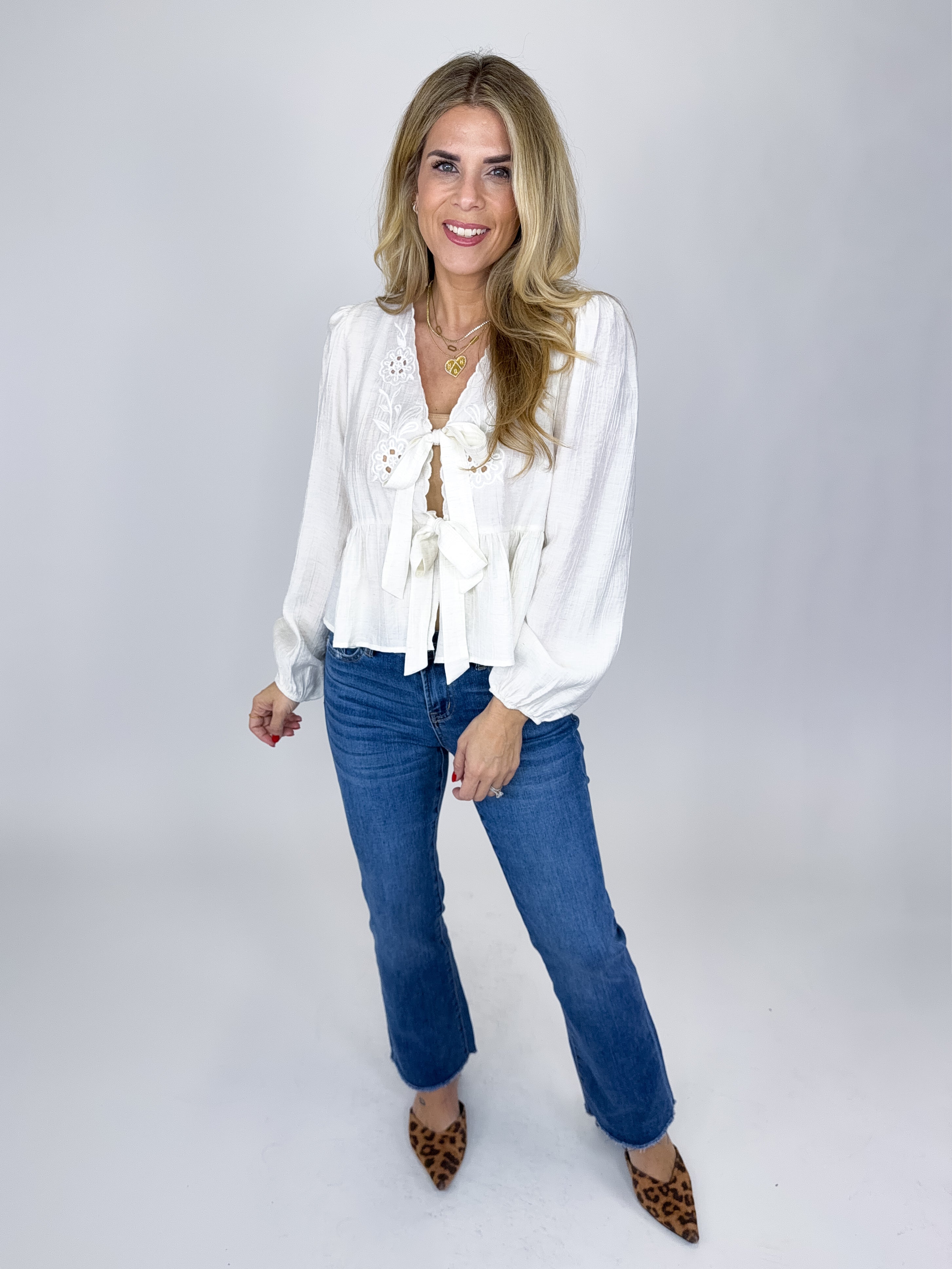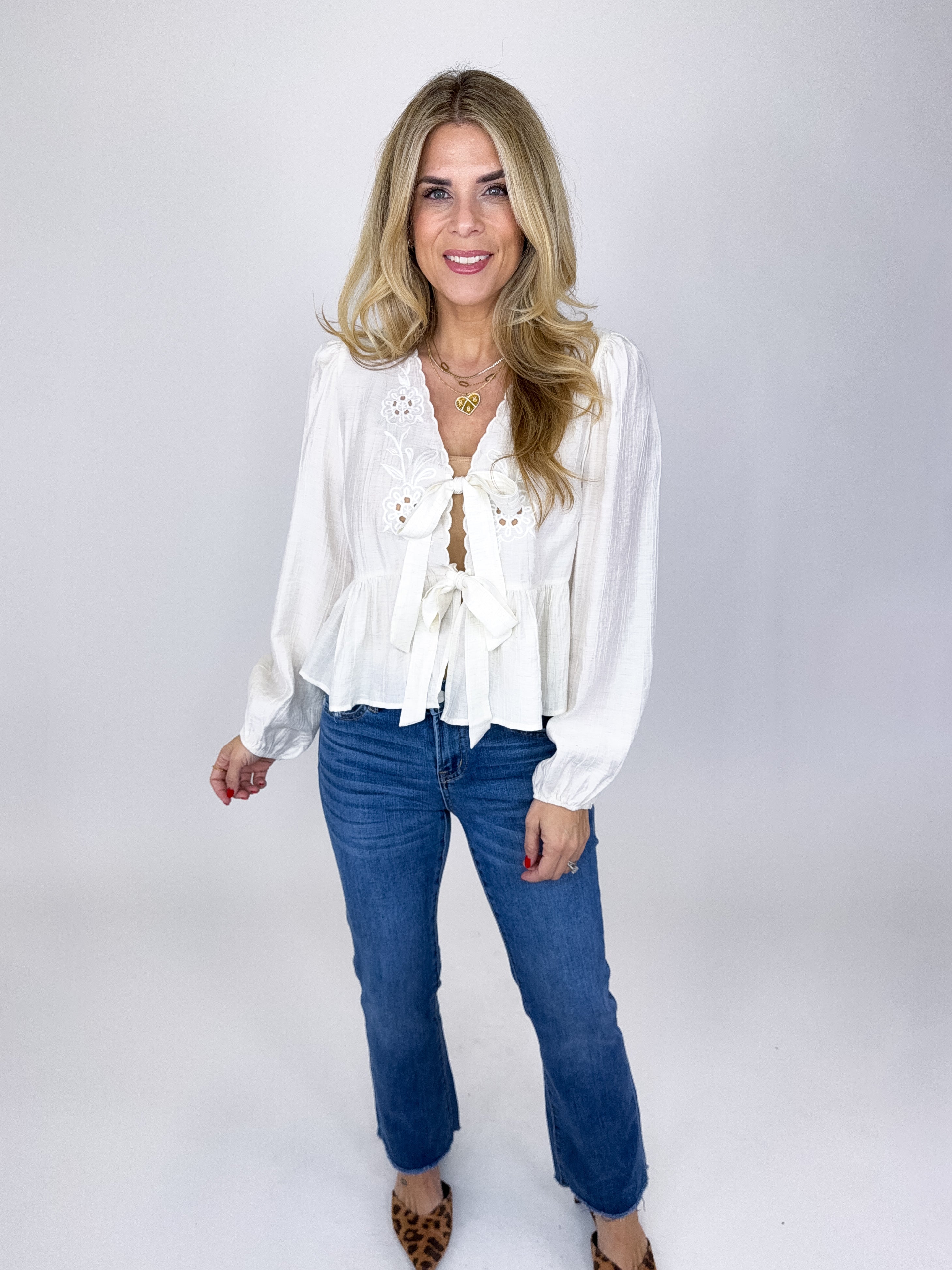 The Olivia Top is such a fun boho top! This beautiful white blouse features tonal eyelet embroidery, bow front ties, long sleeves and a peplum hem. Pairs well with everything from denim, flats, heels, dress pants, skirts and more! Fits true to size.