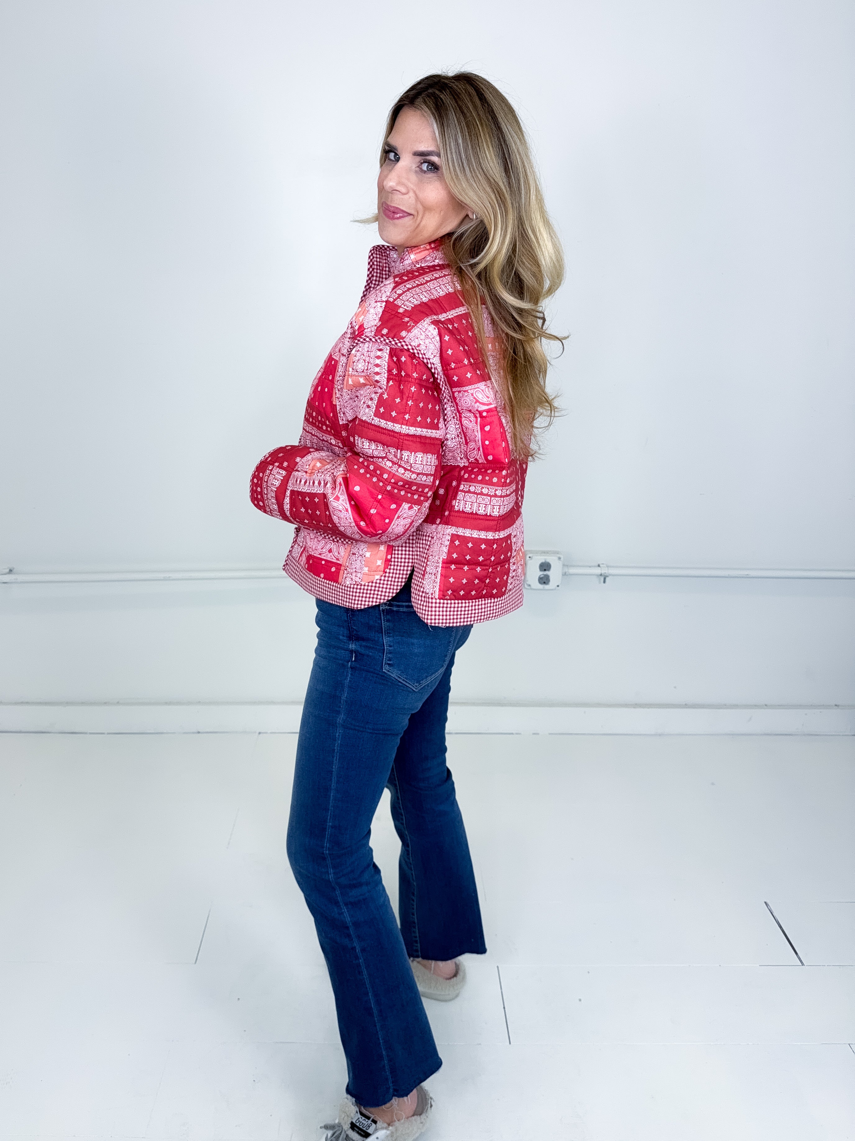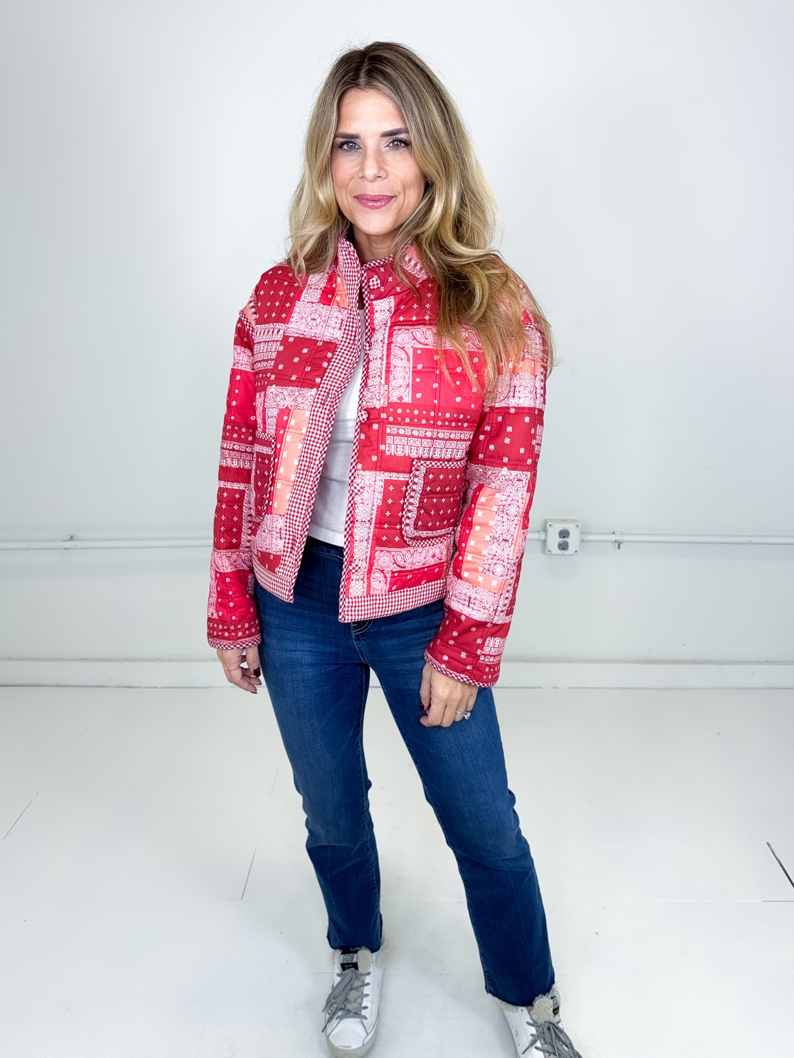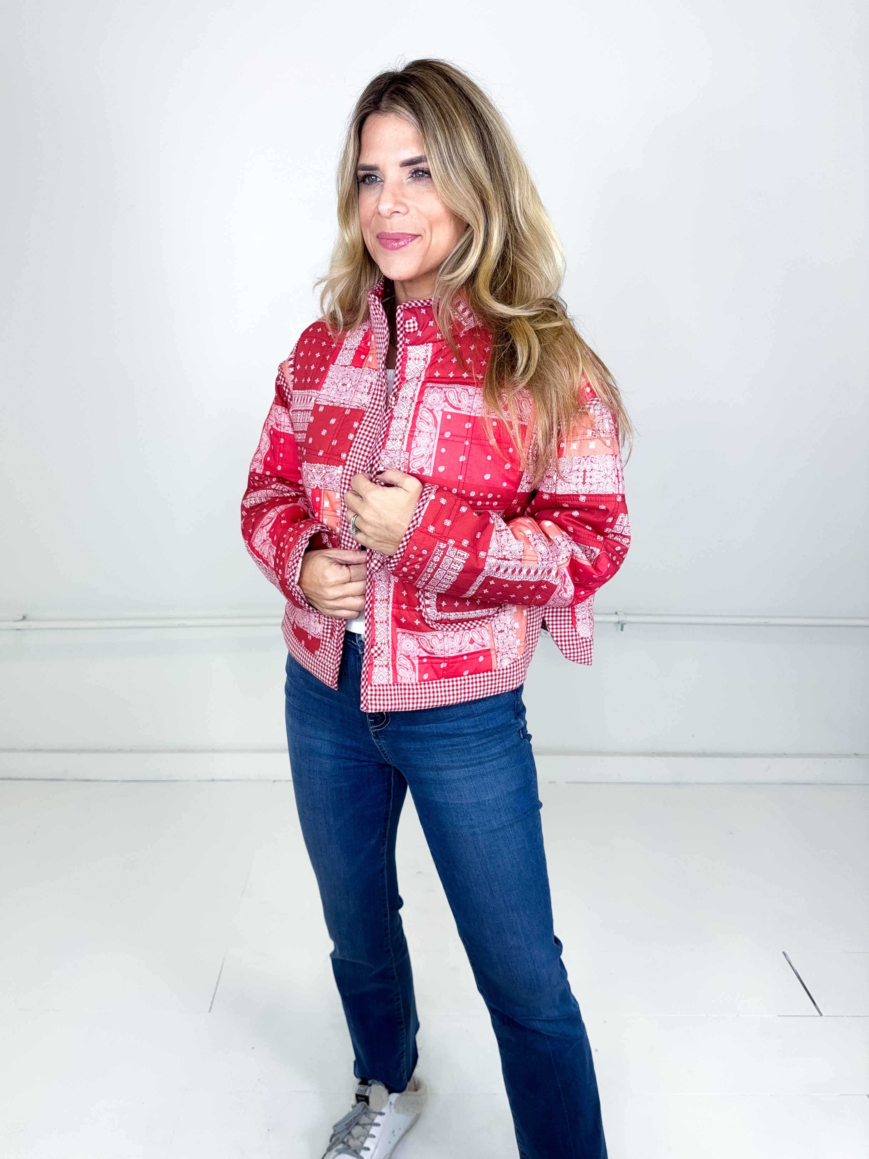 This jacket was made to be layered with everything! Our Quincy jacket is a mid weight red bandana pattern quilted jacket. Button front with front facing pockets, contrast gingham print trim, long sleeves with a drop shoulder with a stand up neck and a rounded split hem. Stye with everything from skirts and heels to denim and booties. Fits true to size.