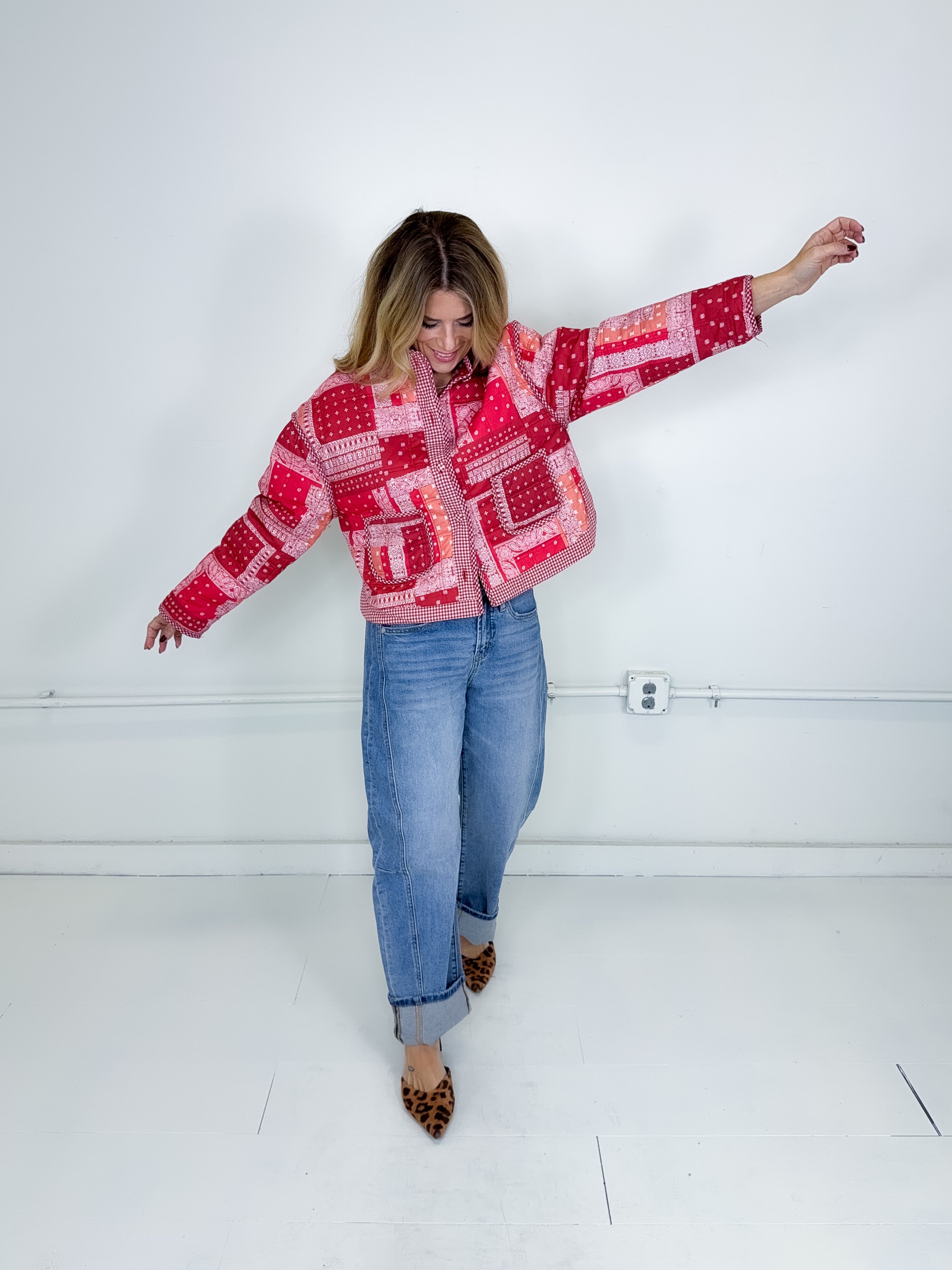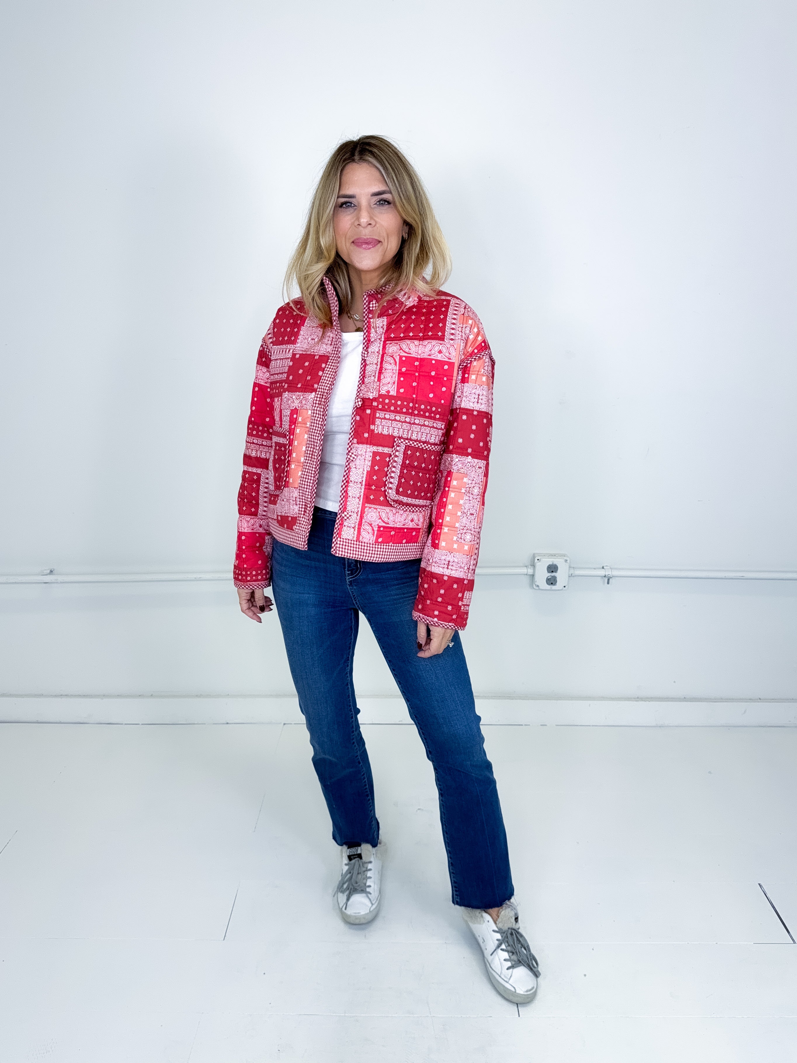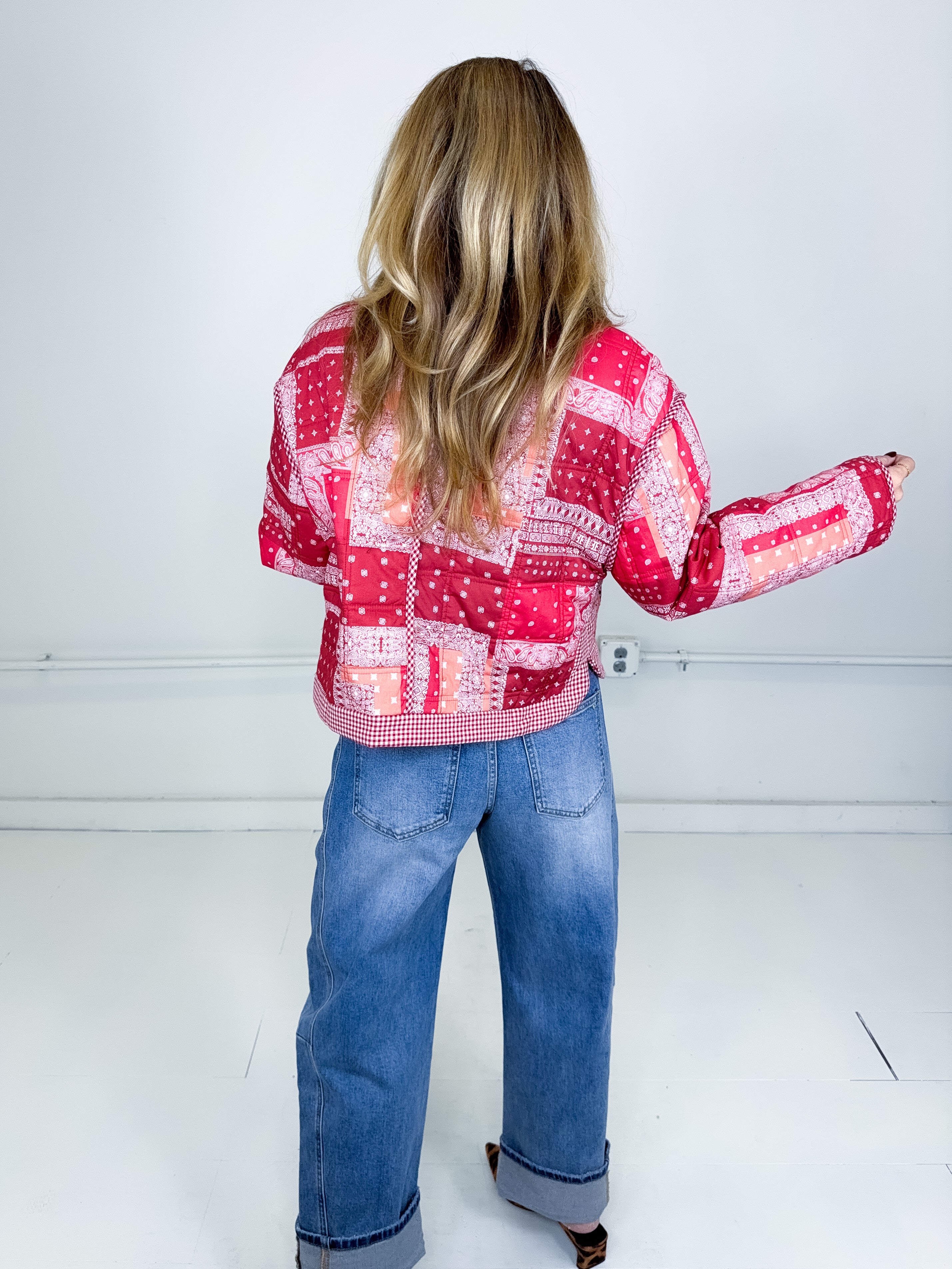 This jacket was made to be layered with everything! Our Quincy jacket is a mid weight red bandana pattern quilted jacket. Button front with front facing pockets, contrast gingham print trim, long sleeves with a drop shoulder with a stand up neck and a rounded split hem. Stye with everything from skirts and heels to denim and booties. Fits true to size.