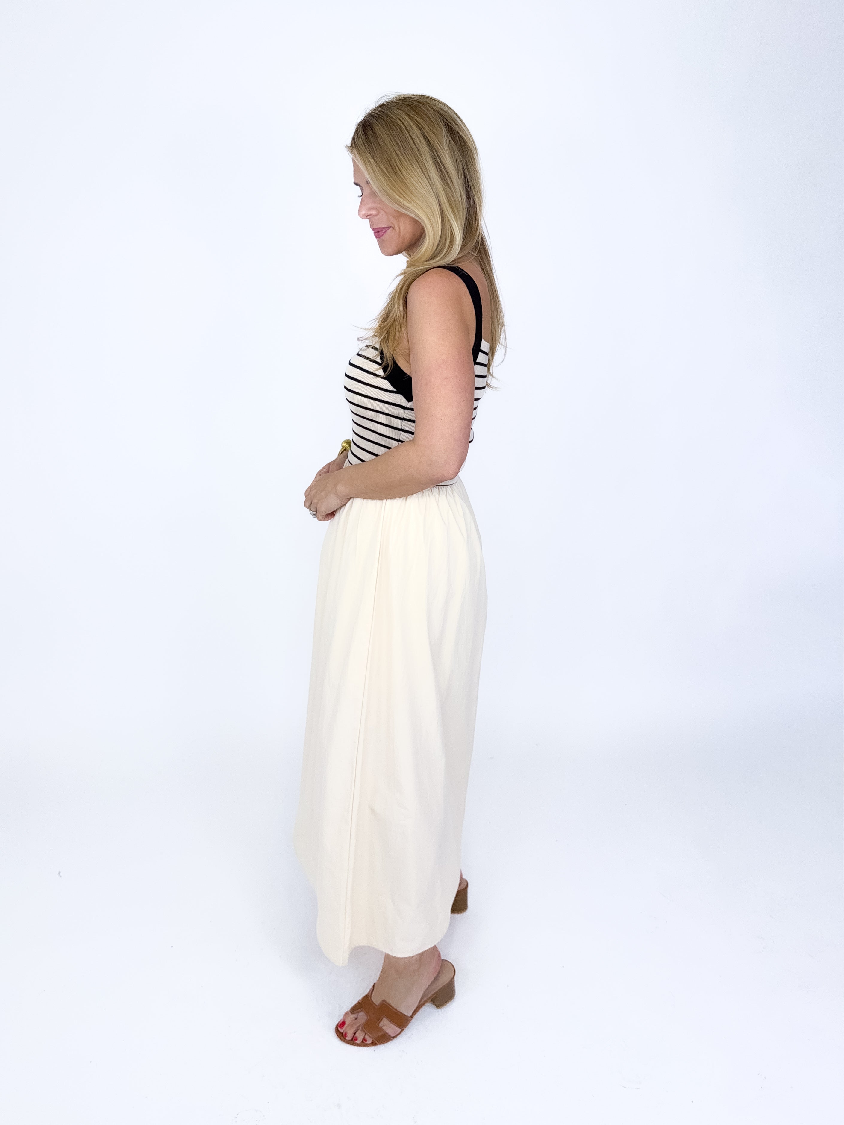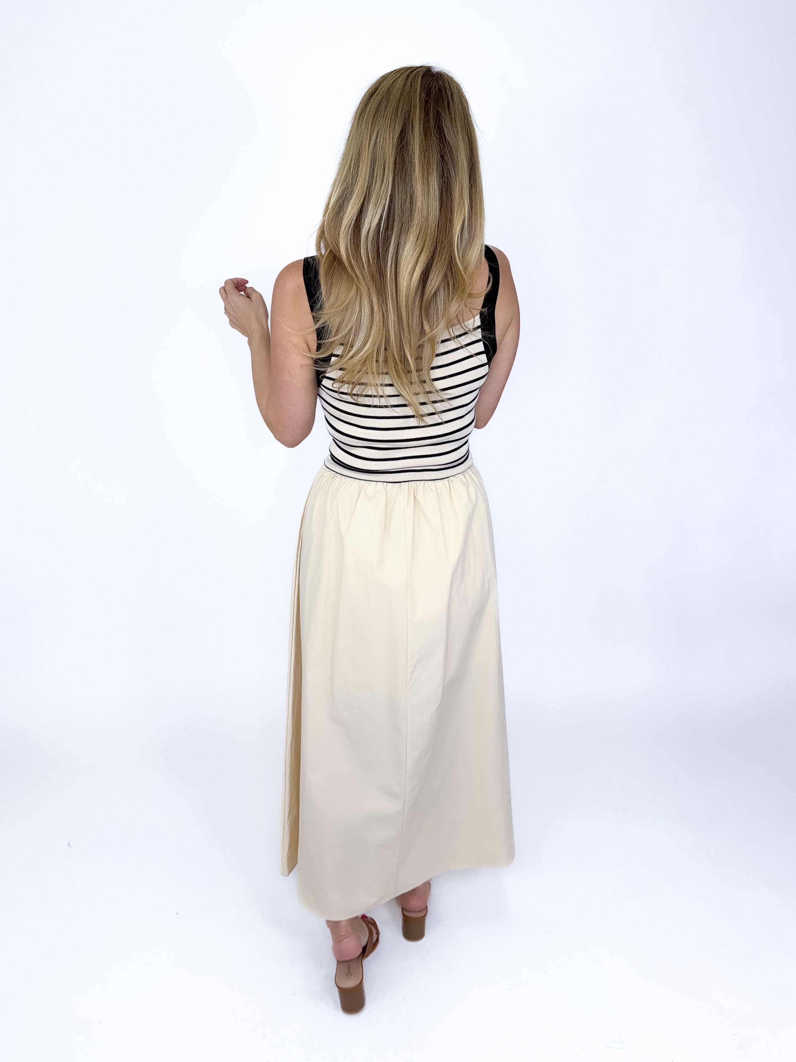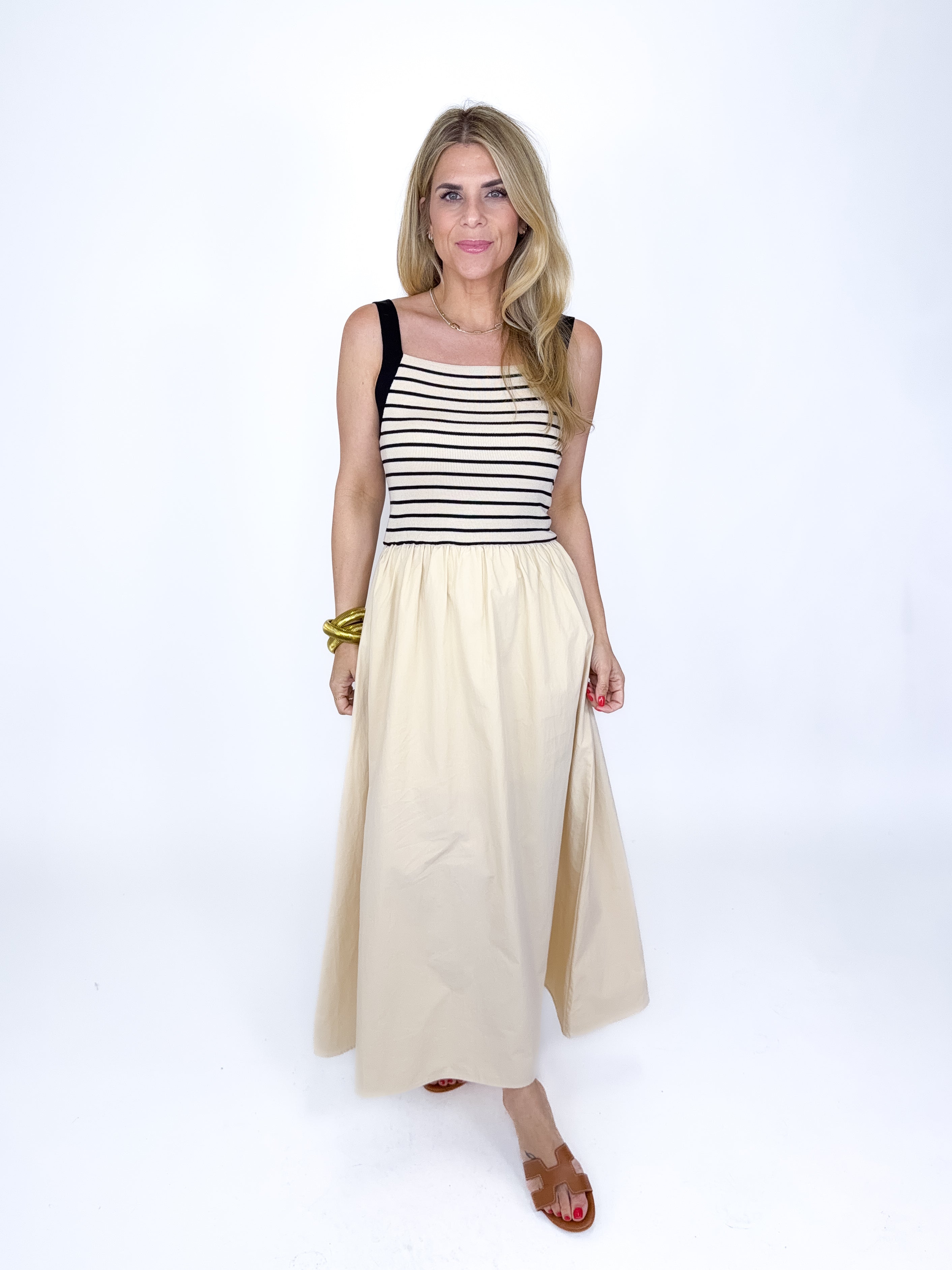 The Remy Dress is the perfect dress! This black and khaki stripe mixed media spaghetti strap maxi dress features a ribbed knit bodice, square neck and a flowy gathered poplin skirt. Lined. Style with flats, wedges or heels. Fits true to size.