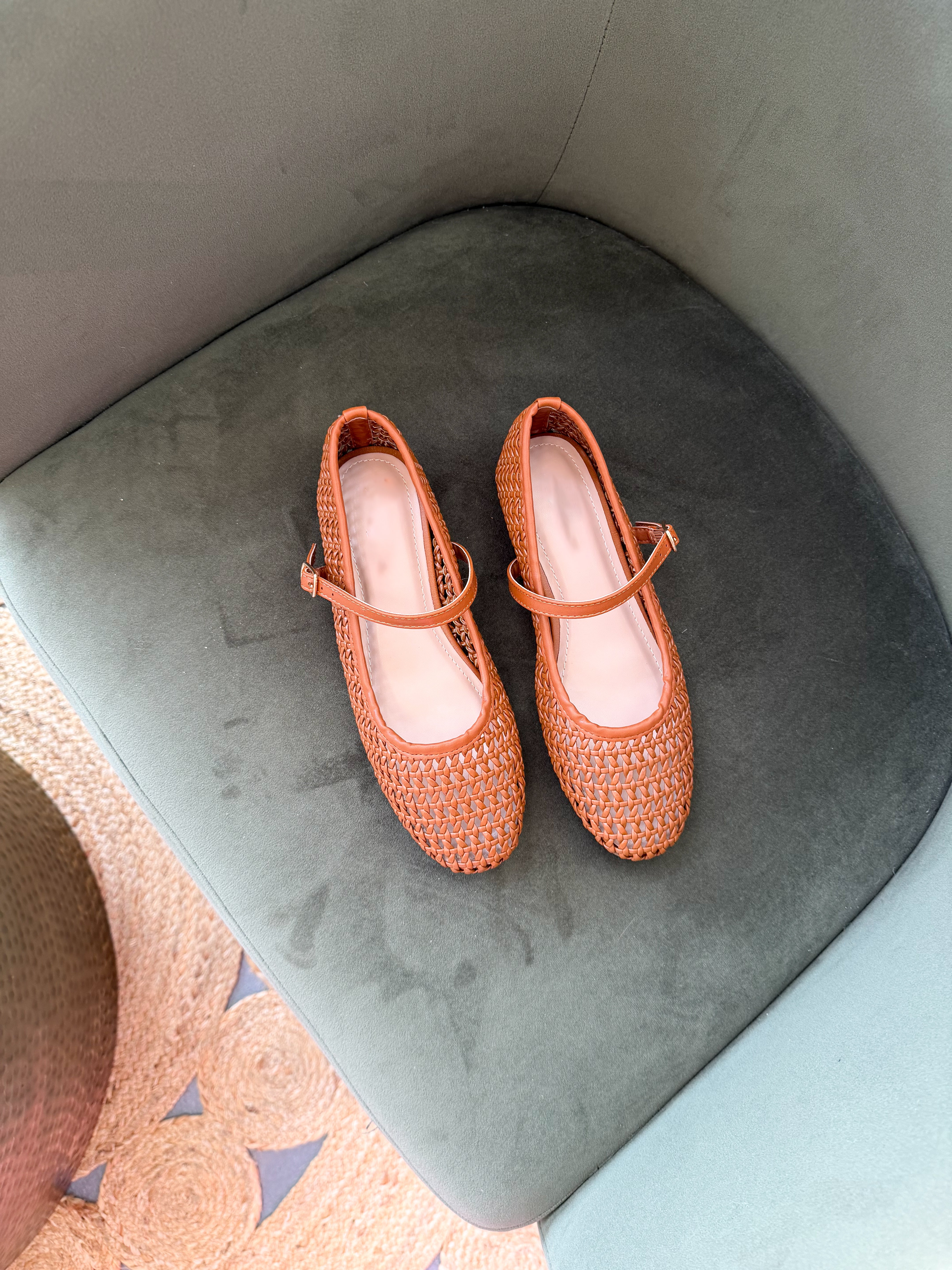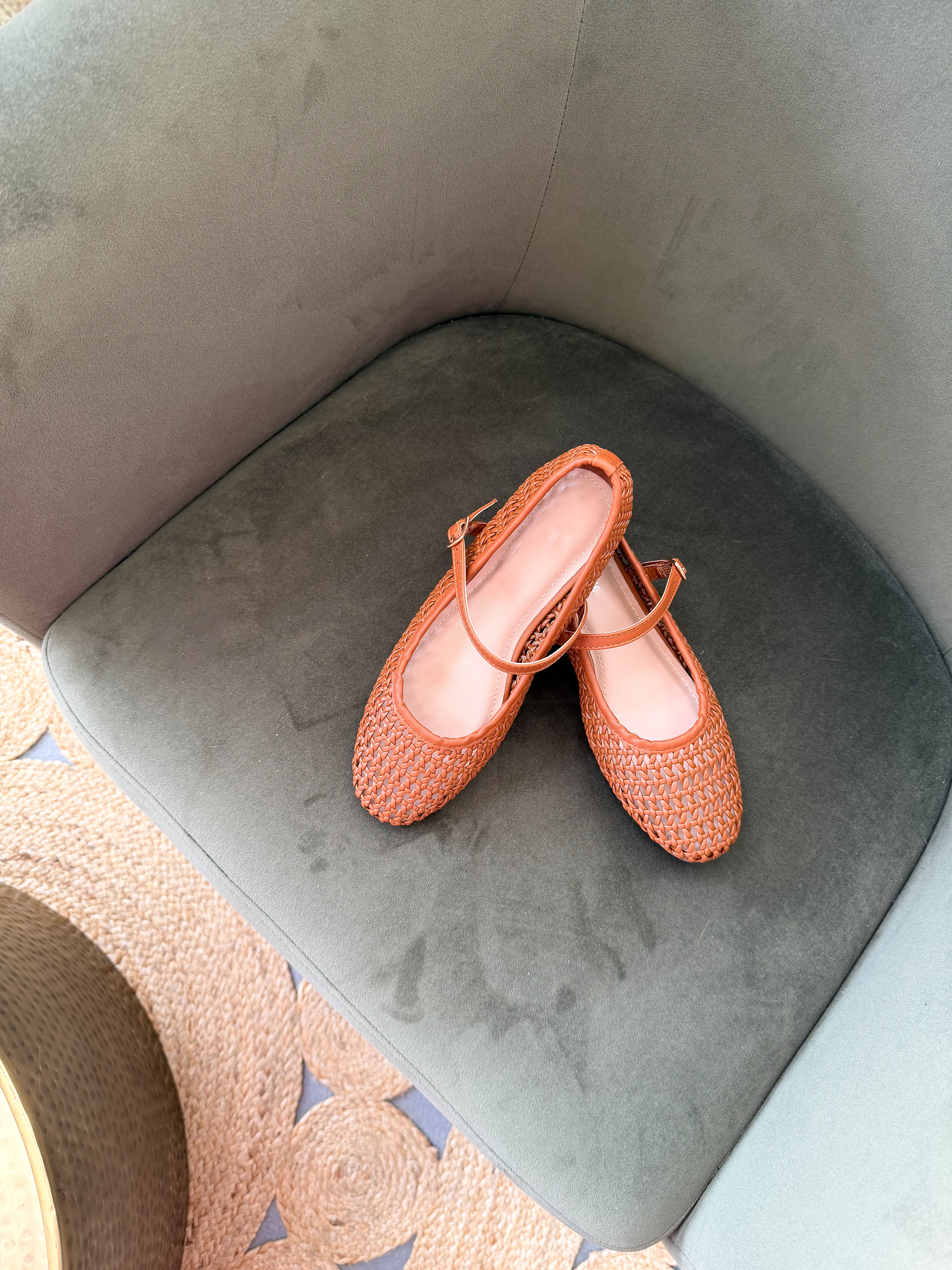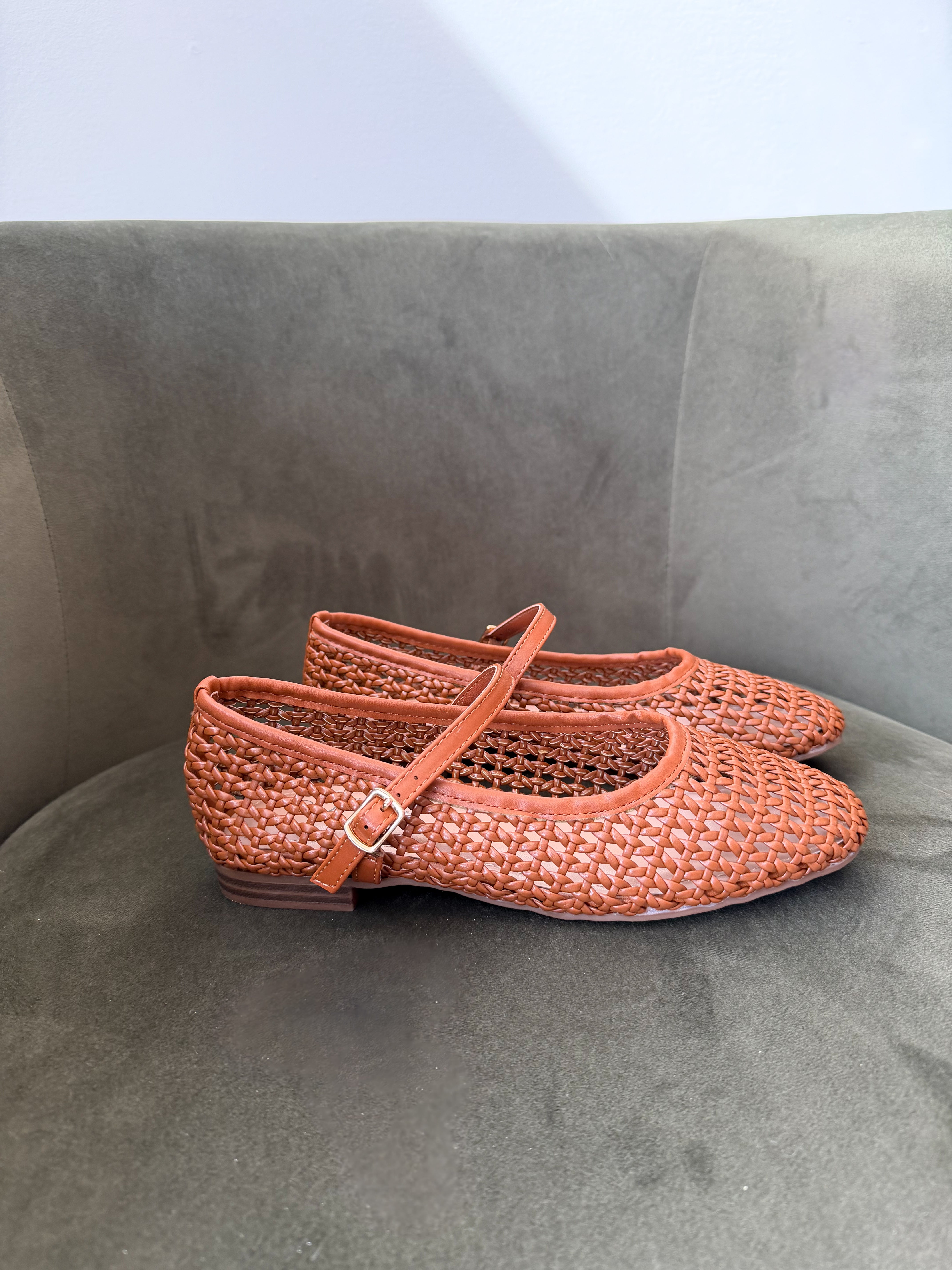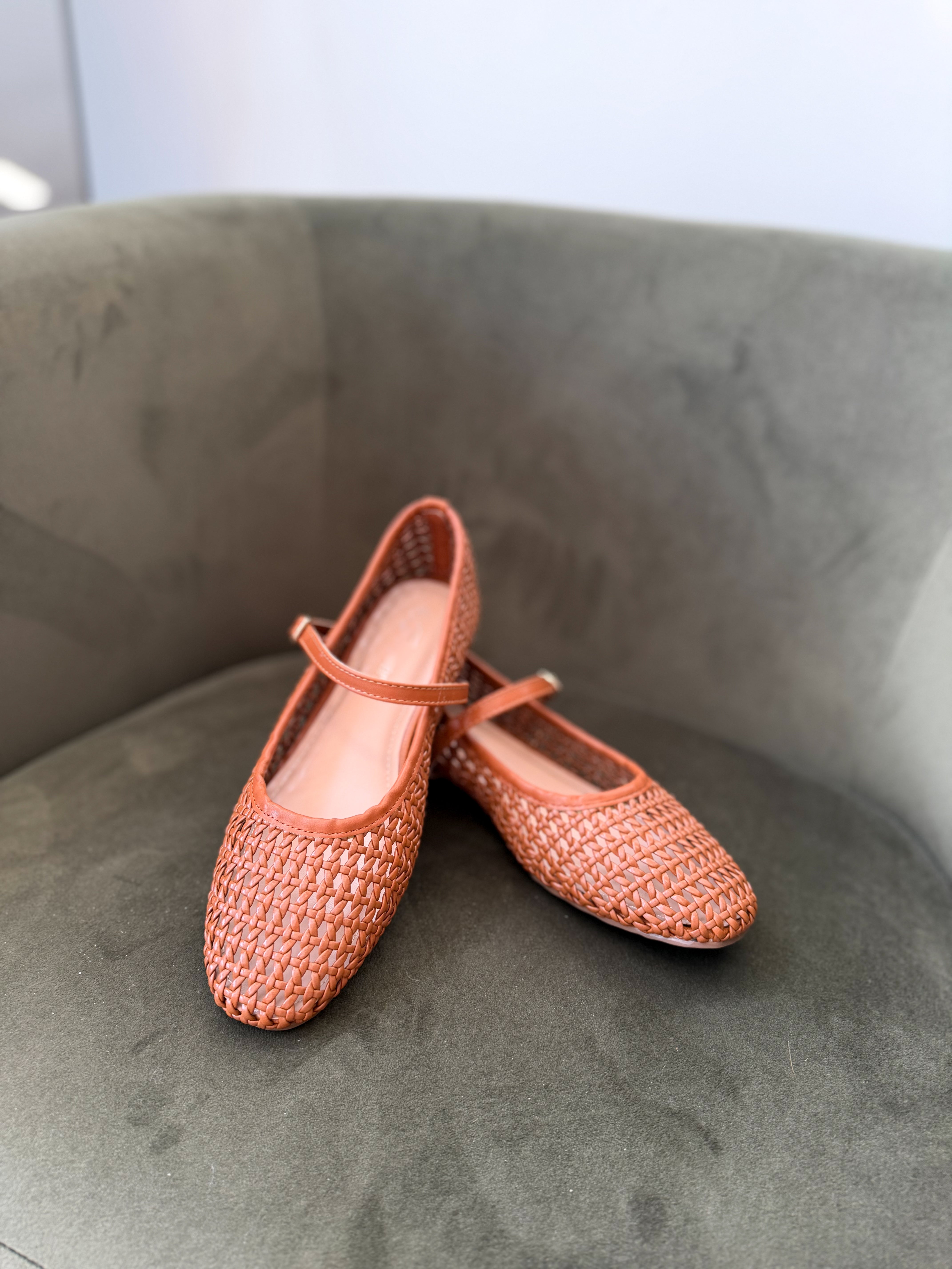 Stay on trend with our Rhea Ballet Flats. These lightweight tan Maryjane style flats feature a slip on style, woven material, buckle strap and a round toe. Pair them with everything from jeans to dresses to skirts. Fit true to size.