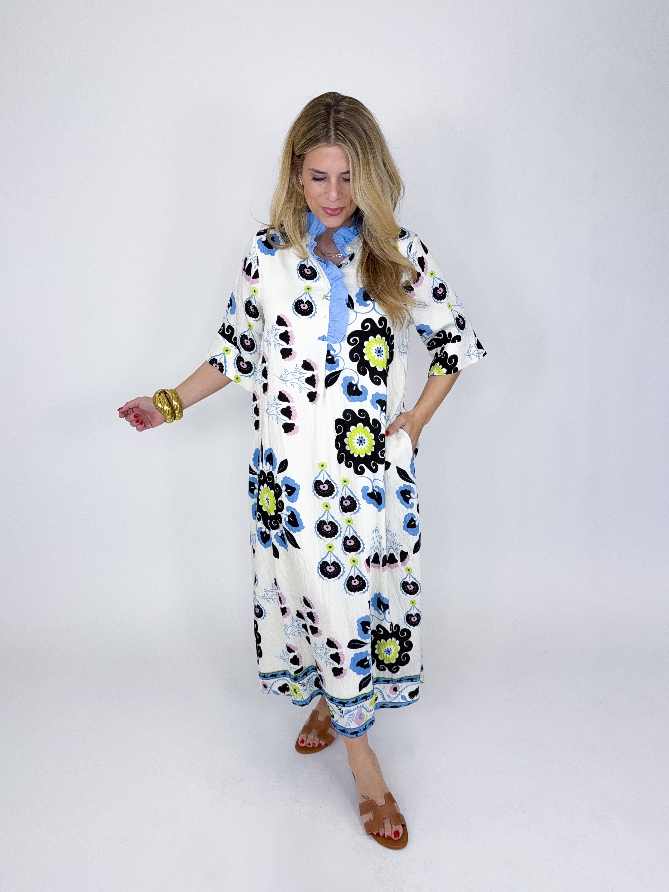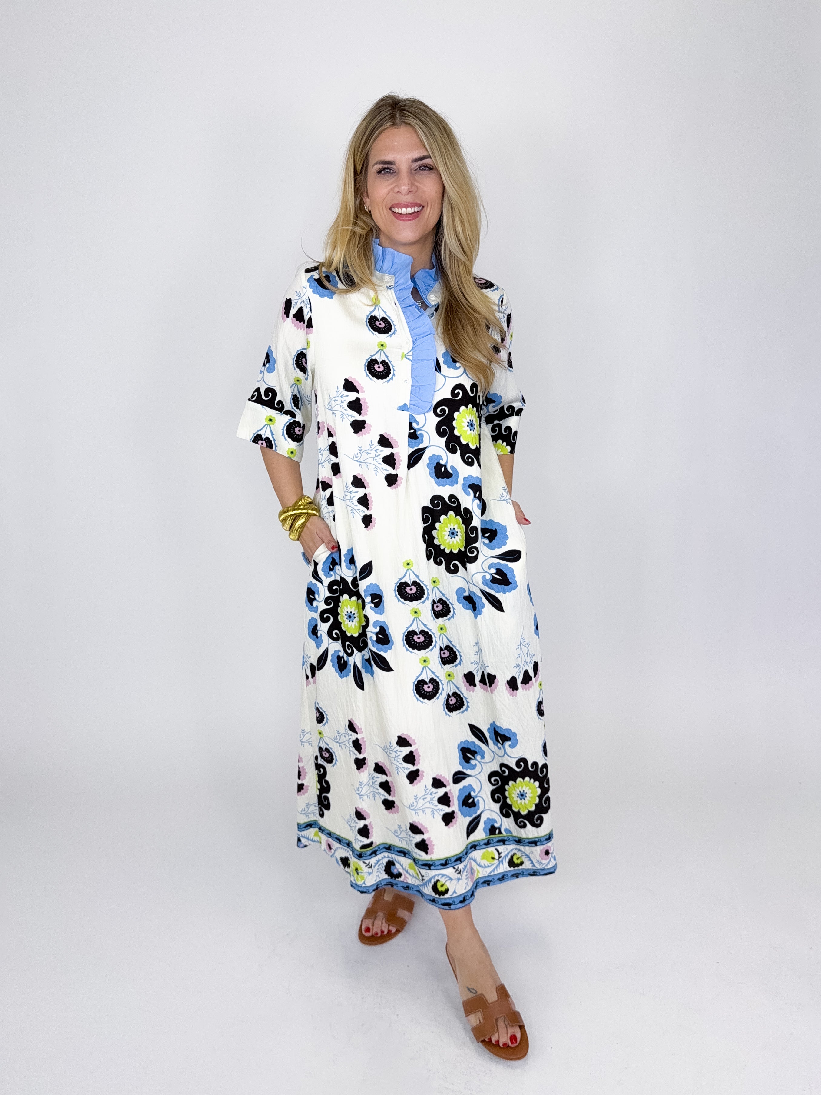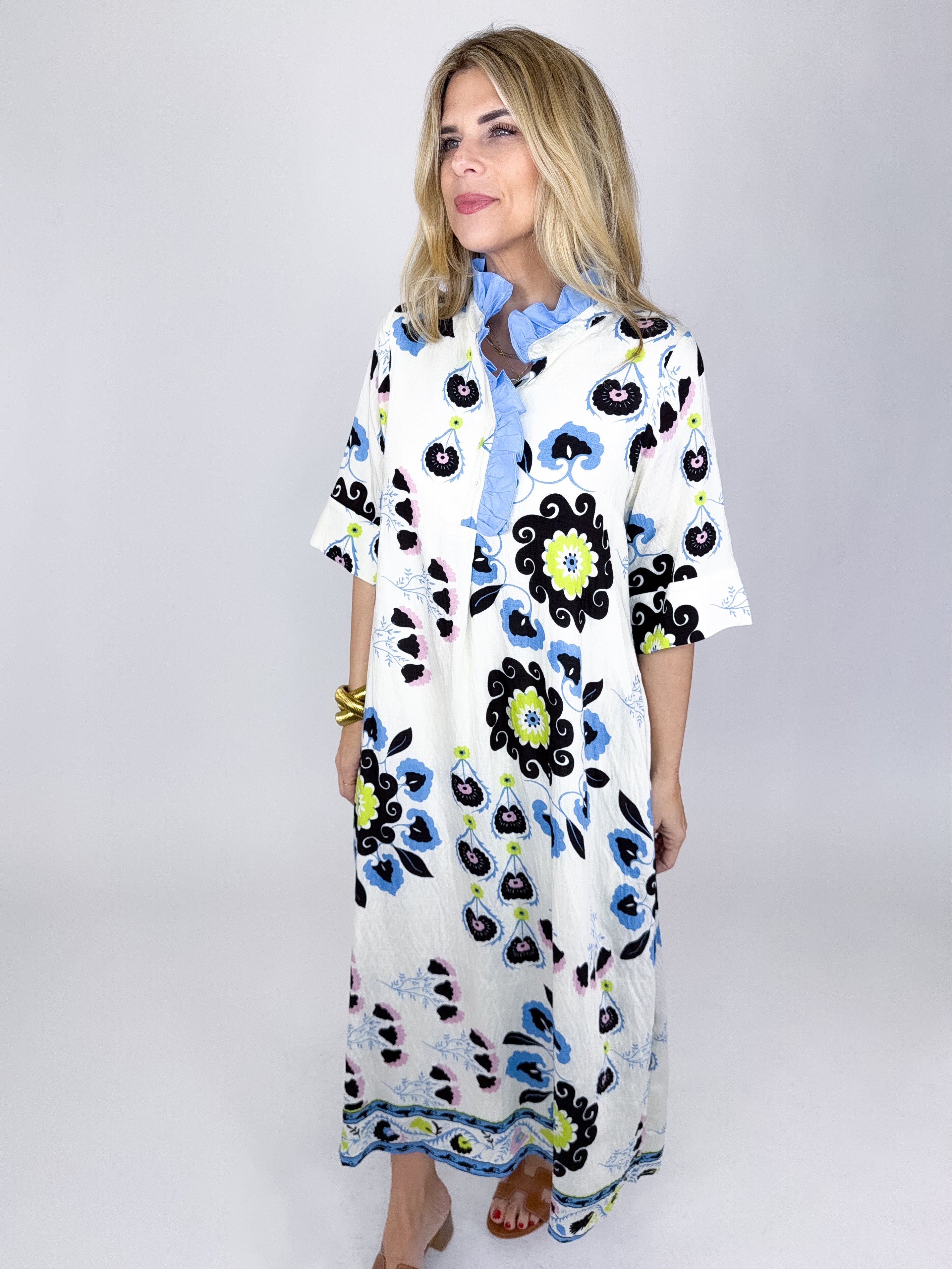 The Rosalyn Dress is a must have. This blue and white boho print maxi dress features short sleeves, high ruffle neckline and an easy fit roomy silhouette. Pockets. Lined. Style with flats, heels, wedges, boots and sneakers! Fits true to size.