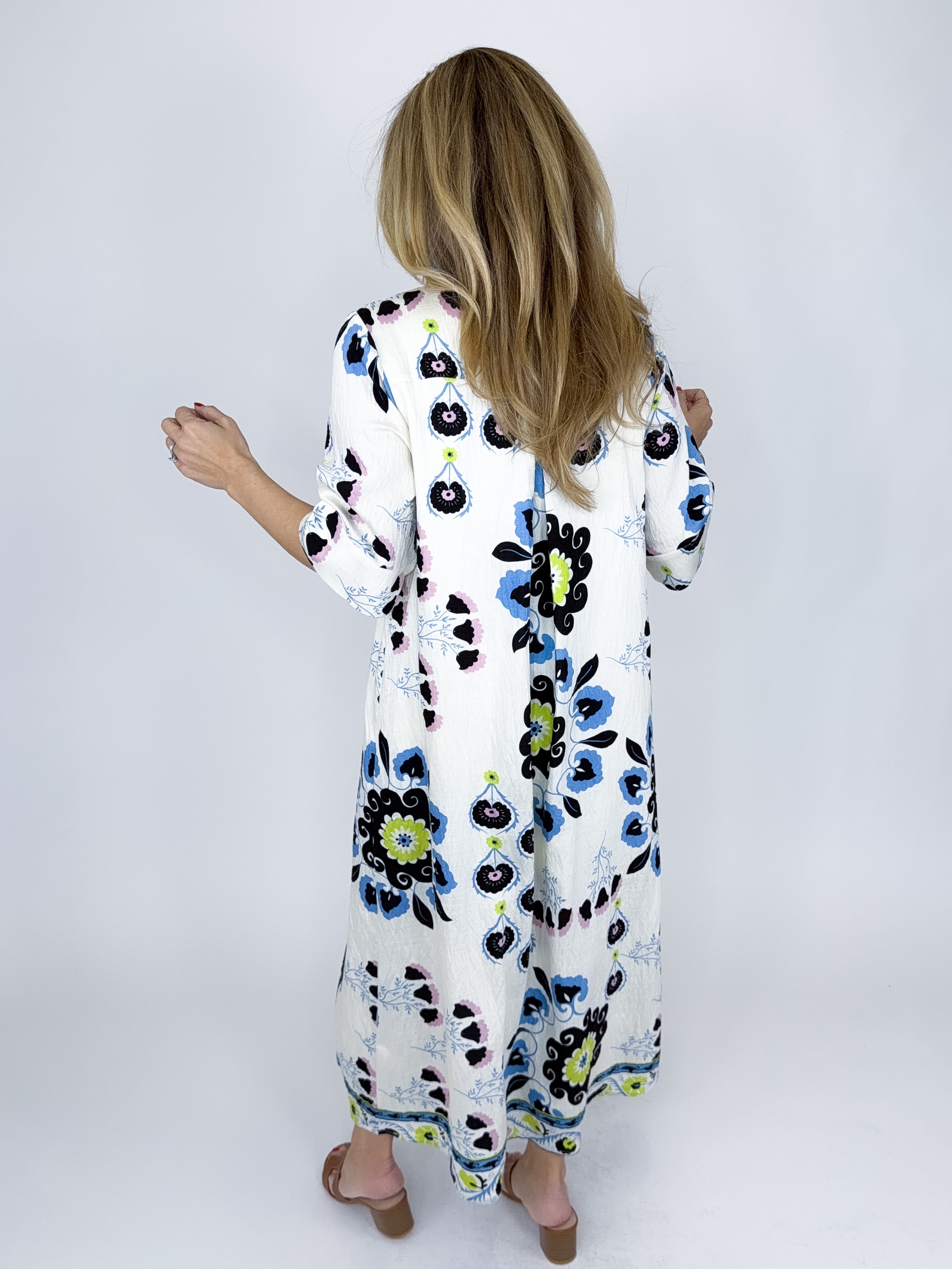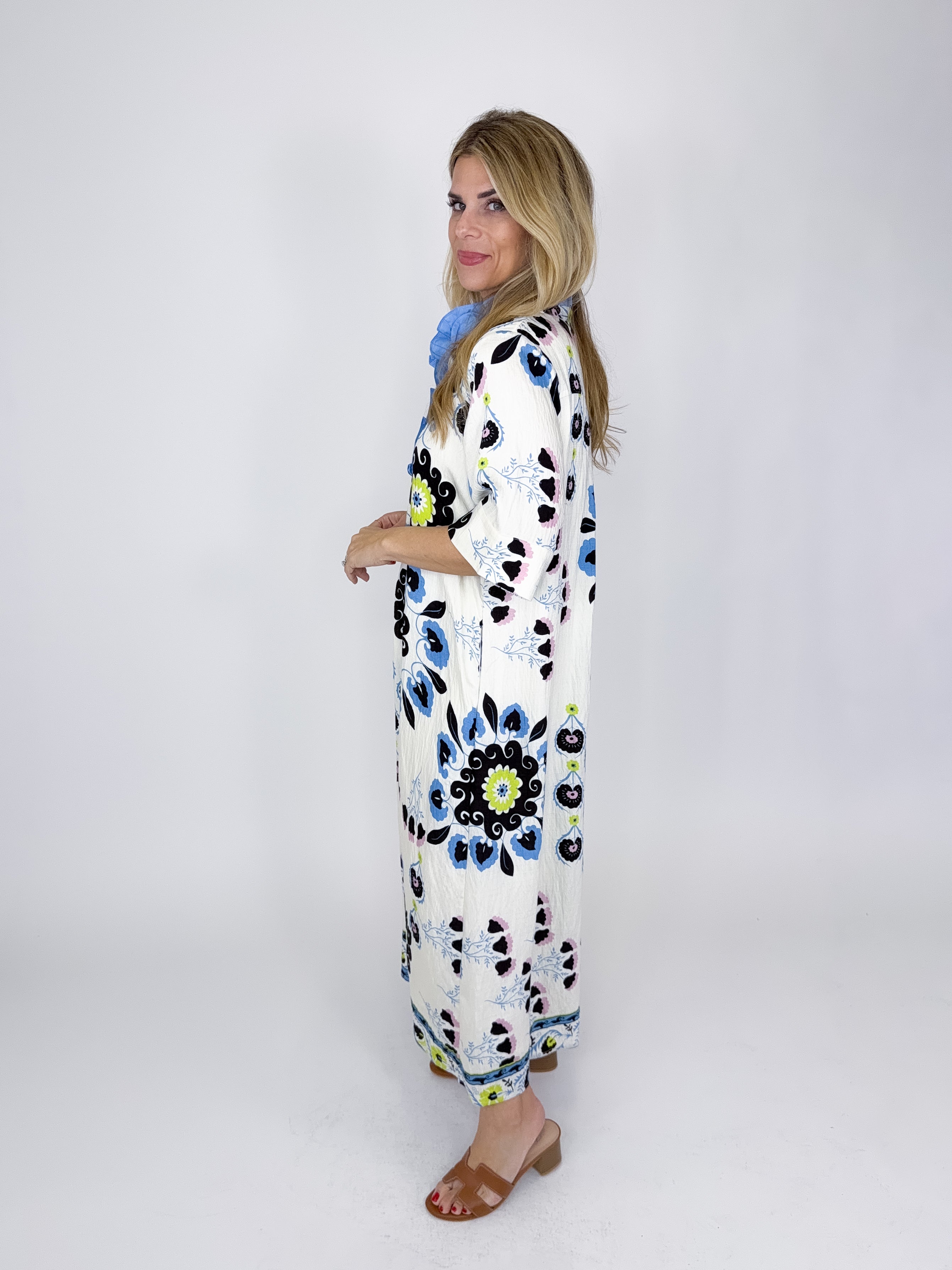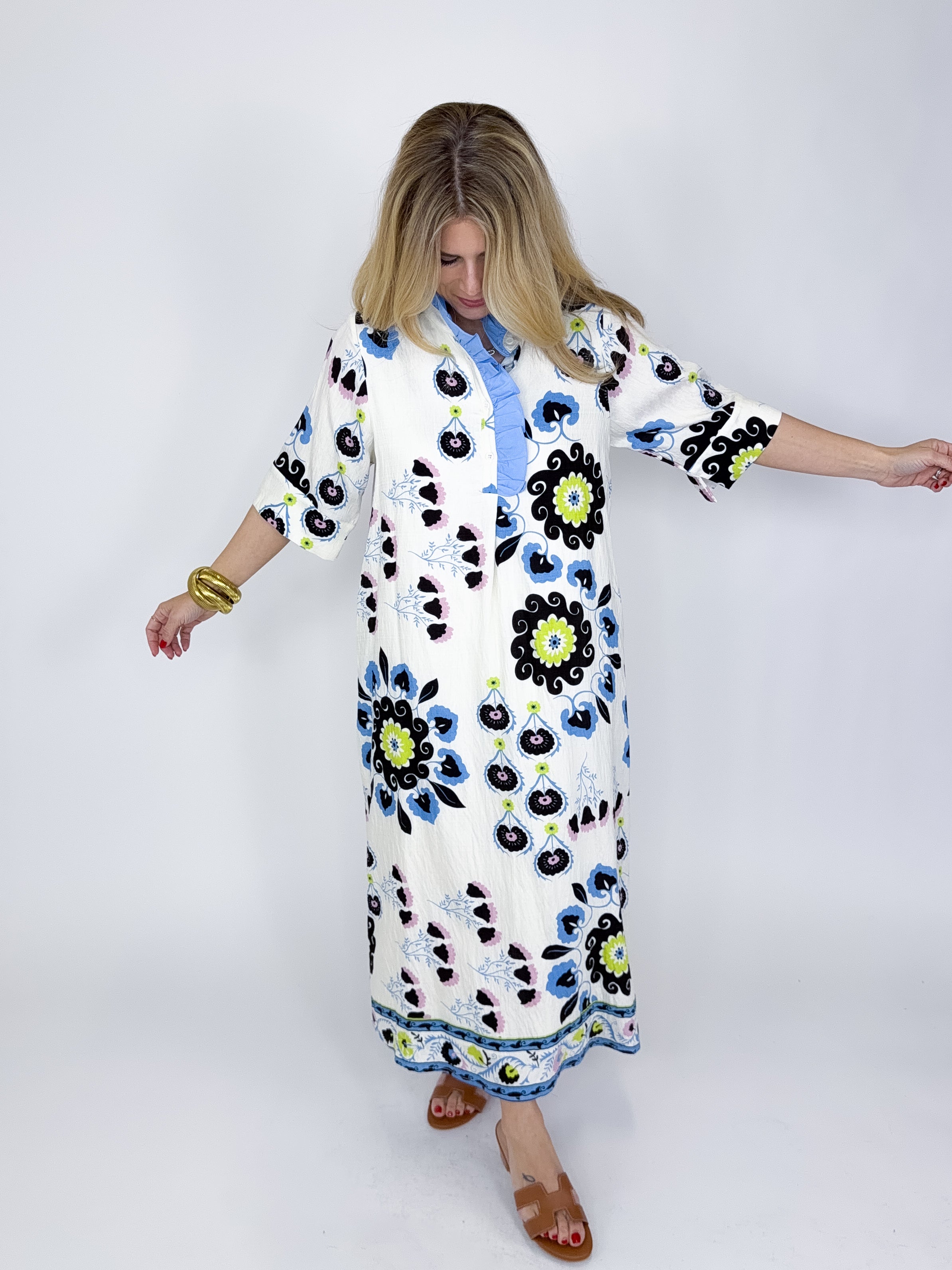 The Rosalyn Dress is a must have. This blue and white boho print maxi dress features short sleeves, high ruffle neckline and an easy fit roomy silhouette. Pockets. Lined. Style with flats, heels, wedges, boots and sneakers! Fits true to size.