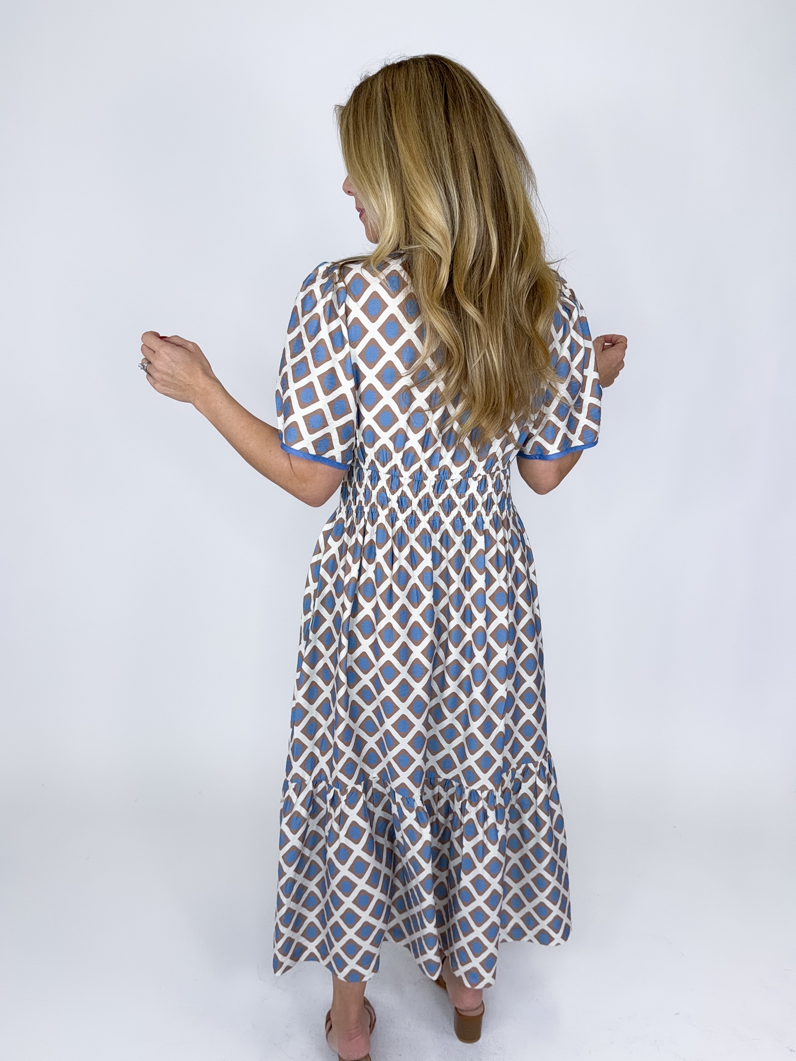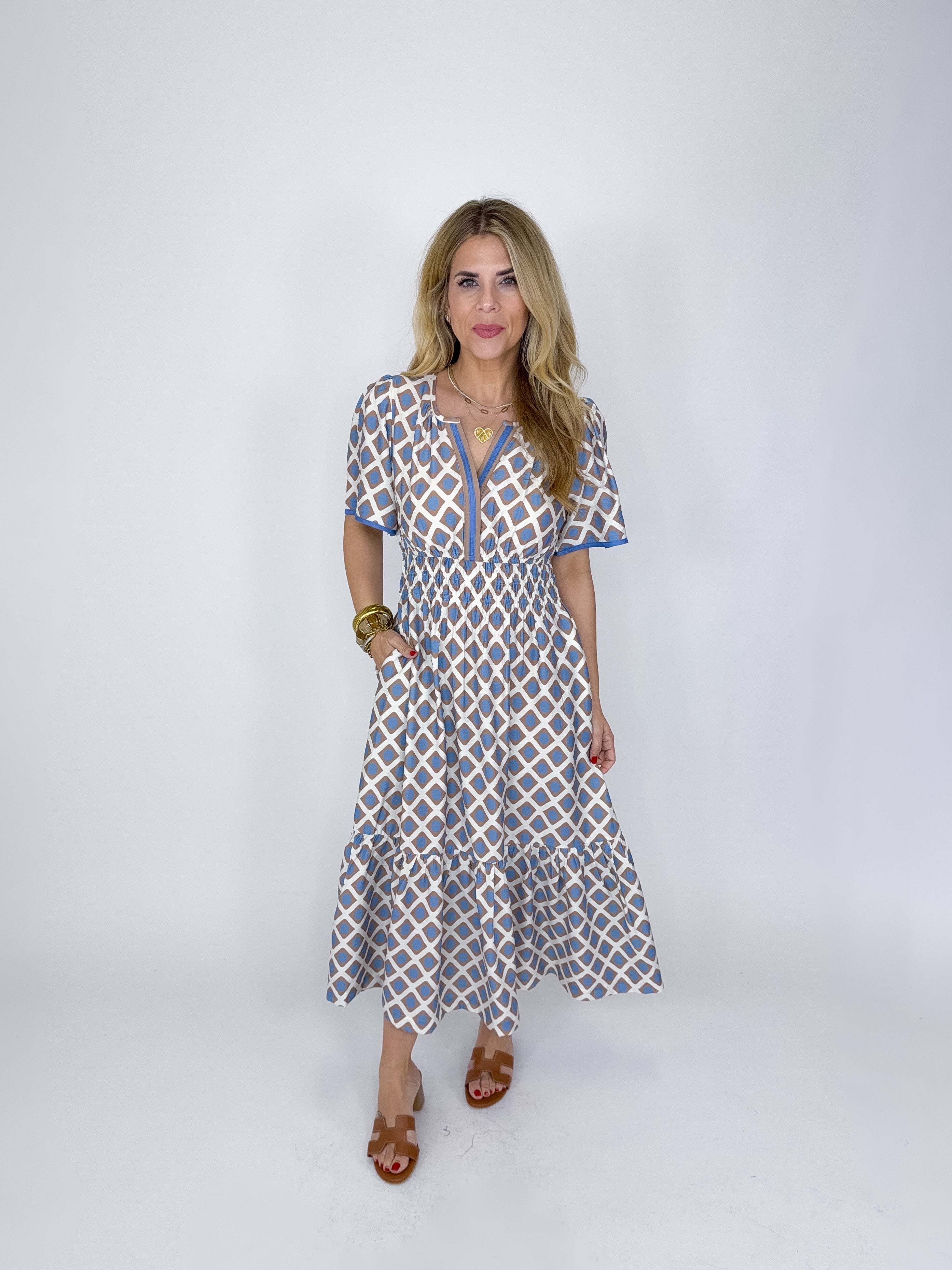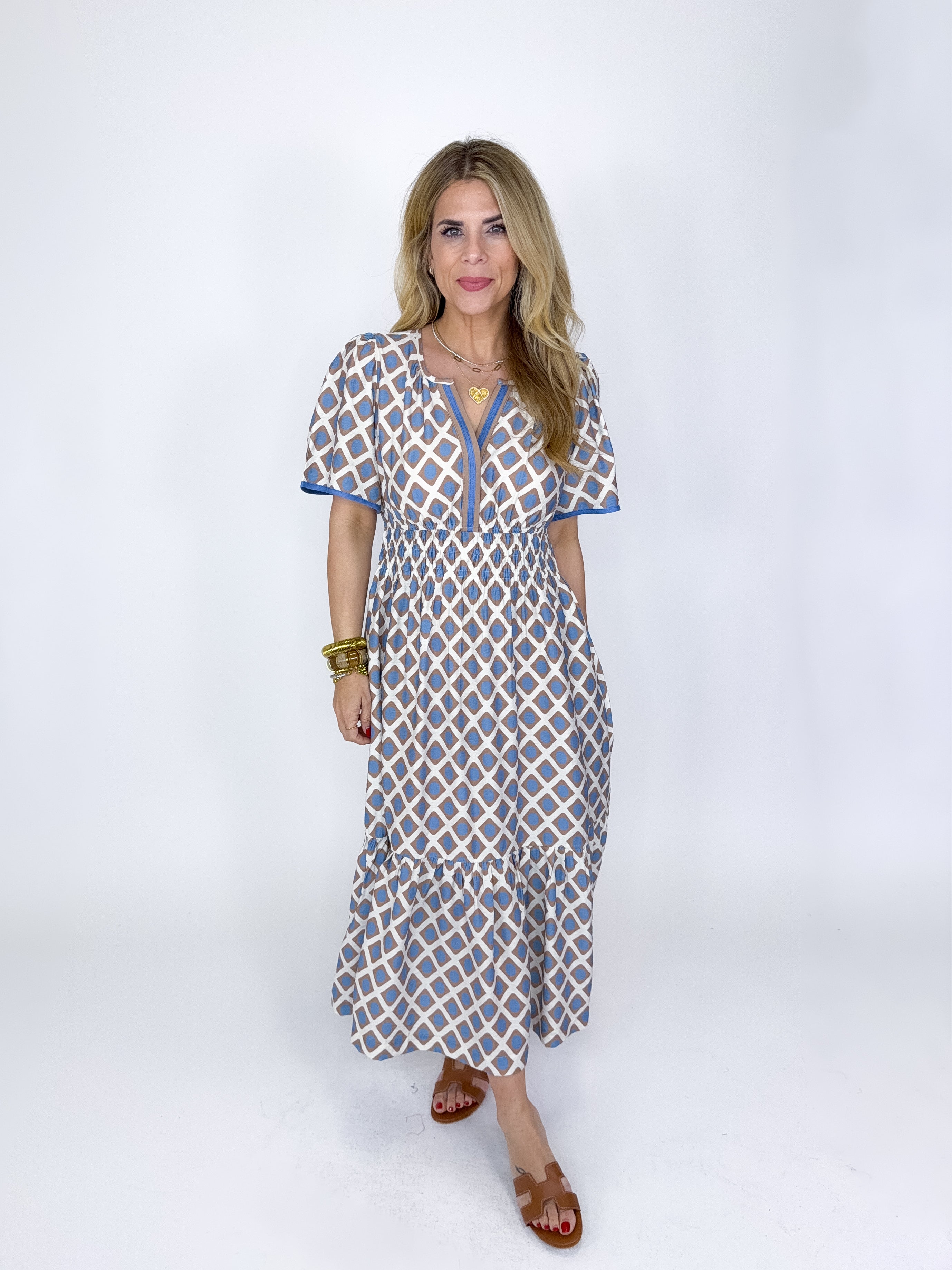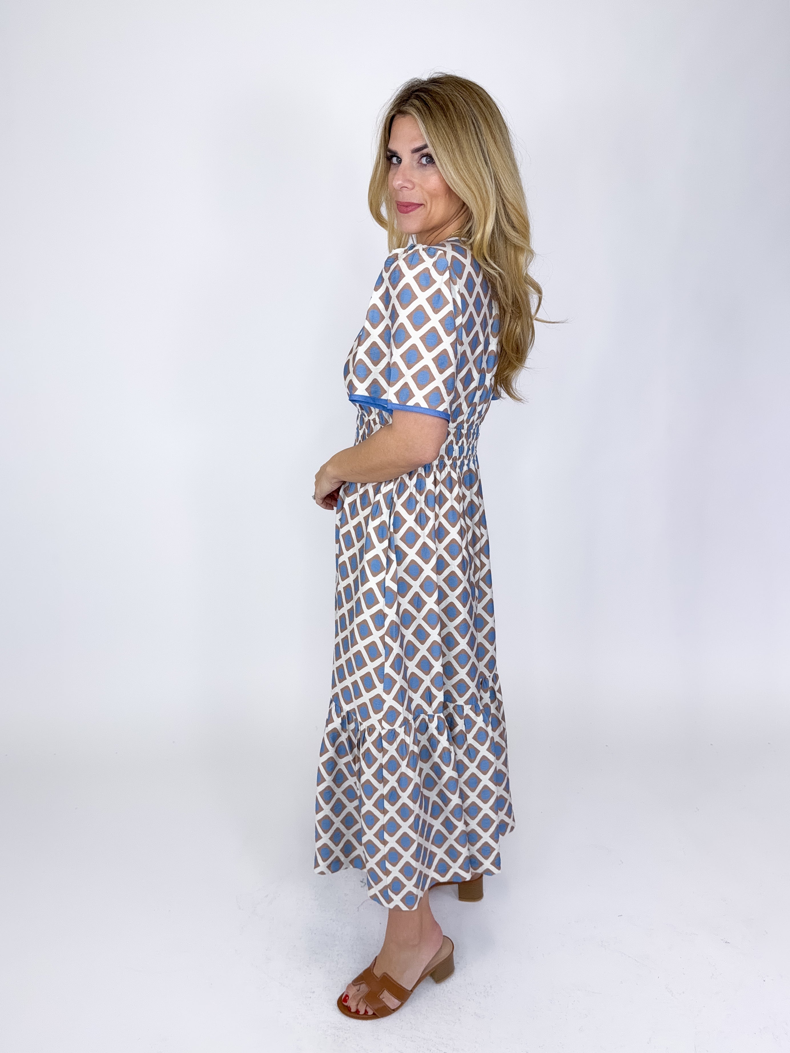 The Selene Dress is a must have. This taupe and blue geometric print midi dress features short sleeves, smocked waist, v- neck and a tired skirt. Pockets. Style with flats, heels, wedges, boots and sneakers! Fits true to size.