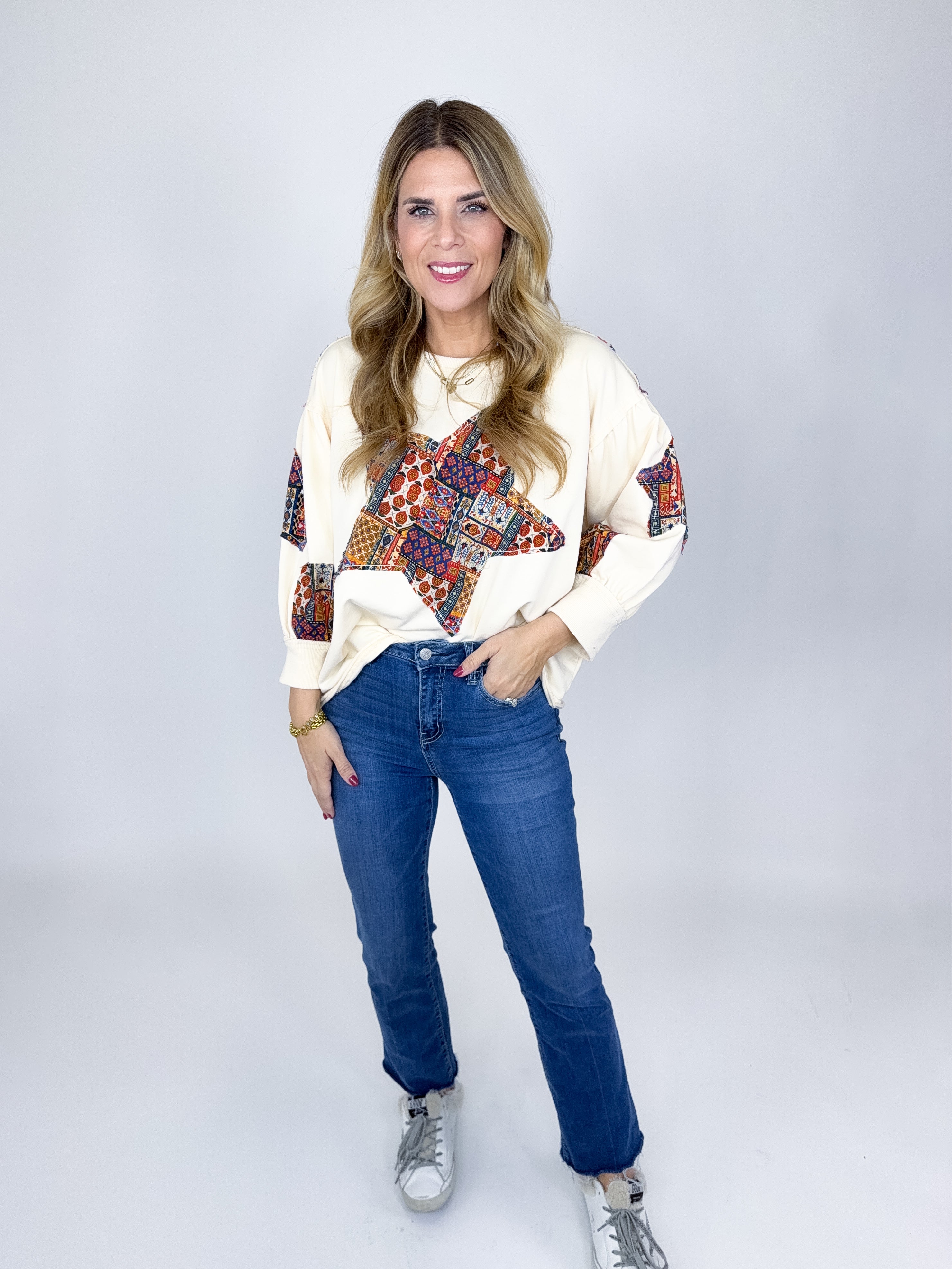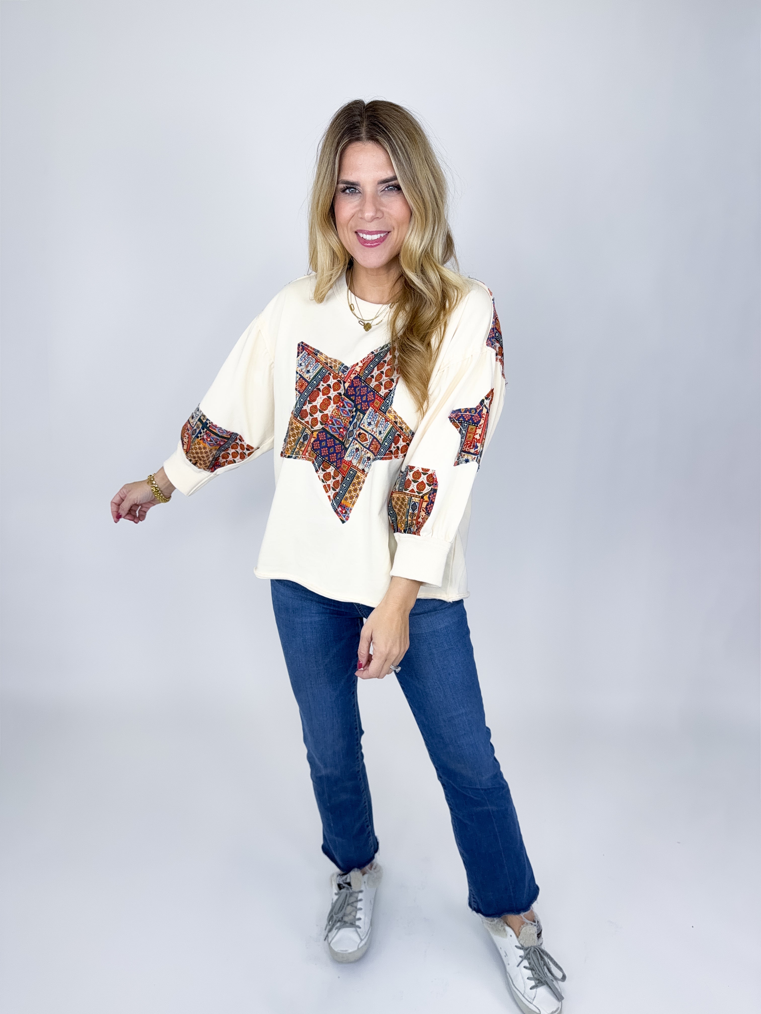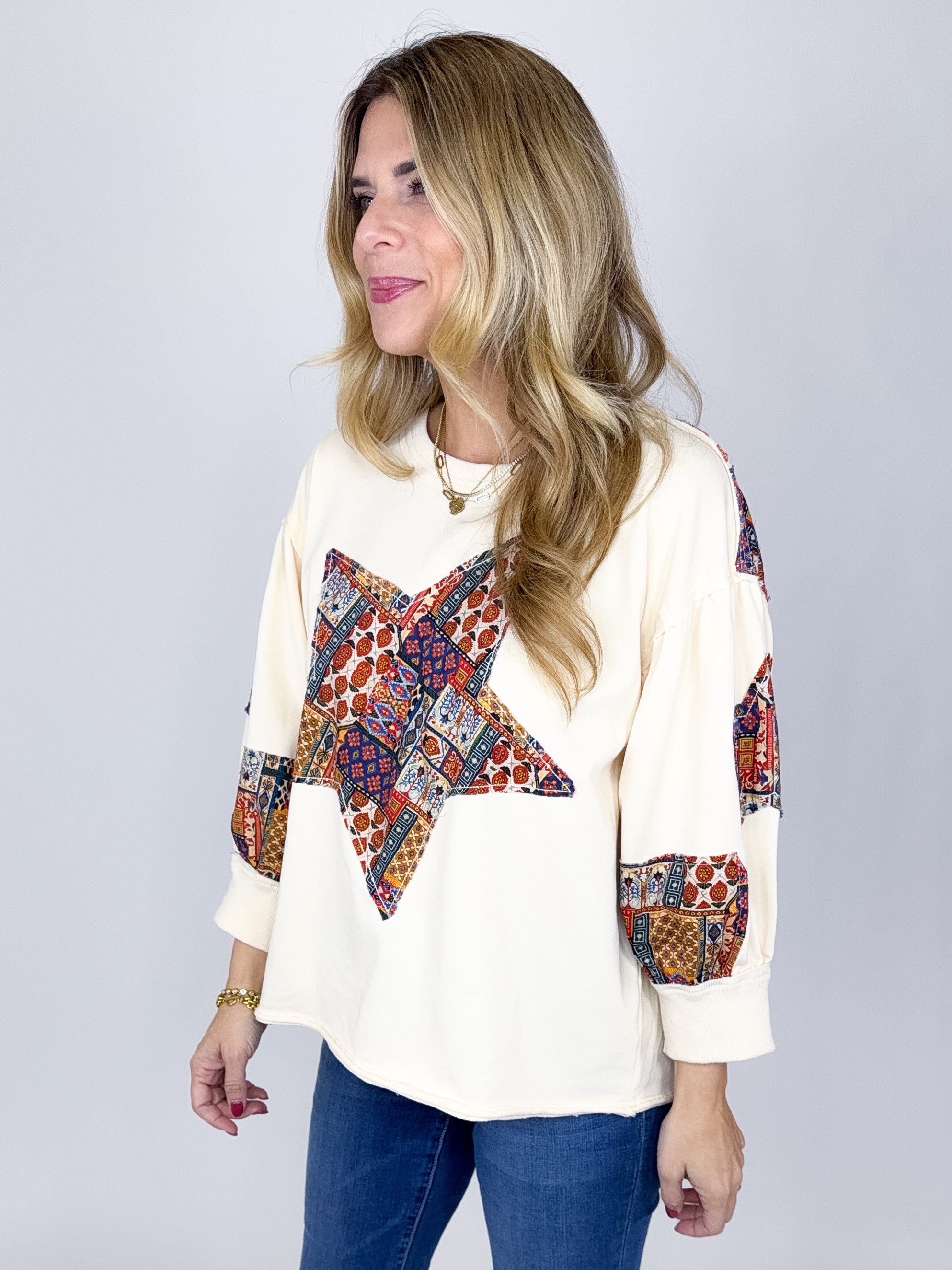 The Sky Top is the perfect everyday top. This super soft jersey knit mixed media cream top features a drop shoulder, 3/4 sleeves, patchwork star print, raw hem and a pleated back with patchwork print. Pair with denim, flats, leggings and sneakers. Relaxed fit.