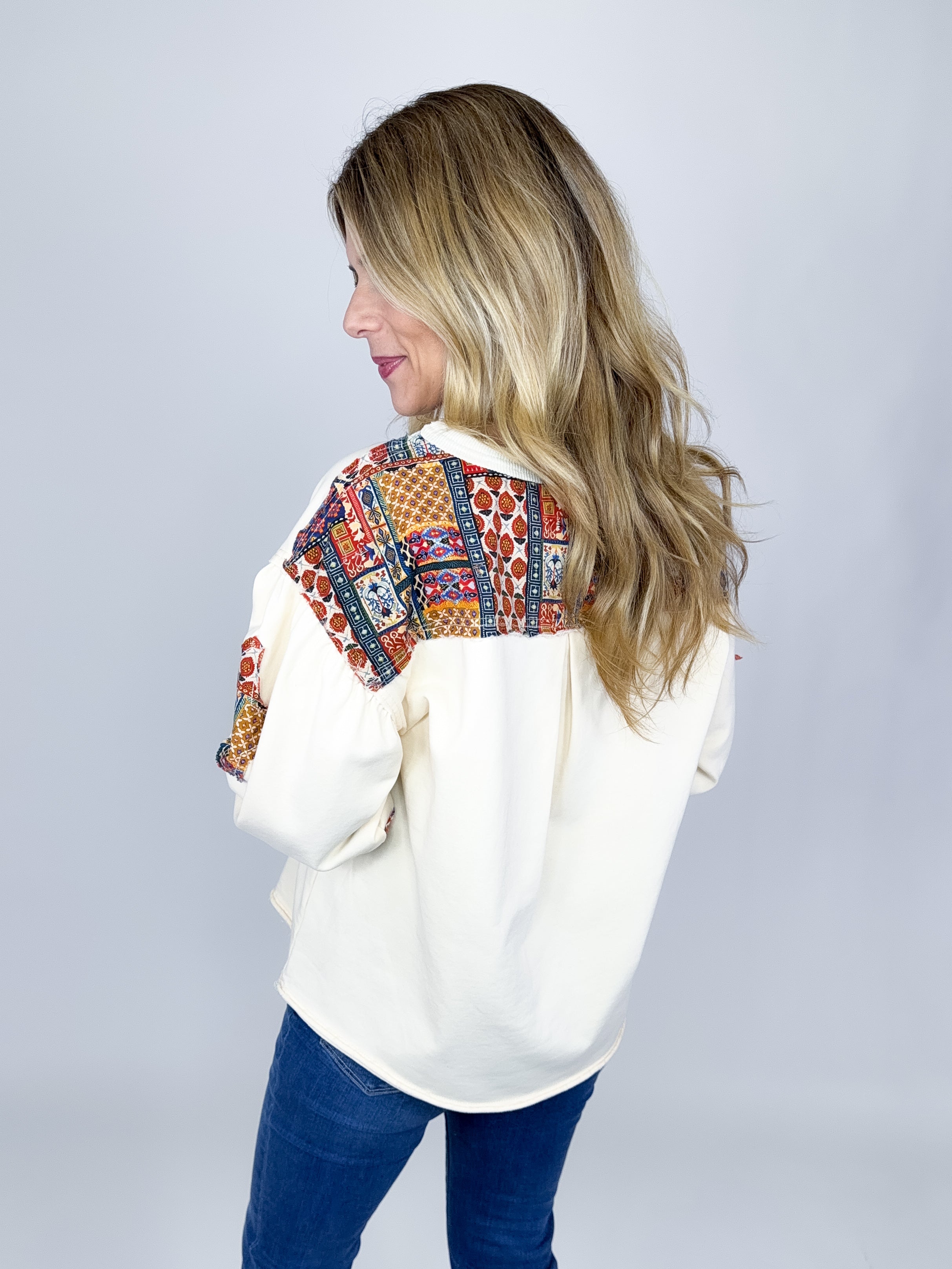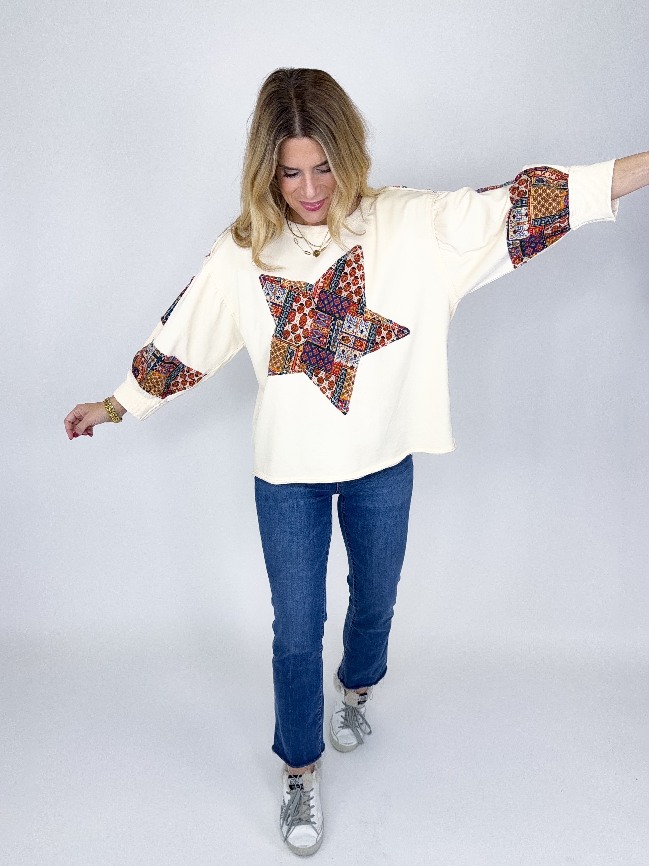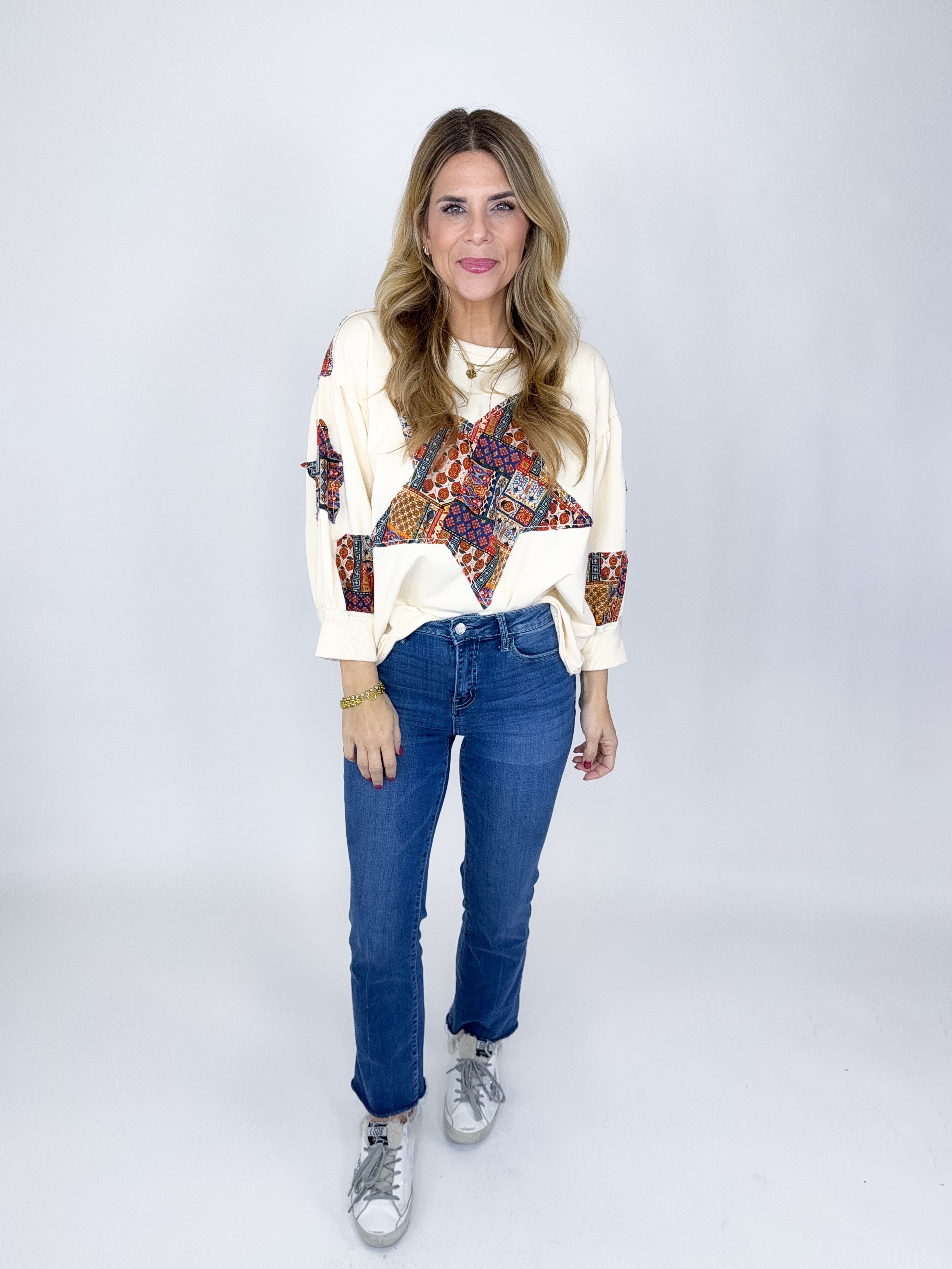 The Sky Top is the perfect everyday top. This super soft jersey knit mixed media cream top features a drop shoulder, 3/4 sleeves, patchwork star print, raw hem and a pleated back with patchwork print. Pair with denim, flats, leggings and sneakers. Relaxed fit.