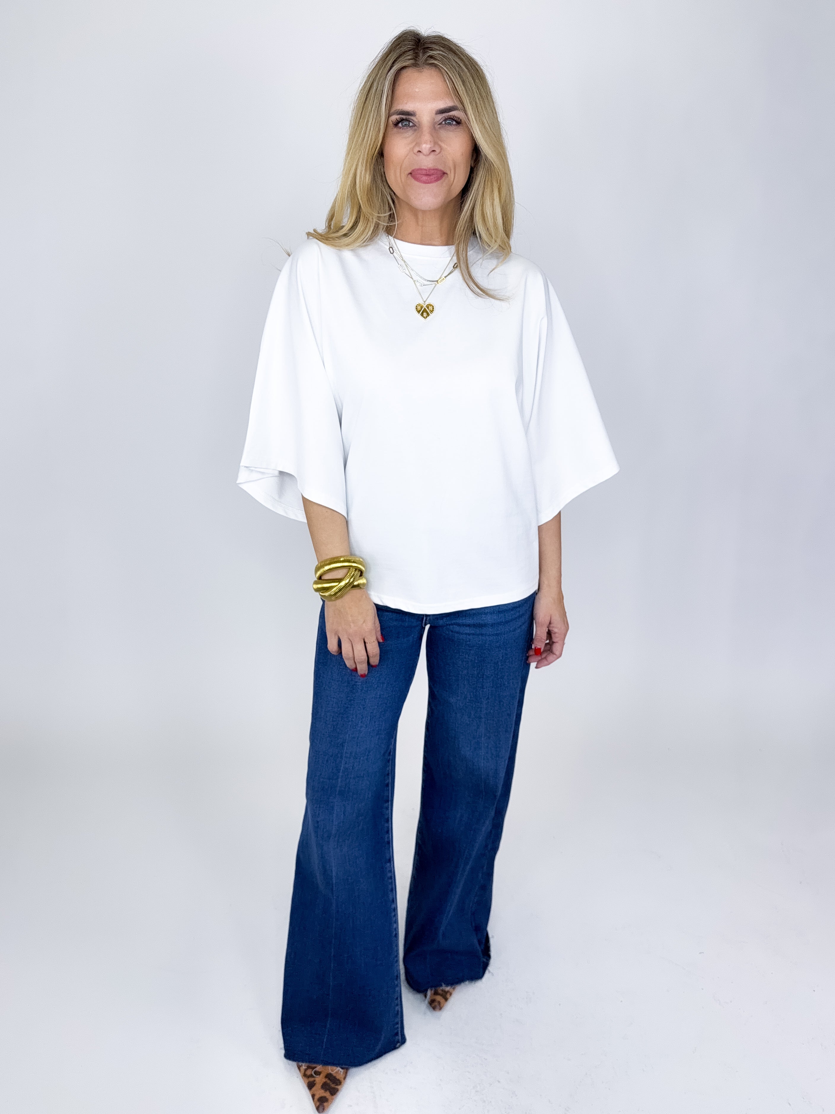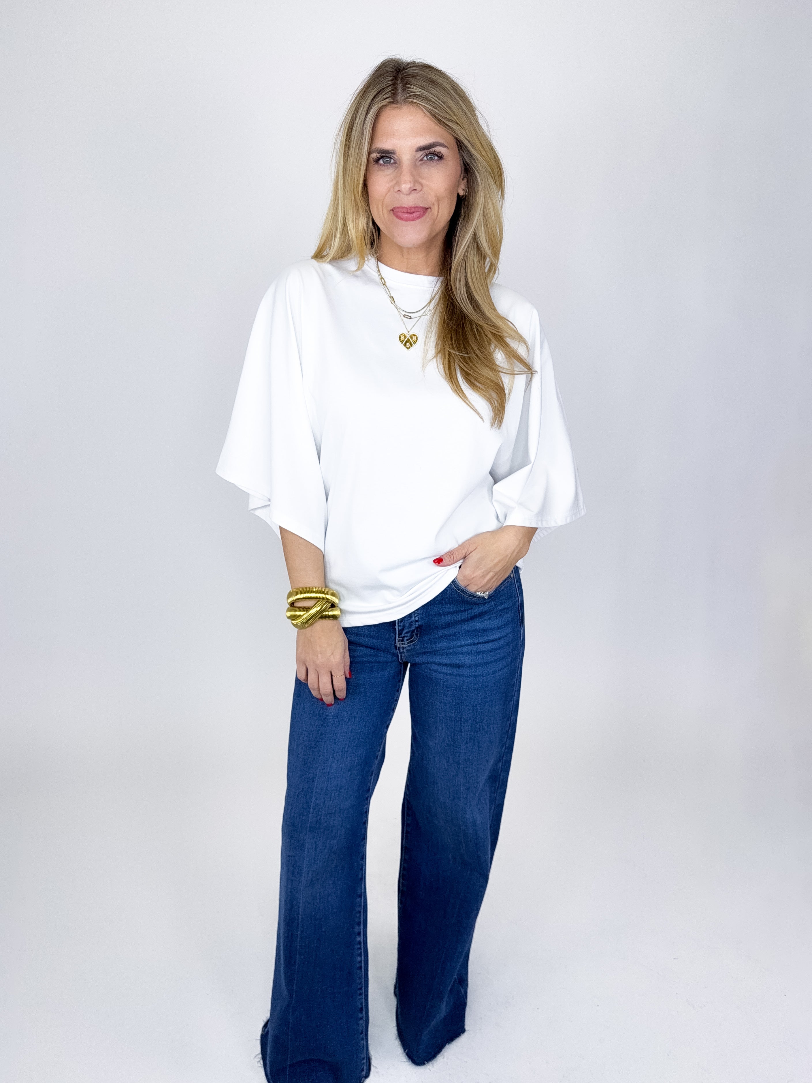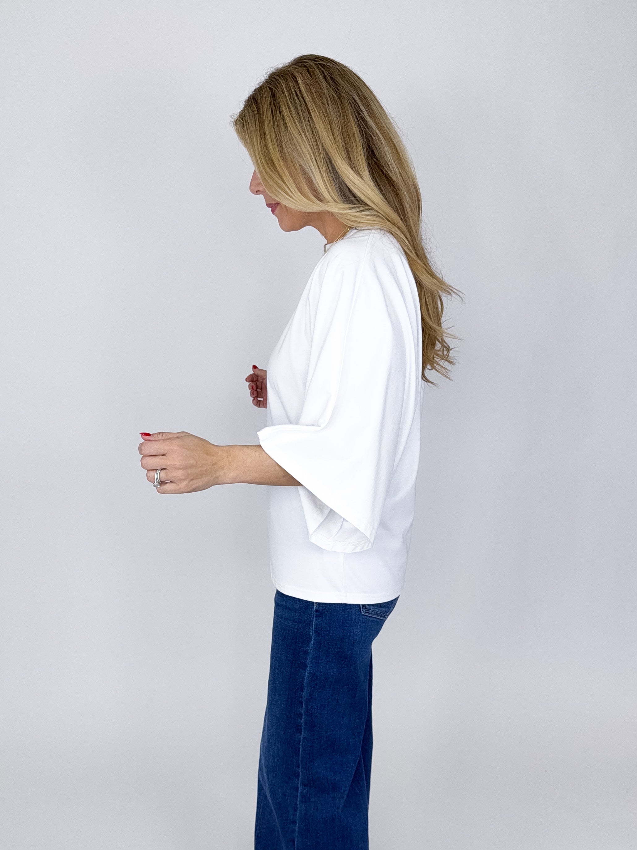 The Tess Top is such a fun top! This white top features a crew neckline, 3/4 dolman sleeves and great length. Pairs well with everything from denim, flats, heels, dress pants, skirts and more! Fits true to size.