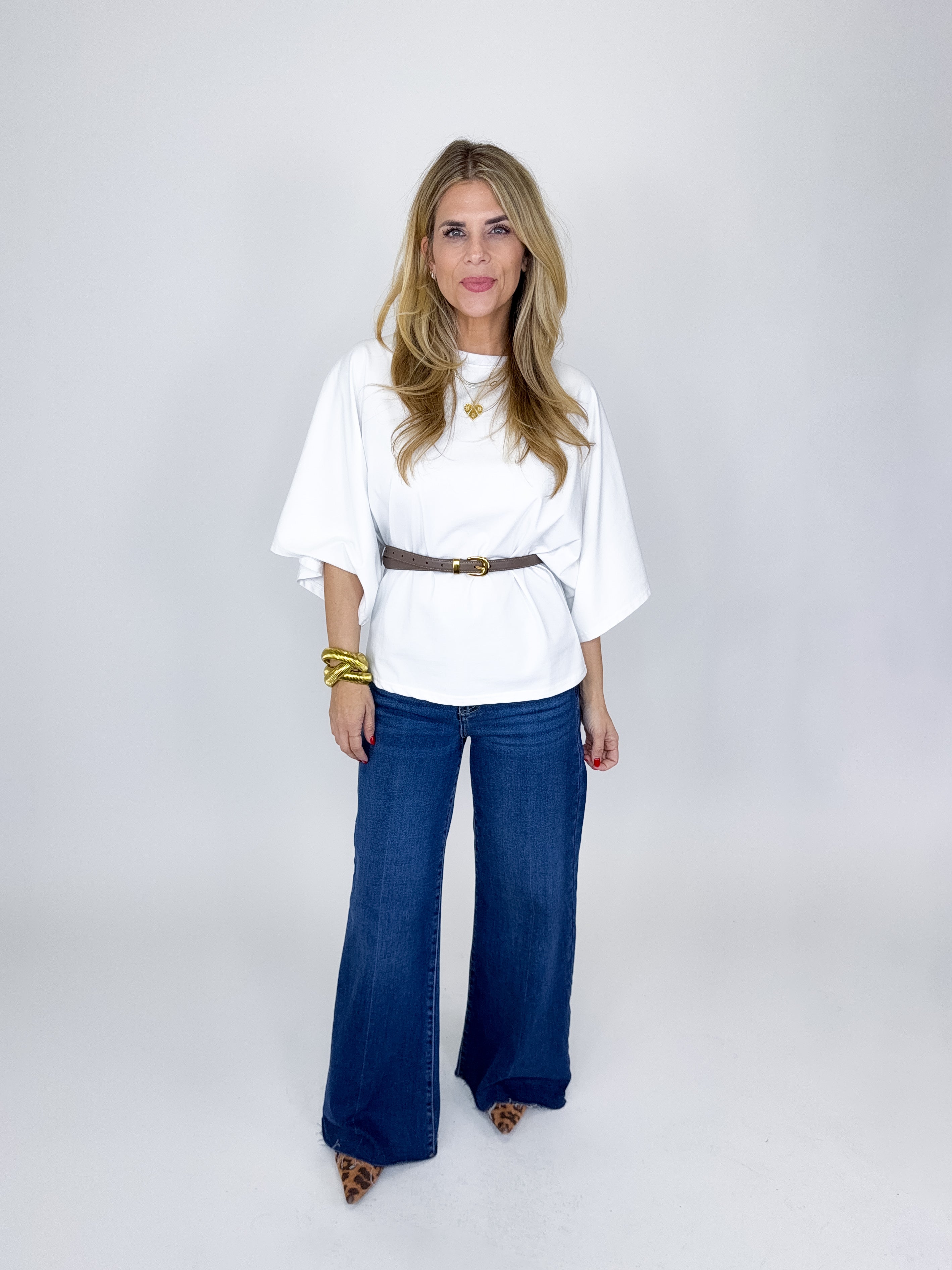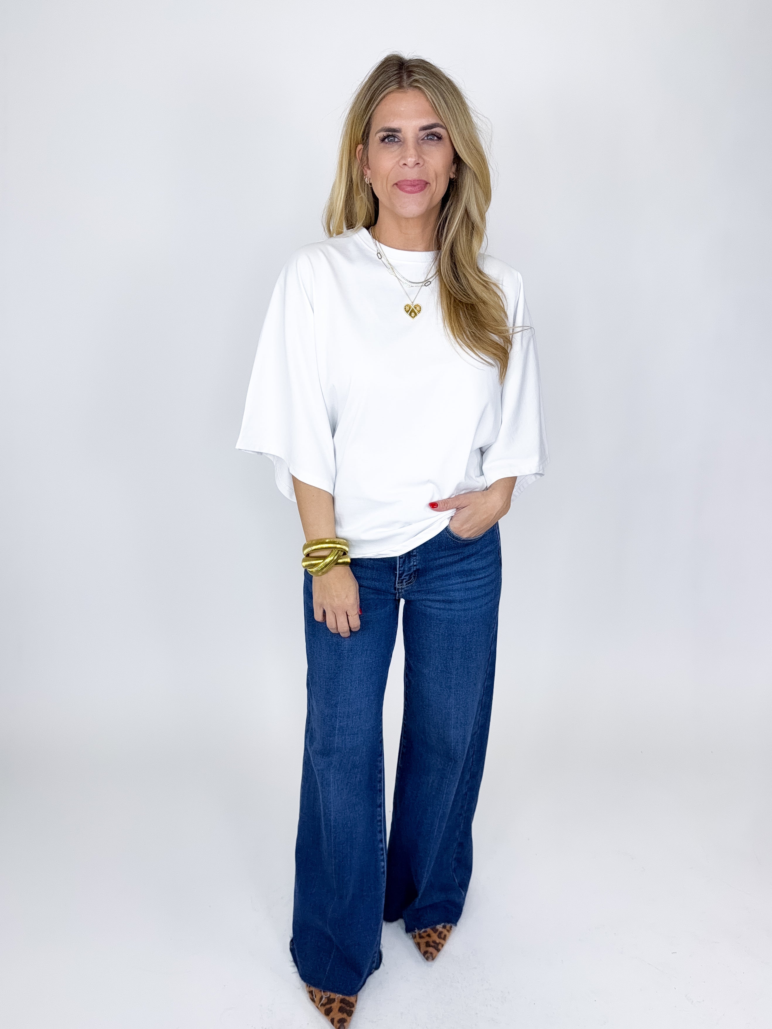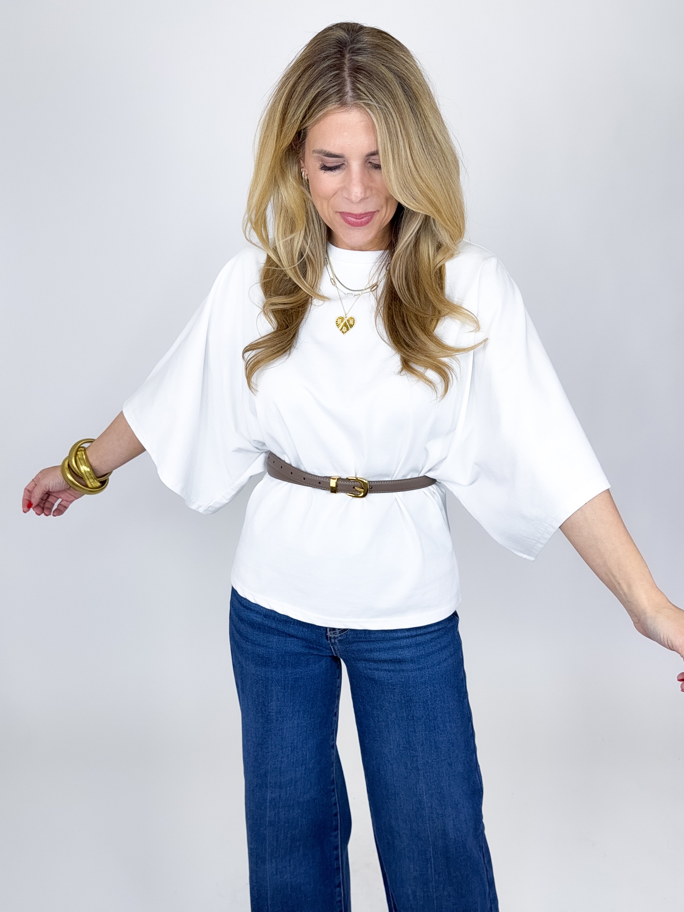 The Tess Top is such a fun top! This white top features a crew neckline, 3/4 dolman sleeves and great length. Pairs well with everything from denim, flats, heels, dress pants, skirts and more! Fits true to size.