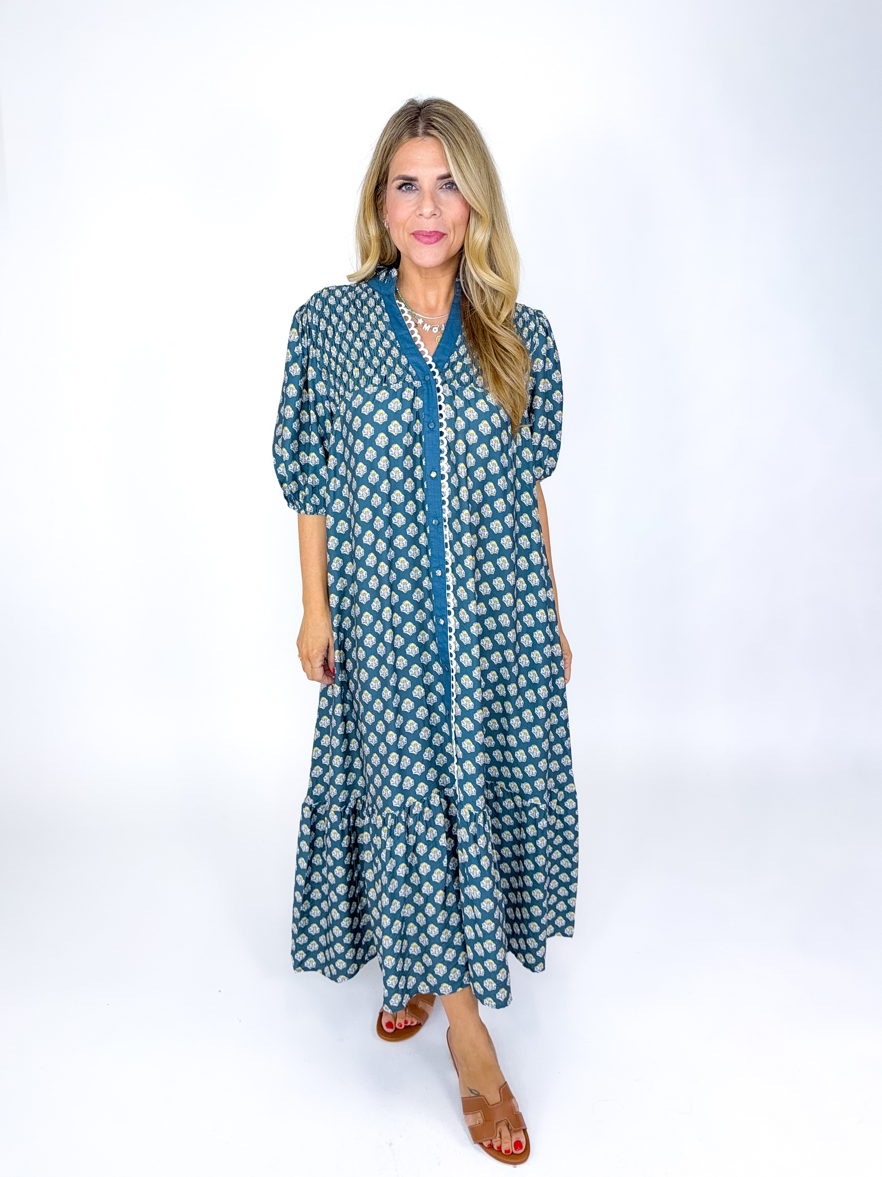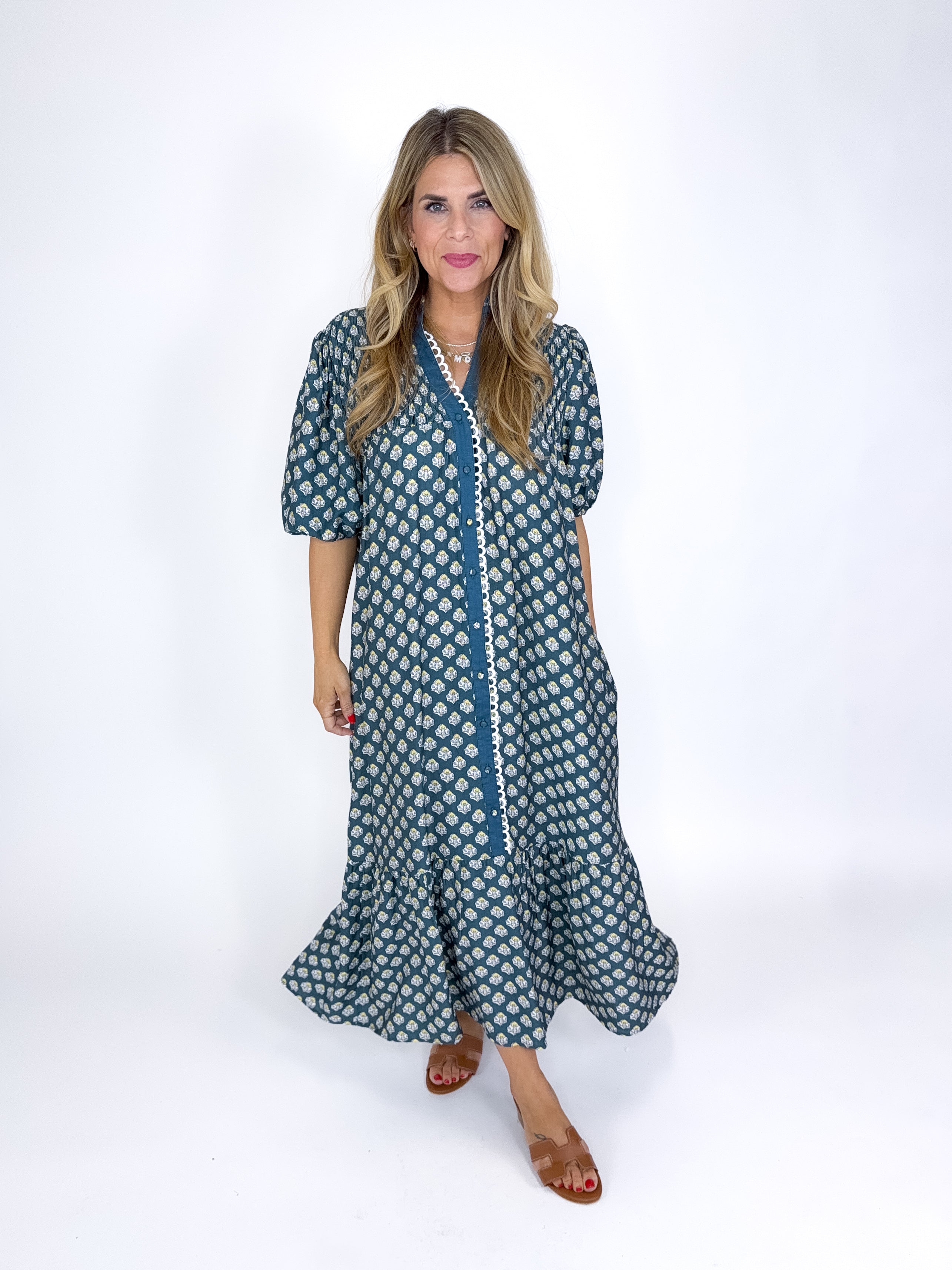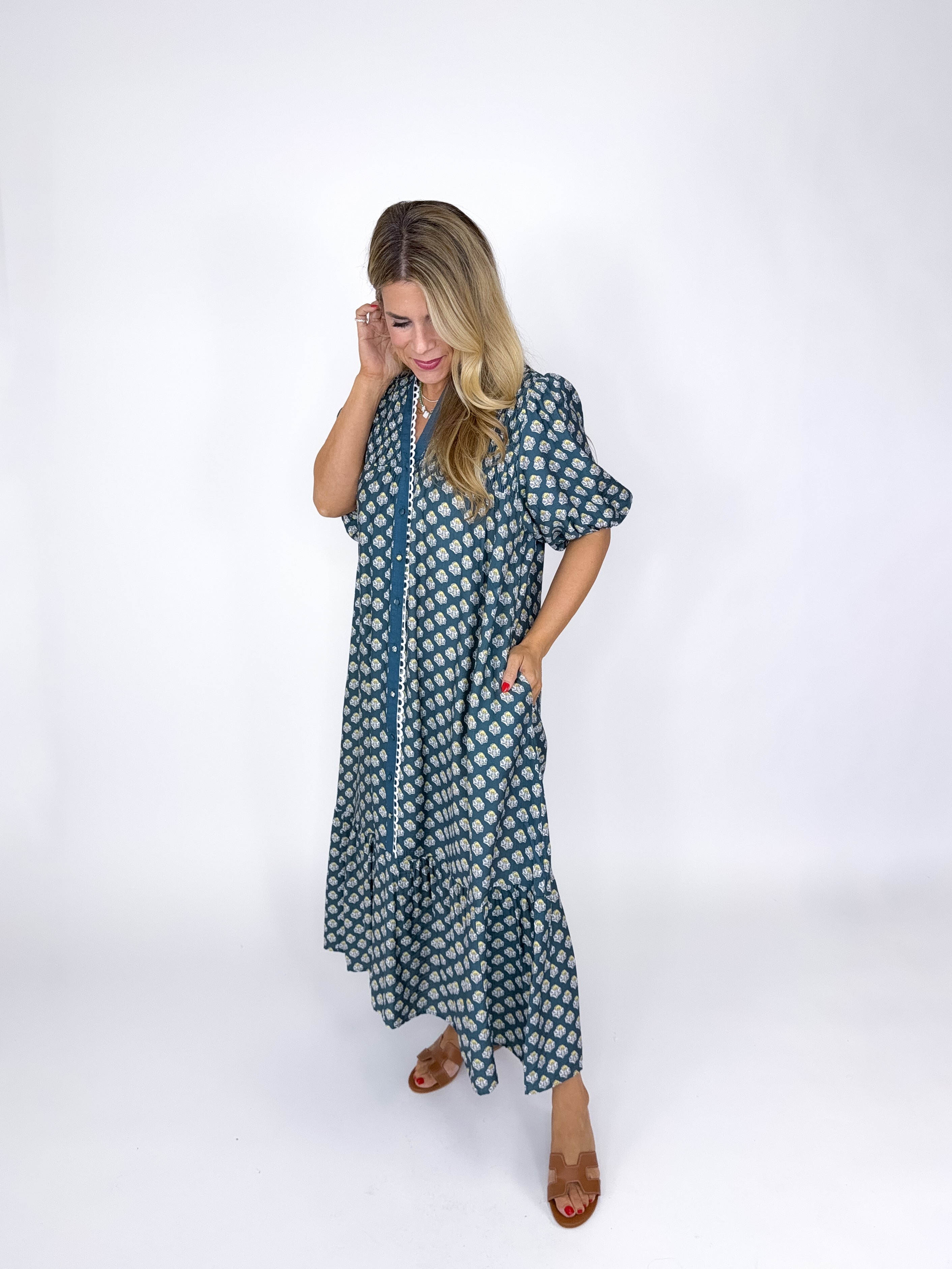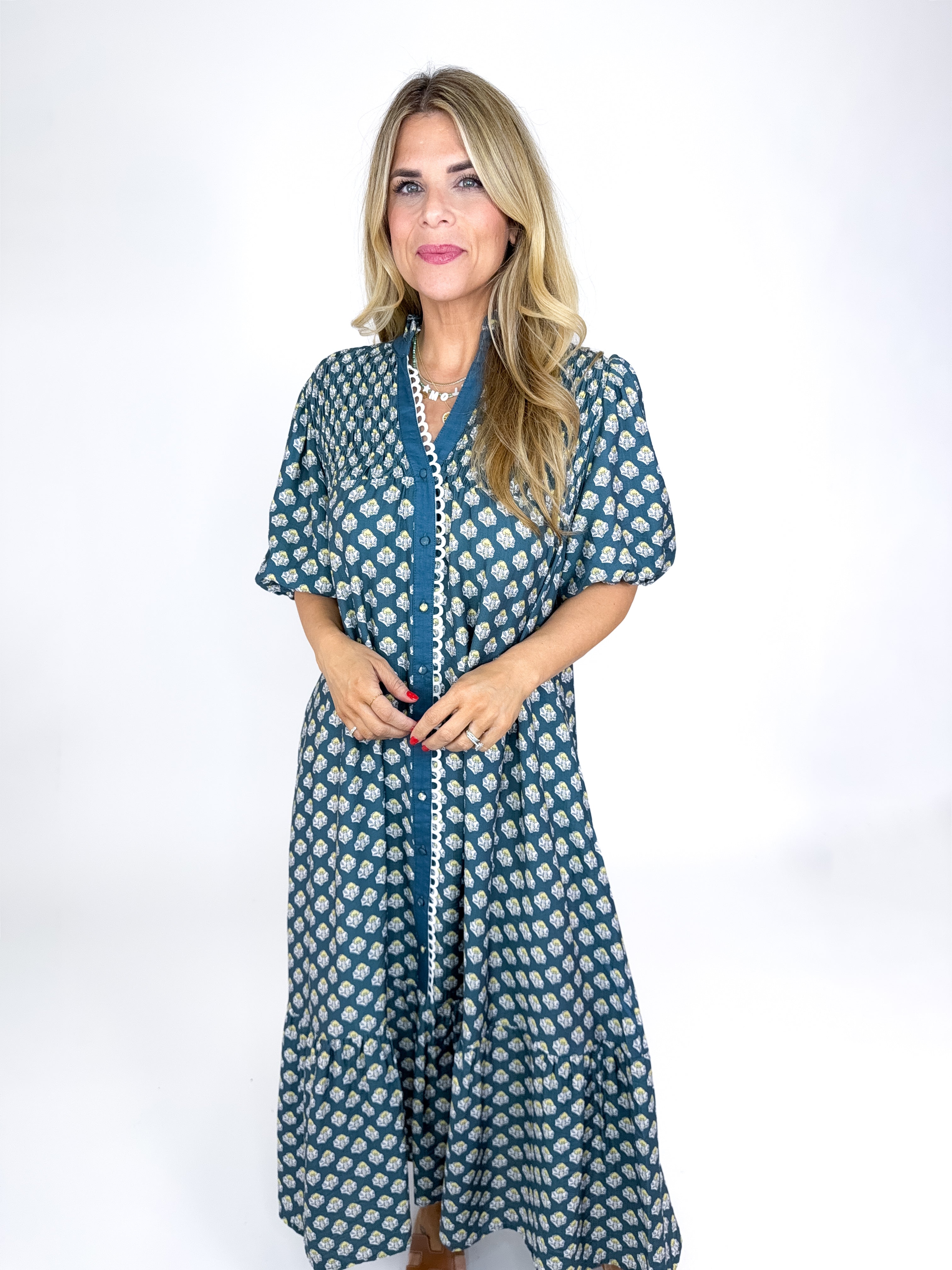 The Tully Dress is a must have. This teal block floral print midi dress features short puff sleeves, ruffle mock neck, smocking across chest, v-neck button front with eyelet contrast trim and a ruffle peplum hem. Pockets. Style with flats, heels, wedges, boots and sneakers! Fits true to size.