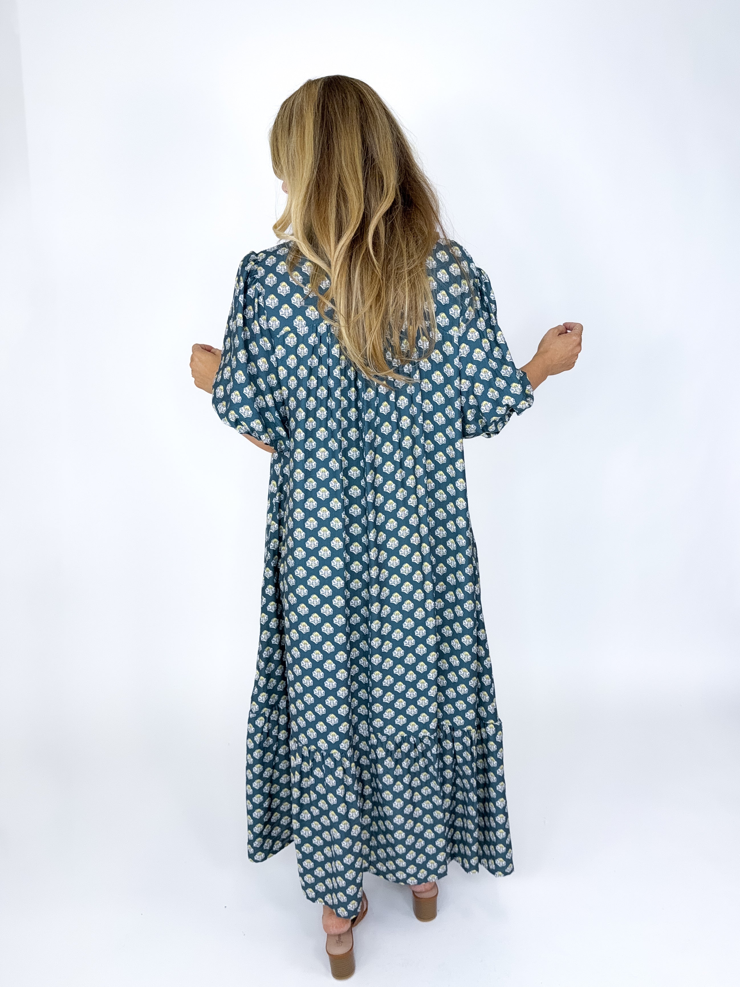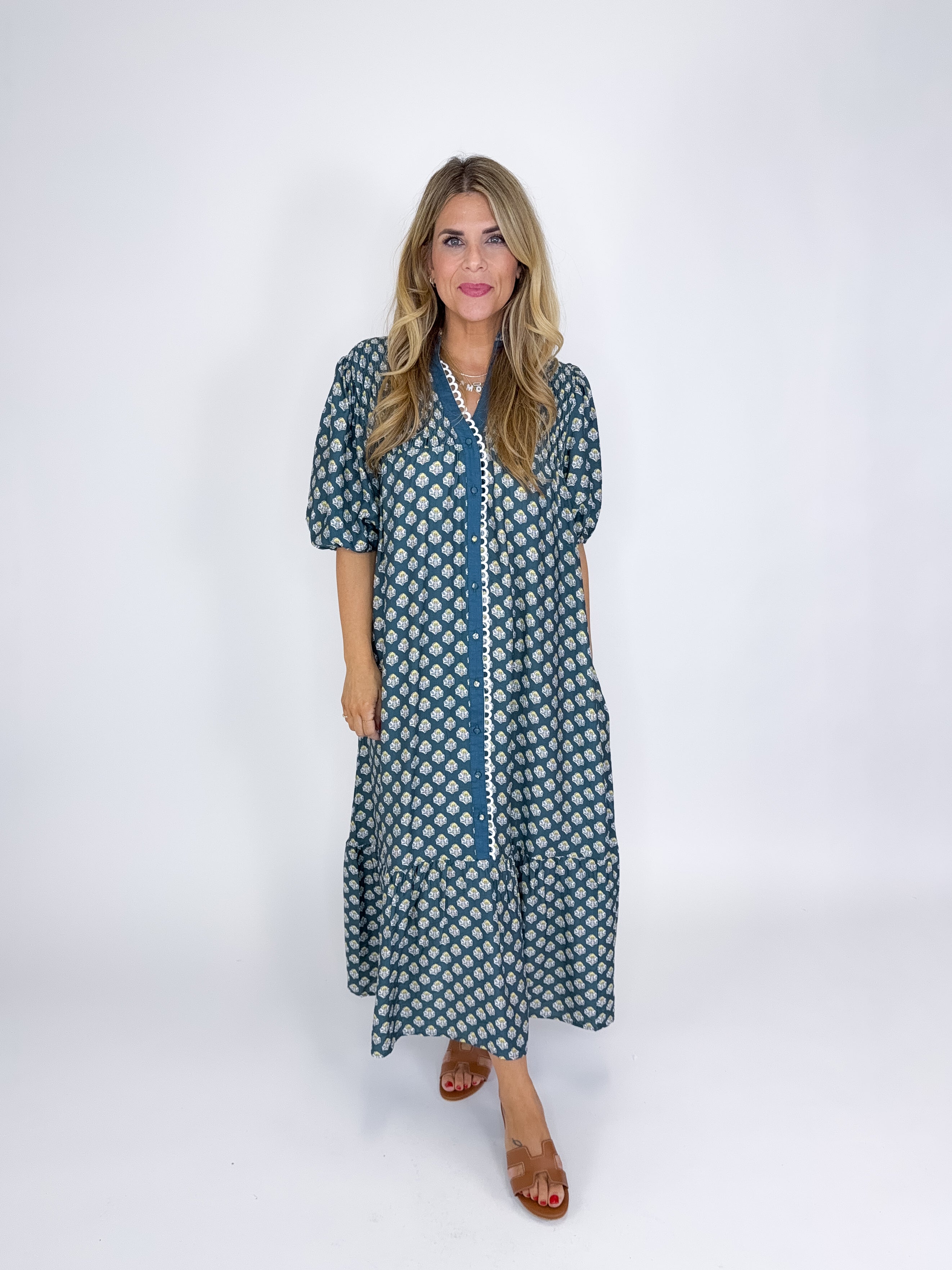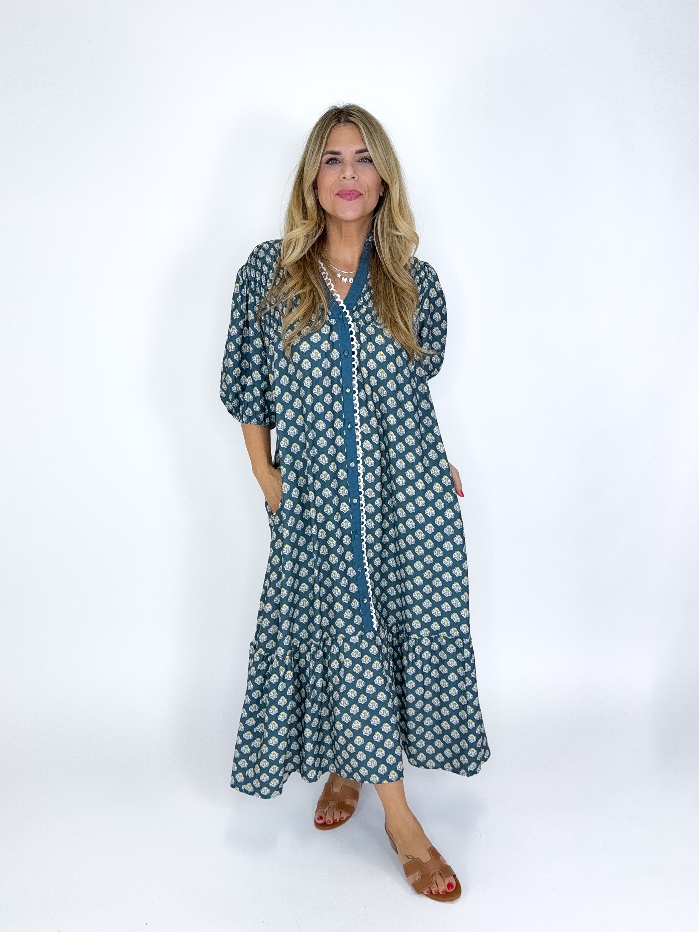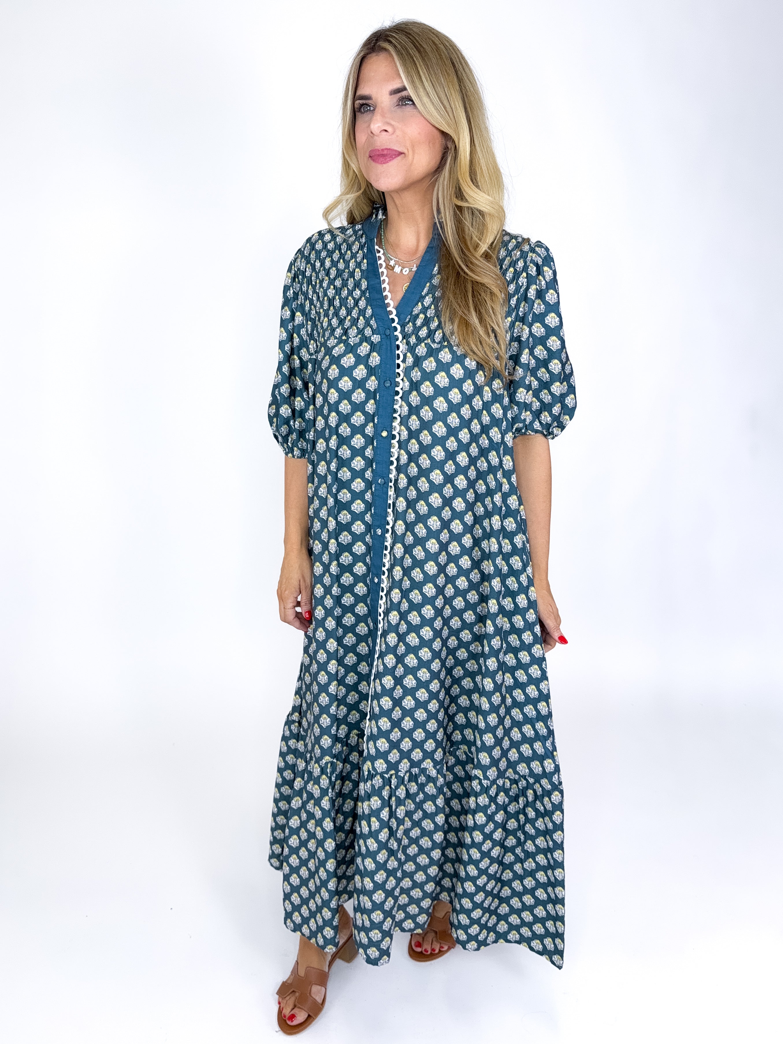 The Tully Dress is a must have. This teal block floral print midi dress features short puff sleeves, ruffle mock neck, smocking across chest, v-neck button front with eyelet contrast trim and a ruffle peplum hem. Pockets. Style with flats, heels, wedges, boots and sneakers! Fits true to size.