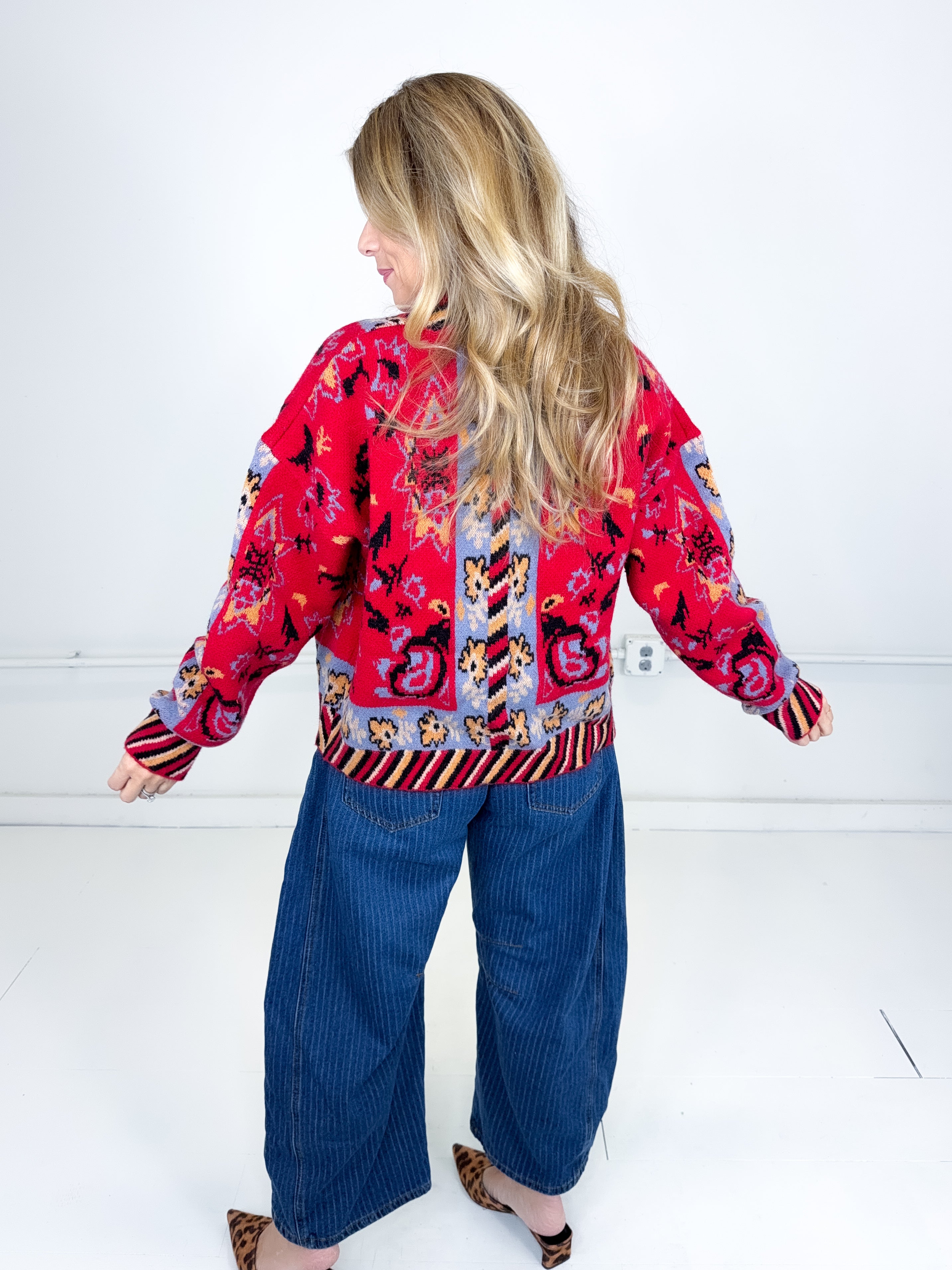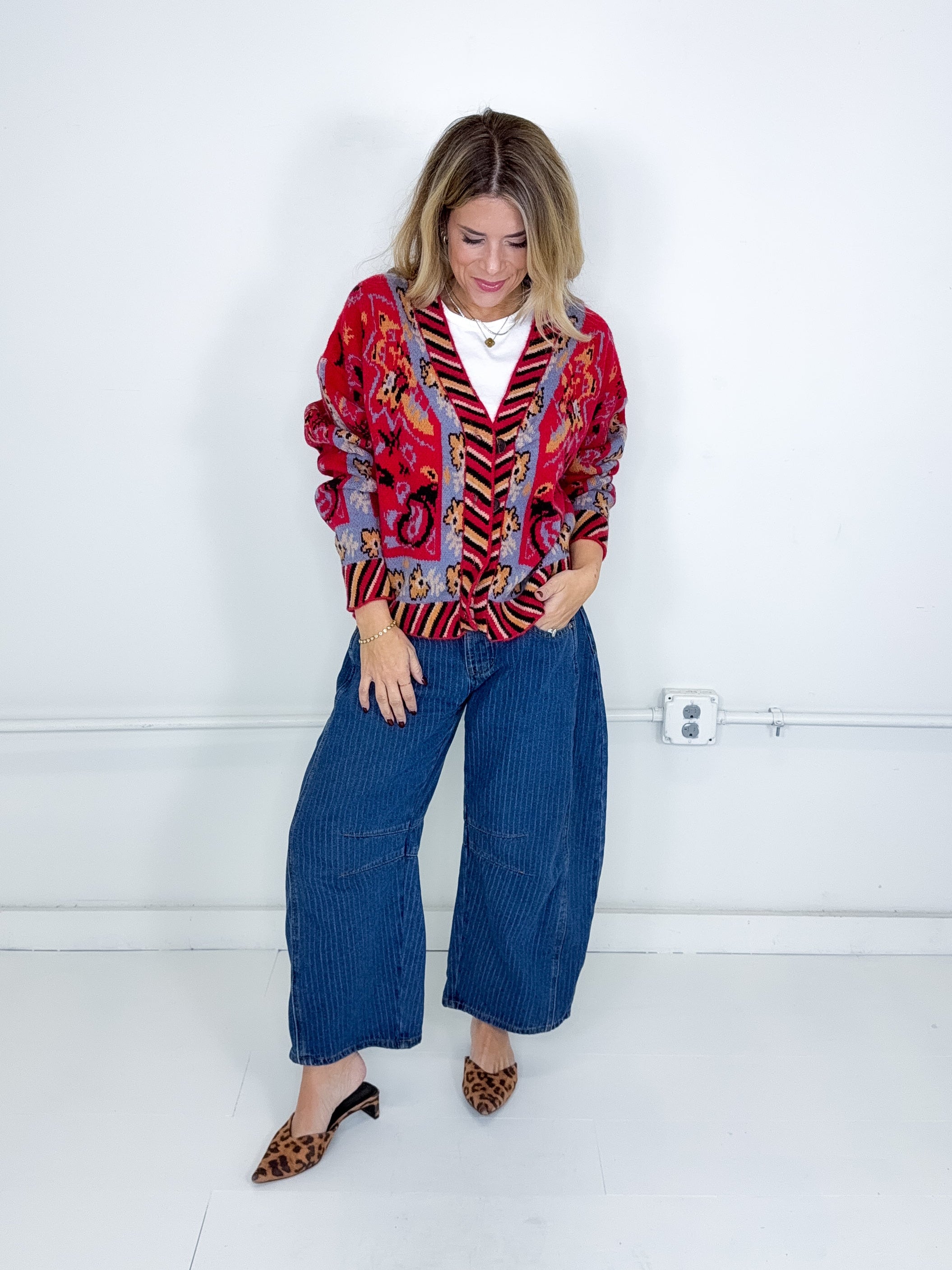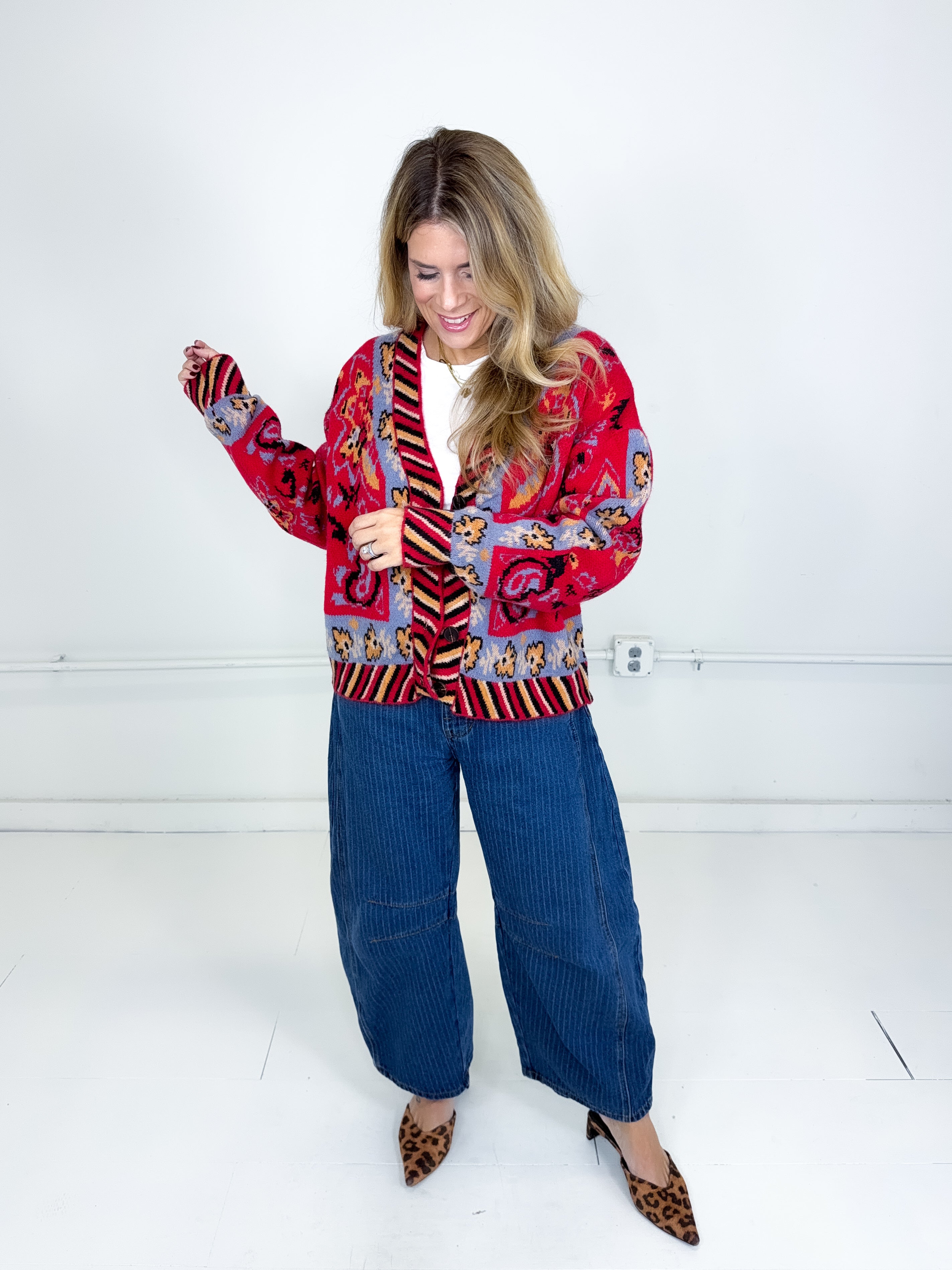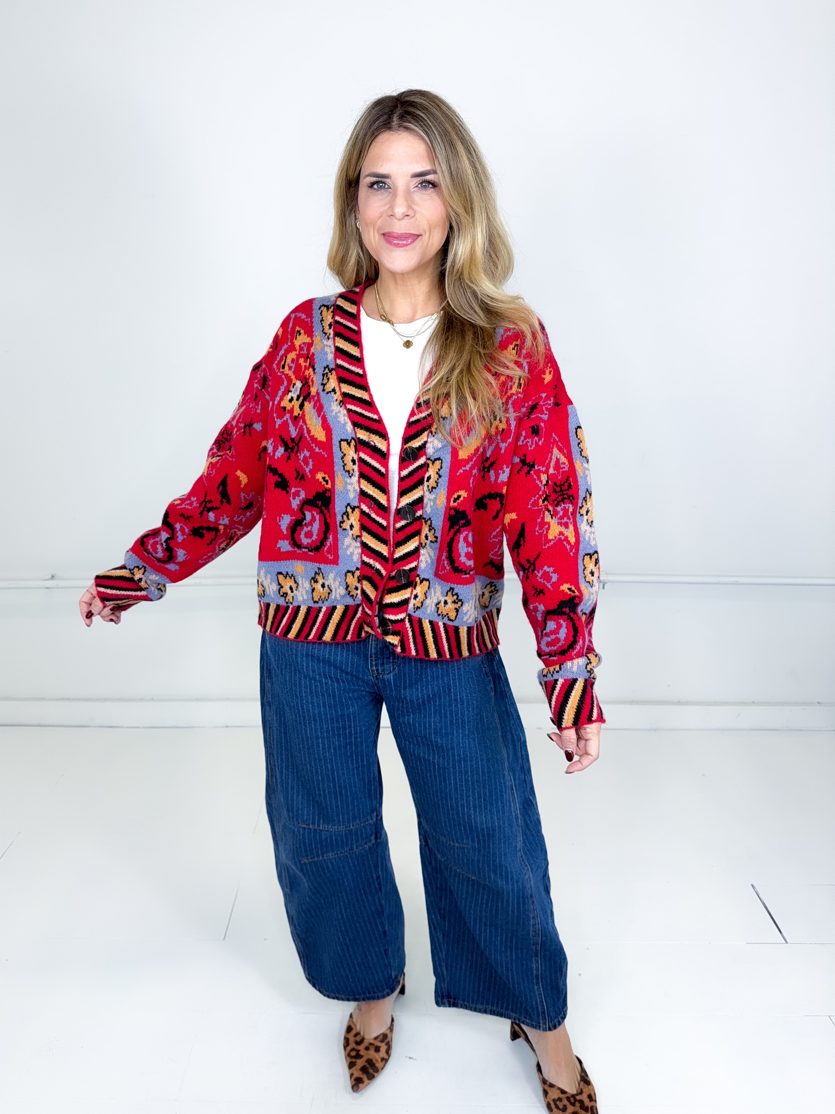 The Winslet Cardigan is such a sweet top! This red paisley print knit cardigan features a v-neckline, button front, long drop sleeves and a boxy fit. Pairs well with everything from denim, flats, heels, dress pants, skirts and more! Fits true to size.